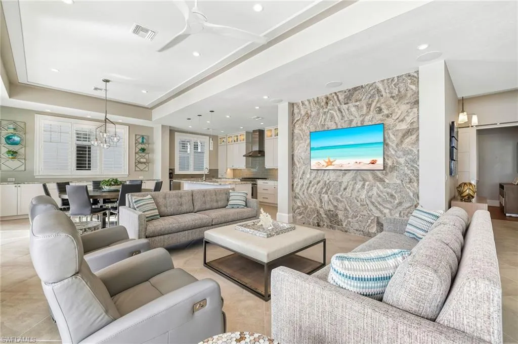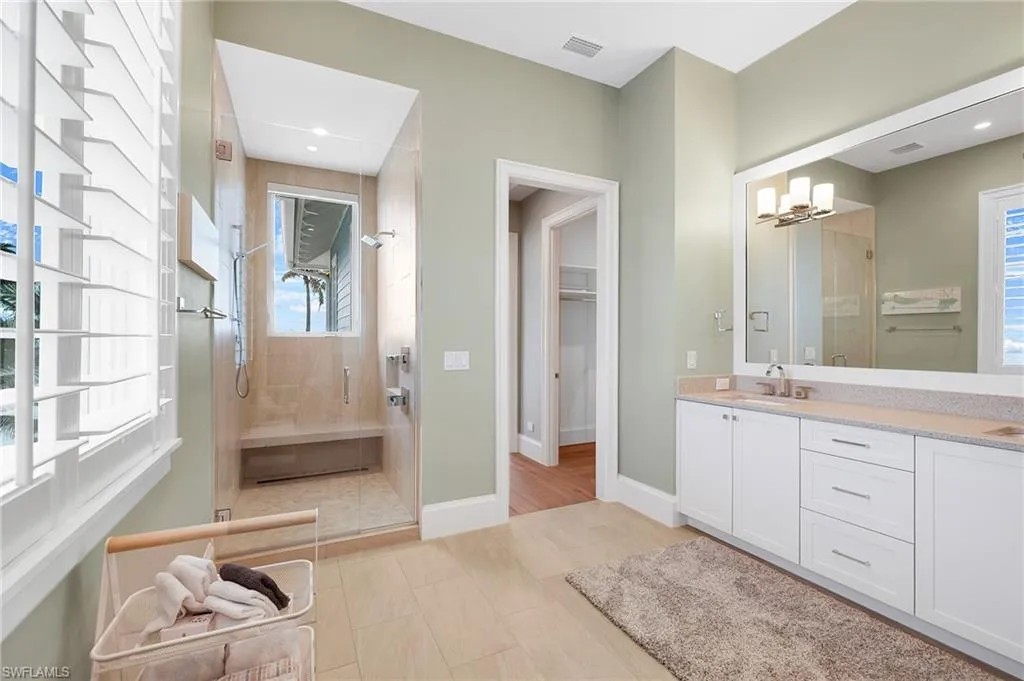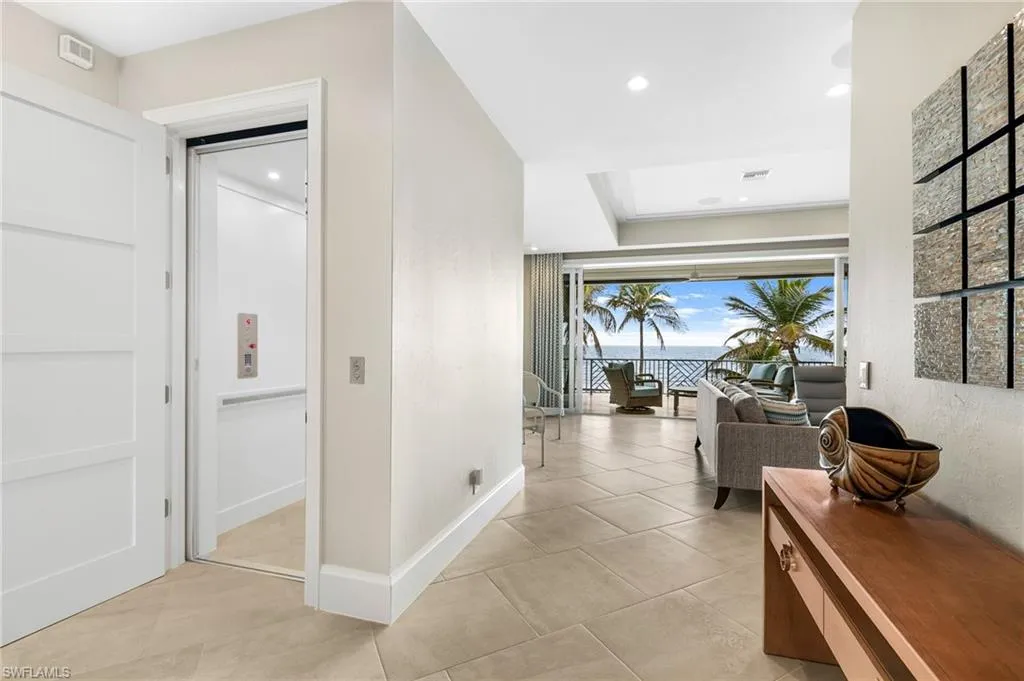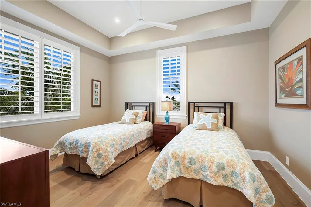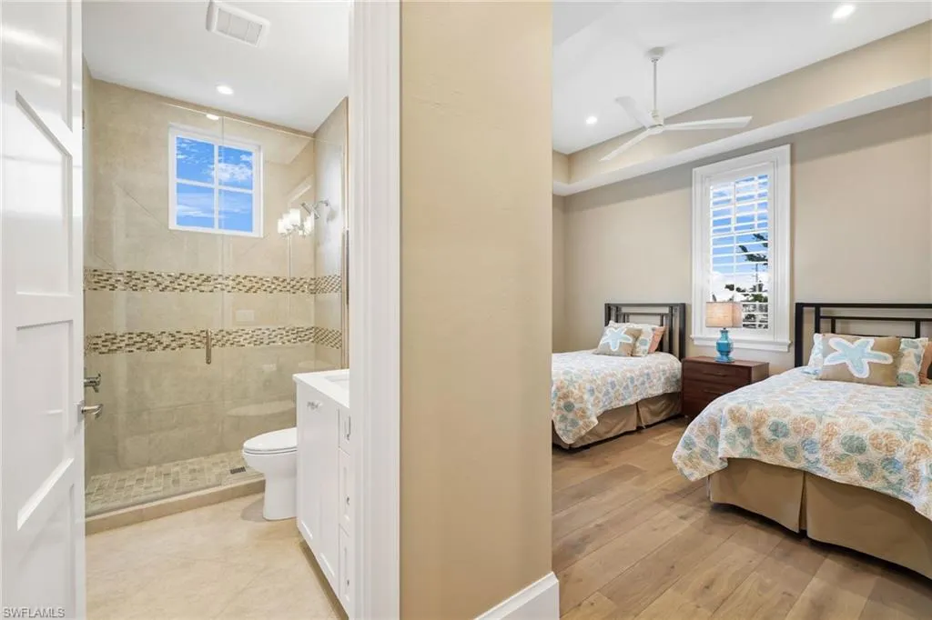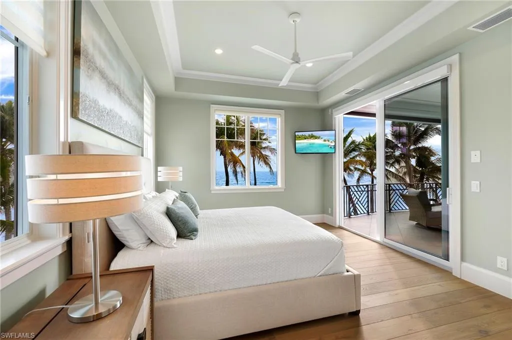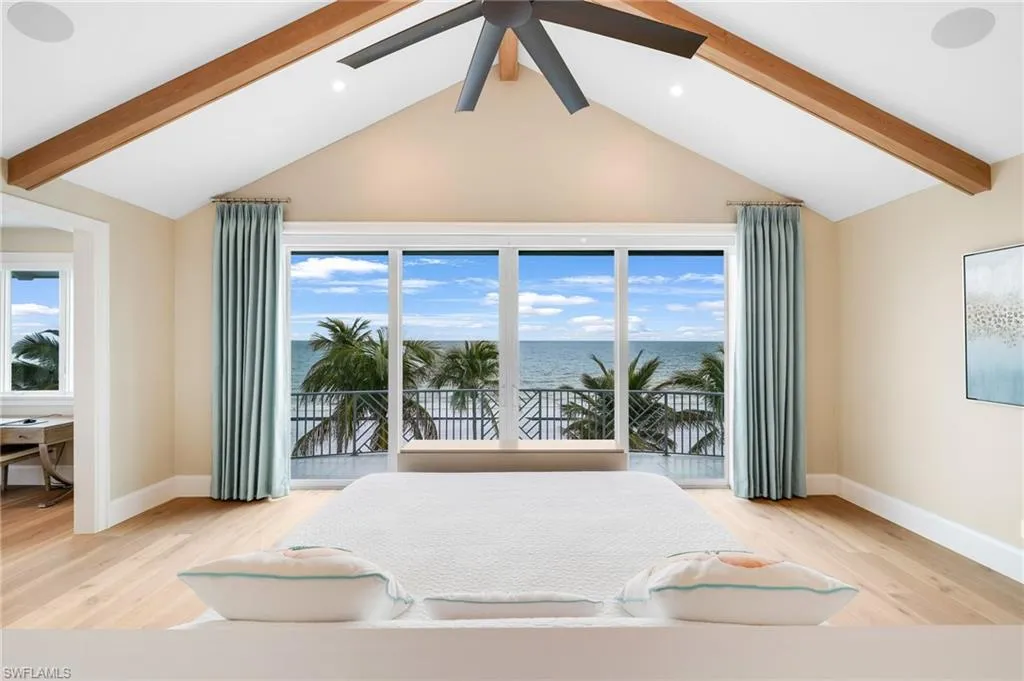 The top-floor master suite redefines luxury with sweeping views, a private sitting room, wet bar with fridge, custom dressing room, spa-inspired bath, and exclusive balcony access. Thoughtful details such as a recessed TV cabinet and a second laundry area enhance both comfort and convenience. The four guest rooms include a luxurious main-level VIP guest retreat with serene Gulf views. Each guest bedroom features its own en-suite bath, providing privacy and comfort for visiting family and friends.
