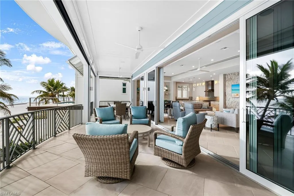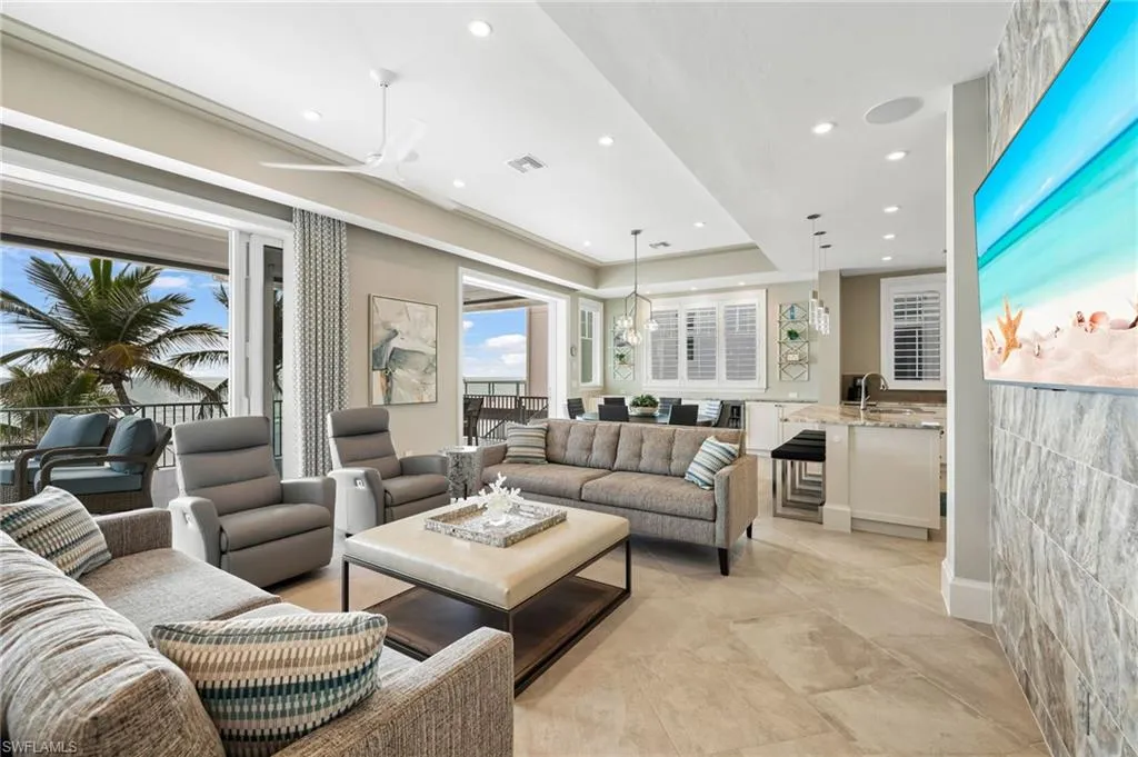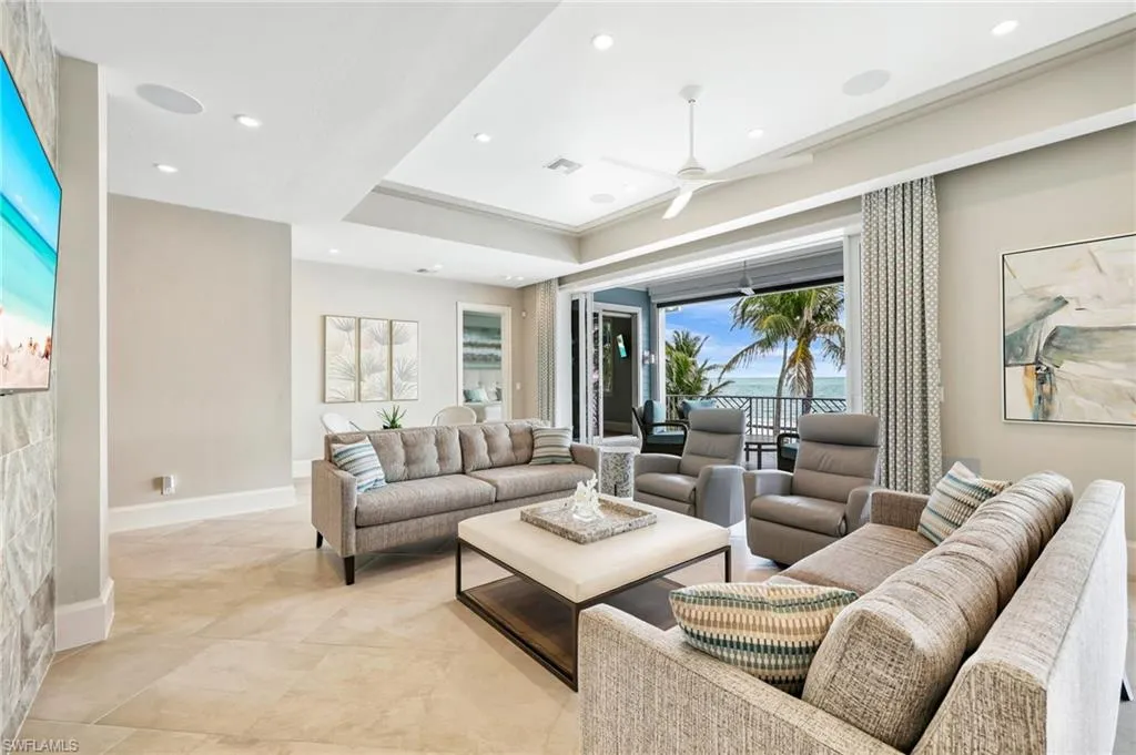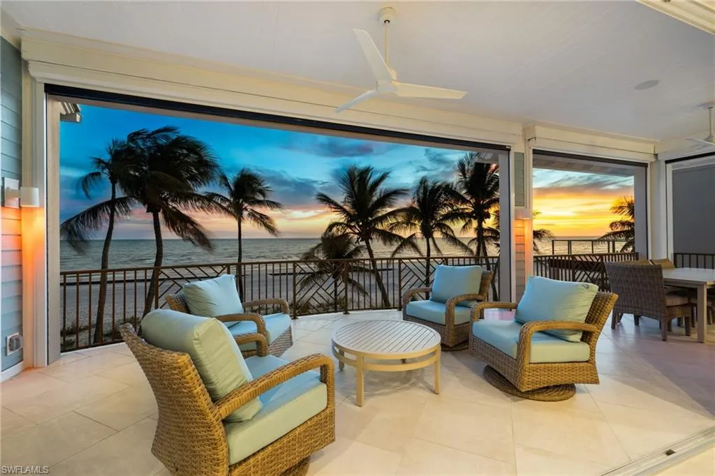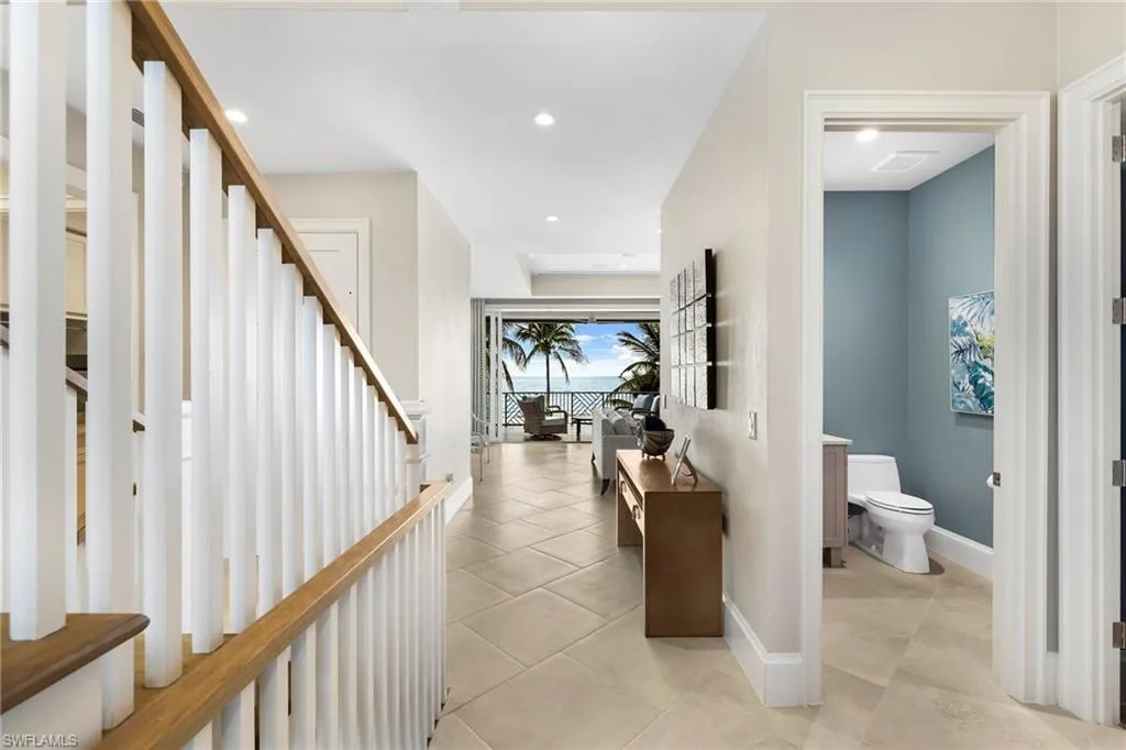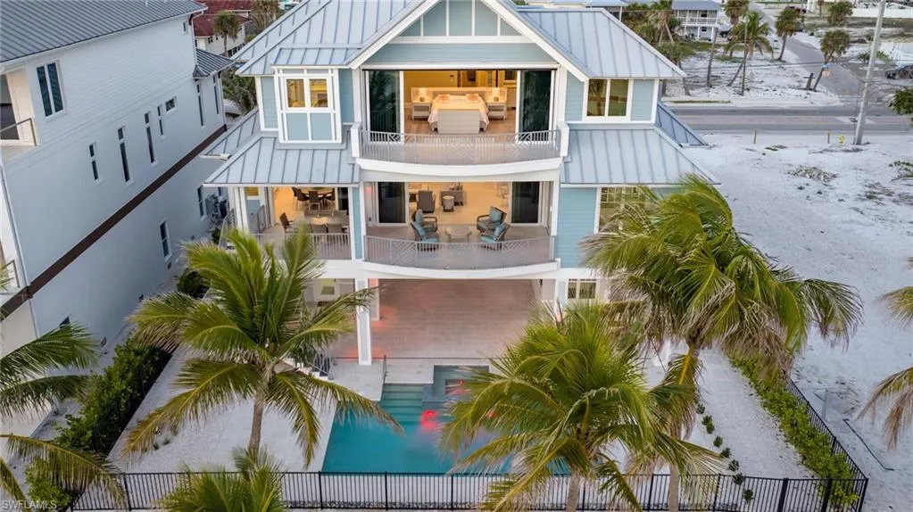 With five bedrooms, five and a half baths, plus a first-floor den, the home offers expansive open living spaces that blur the line between indoors and out. Multiple balconies frame the Gulf like living art, while the saltwater pool and spa create a private resort experience surrounded by swaying palms and endless shoreline.