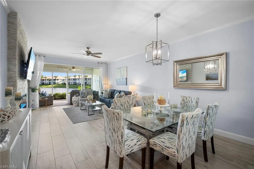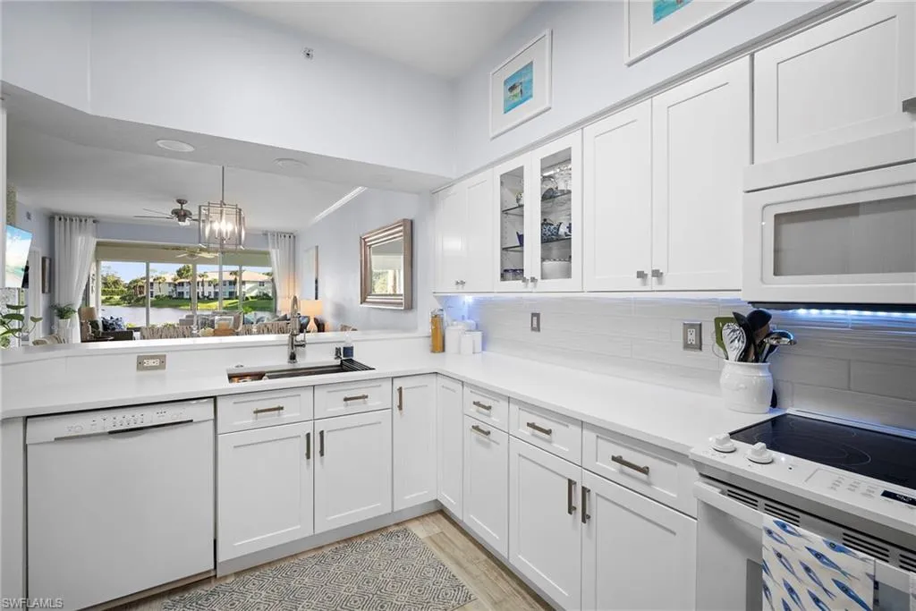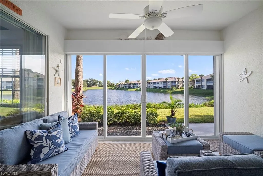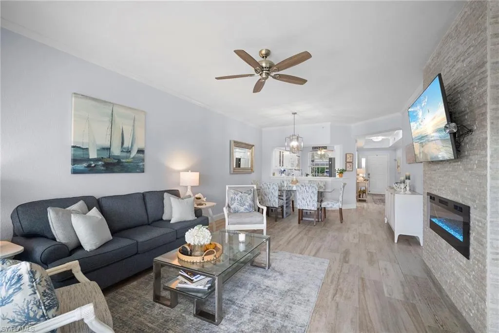 Welcome to 2275 Harmony Unit 103! This move-in ready, beautifully updated 2 bed/2 bath condo exudes relaxed coastal living! Step inside and walk into the elegantly appointed kitchen with soft touch close shaker cabinets and custom pantry. Quartz countertops, subway tile backsplash, large stainless steel farmhouse sink and chrome pull-down faucet complete this stunning updated kitchen. Gorgeous wood plank porcelain tile flows throughout the entire unit, including lanai. The living area is spacious and with a formal dining area and stunning floor to ceiling tiled electric fireplace. The glass sliders in the lanai allows you to enjoy additional living as a 3 season room. Manual shutters have been addend on the lanai for additional peace of mind, security and protection from the elements. The master bedroom has 2 large walk-in closets and fully updated ensuite bathroom with tiled and frameless shower and dual sink vanity. The second bedroom also has been updated and has a large closet for storage, and a dual entry bathroom. Freshly painted throughout with all new light fixtures and ceiling fans, this unit is truly a showstopper! The best part is that it’s located in Stonebridge Country Club, this gorgeous condo is FULLY BUNDLED GOLF WITH OWNERSHIP! NO WAIT LIST! The Kip Schulties golf course redesign was completed in 2023. Stonebridge’s golf course is renowned for its stunning vistas with colorful flower beds and pristine native areas. Stonebridge Country Club also includes tennis, resort style pool, fitness center and several dining options including the new bistro bar. Ideally located in west of I-75 in North Naples, Stonebridge has easy access to downtown Naples, Mercato, airports, restaurants, shopping, and is just three miles from the pristine beaches of the Gulf. Amenity rich country club lifestyle in the the heart of North Naples. Schedule your private showing today!