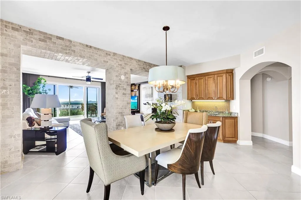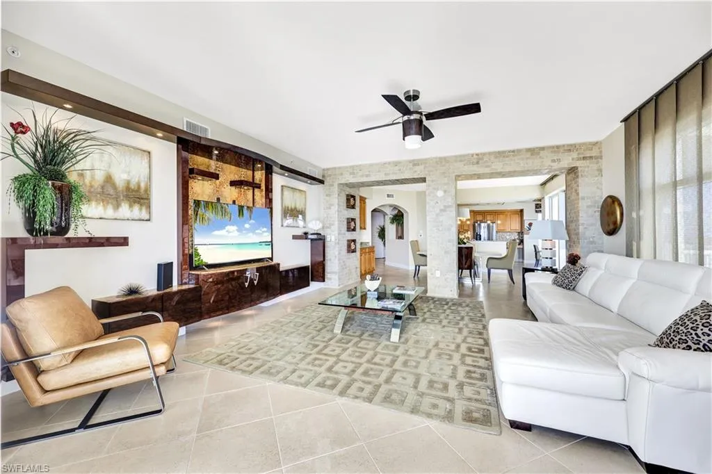 This exquisite sixth floor end unit in Tarpon Landings at Tarpon Point Marina offers the perfect blend of resort-style elegance and everyday comfort. With over 3,000 sq ft of living space, this 3-bedroom + den, 3.5-bath condo boasts uninterrupted panoramic water views from nearly every room. Step off your private elevator into a secure, double-door entry foyer that opens to a sprawling open-concept layout with refined finishes and thoughtful upgrades throughout. The custom burl wood entertainment center, brick-accented dining room wall, and cork-floored den create a warm, inviting ambiance.