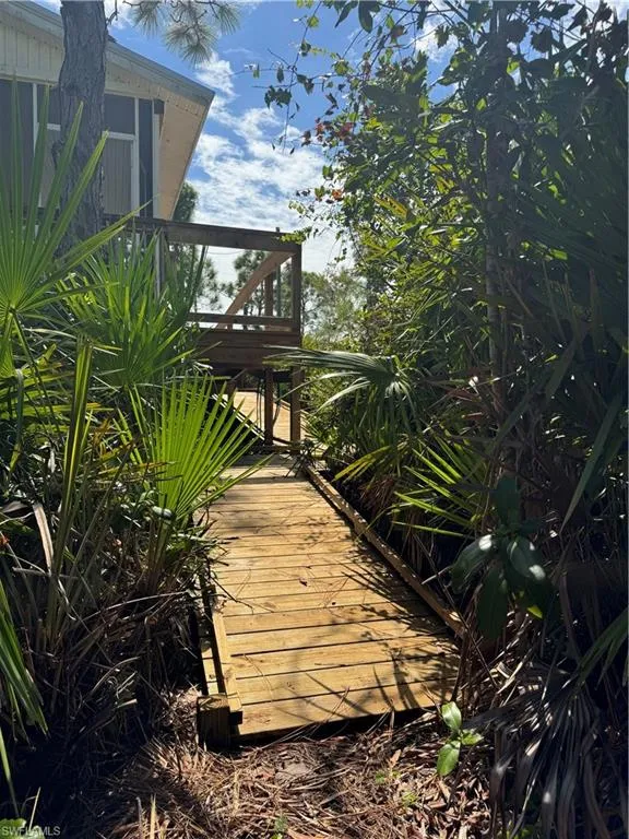 Welcome to Stillpoint, a one-of-a-kind retreat on a quiet half-acre in Bokeelia. Nestled along a sandy, gravel road, this home feels like a treehouse surrounded by lush vegetation, offering both privacy and a strong connection to nature. The one-bedroom layout is complemented by a versatile loft—ideal for an art studio, meditation area, or a home office, and spacious enough to be converted into an additional bedroom. Screened porch on the west side and open on the east side frames stunning sunrises and sunsets, with the west side also featuring a convenient wheelchair ramp. Modern sustainability meets comfort with solar panels, a covered pergola for parking, and an electric car charger. Located in an X500 zone at the highest point on the island, flood insurance is not required. Just minutes away, you’ll find marinas, restaurants, and access to the beautiful islands around Pine Island—perfect for boating, dining, and exploring the coast. Peaceful and secluded, Stillpoint is more than a home—it’s a place to create, unwind, and live in harmony with the landscape.