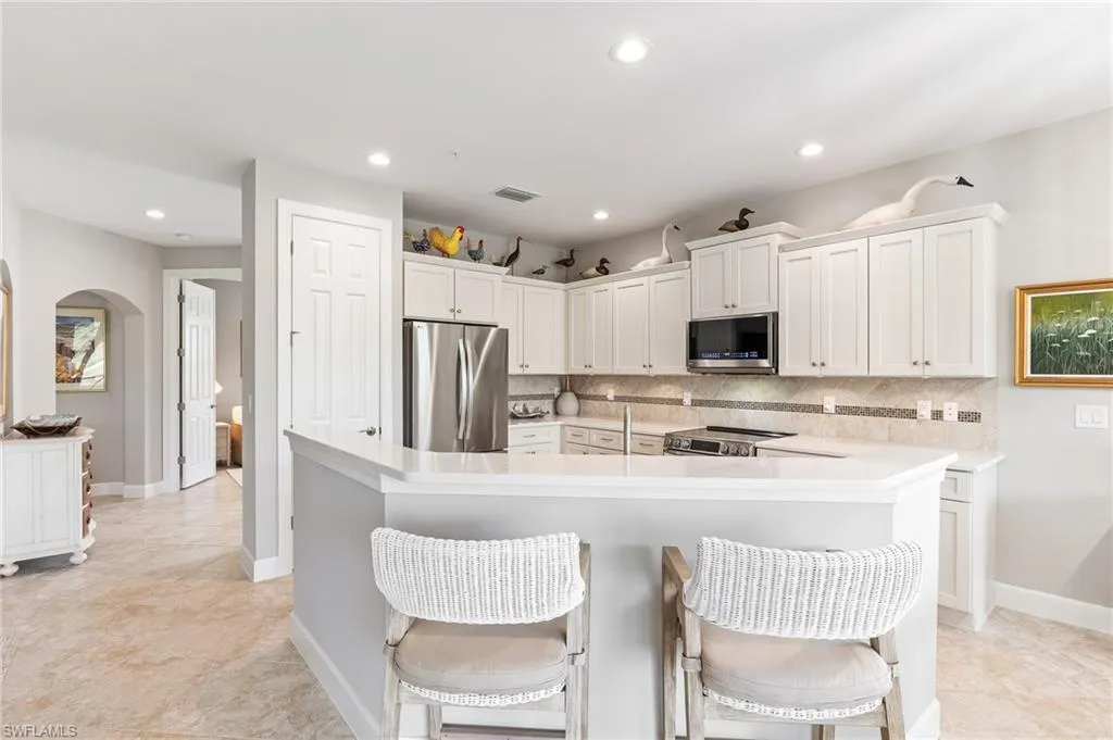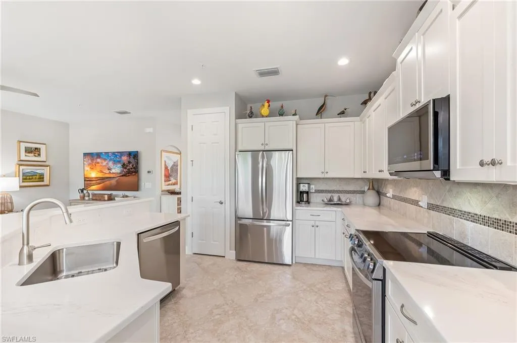 Step inside to an open-concept layout with soaring 10-foot ceilings, 8-foot doors, and tile laid on the diagonal, creating an expansive and luminous ambiance. The gourmet kitchen is a chef’s delight, showcasing new quartz countertops, a contemporary deep single stainless sink with a new Moen faucet, elegant cream wood cabinetry, an entertainment bar, and a tile backsplash, complete with a suite of new LG stainless steel appliances (stove, refrigerator, microwave, and dishwasher), plus a new garbage disposal. Enjoy seamless indoor-outdoor living with two sets of hurricane storm protection sliding glass doors leading to a screened lanai, perfect for enjoying the serene water and fairway views.