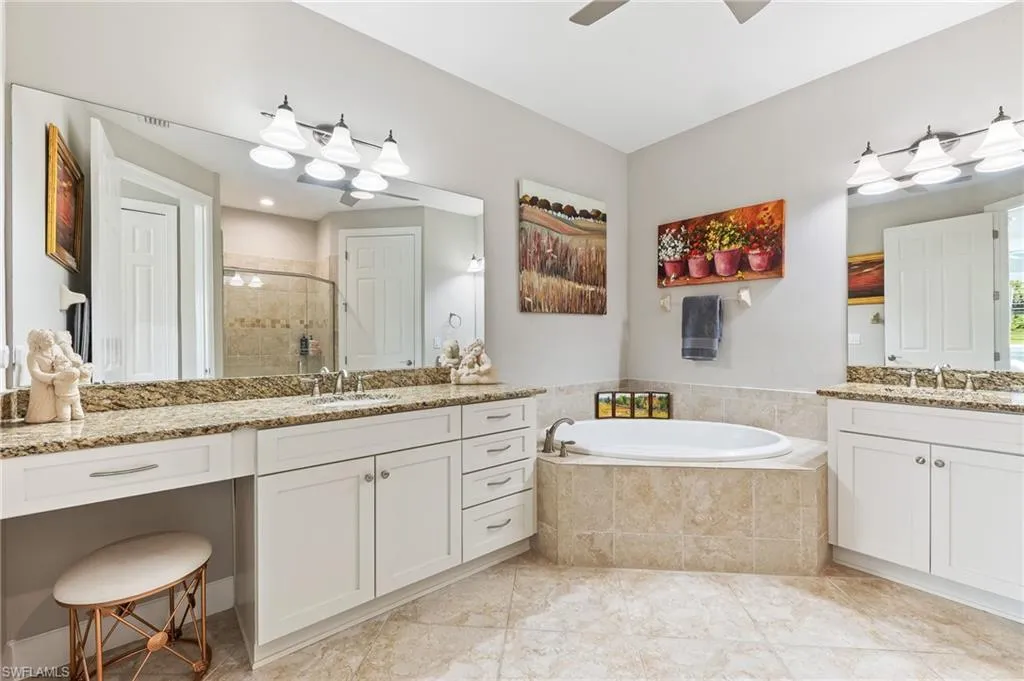 The primary suite offers a private sanctuary with a large walk-in closet featuring designer wooden shelving, dual vanities, an oversized soaking tub, and a separate glass-enclosed shower.
