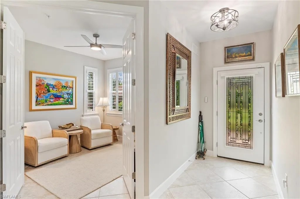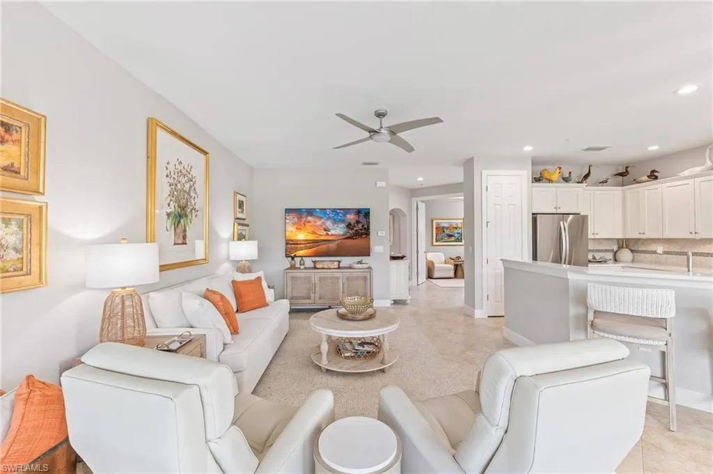 Discover unparalleled luxury in this meticulously updated, first-floor carriage home, boasting breathtaking lake and golf course views from one of Fort Myers’ most desirable gated communities. This residence is move-in ready and features two bedrooms, two bathrooms, and a versatile den with a Murphy bed, all enhanced by a comprehensive array of high-end upgrades.