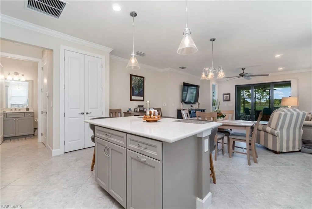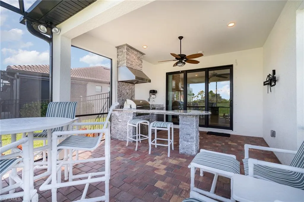 Beautiful, better than new construction, Pulte Ellenwood Villa in River Hall Country Club. This highly upgraded model has hurricane impact windows and an 8′ impact resistant entry door so there is no need to ever put up shutters. River Hall Country Club is an 18-hole Davis Love III designed bundled golf community. Rolling Rock neighborhood is the most sought-after street as they have weekly golf, bocce ball and pickleball leagues for Rolling Rockers. Plus, they have an annual golf tournament complete with a pre-tournament team party at the Bunker Bar. If you are interested in belonging on a street where everyone knows your name and there are daily activities this is the Villa for you! You can unwind on your lanai overlooking the 18th hole with a NE exposure. The extended lanai has a full outdoor kitchen with plenty of seating to entertain your friends when they visit. The Ellenwood floor plan offers a split floor plan includes 2 spacious bedrooms, a versatile den, 2 bathrooms with tiled showers, and a 2-car garage with epoxy finish. Of the many upgrades there is crown molding in the living areas, upgraded tile flooring, and 8′ solid interior doors. The kitchen features upgraded quartz countertops, upgraded solid wood cabinets with crown molding, upgraded stainless steel appliances, and a tile backsplash. In the spacious owner’s retreat, you will find a large walk-in closet, dual sinks, large, tiled shower. Enjoy the total peace of mind that comes with owning a new construction home that has already been updated to include all the after-build features you would expect. Living in River Hall Country Club means embracing a bundled golf and resort lifestyle which features the Caloosa Grille Clubhouse with the golf shop. The community also offers a resort-style heated swimming pool at the Bunker Bar (Tiki Bar) a short walk from this Villa. The Town Hall Amenity Center features Bocce courts, Har-Tru tennis courts, Pickleball courts, and an Activities Director who ensures there’s always something exciting happening. There is a fully equipped fitness center available extended hours with key card to make your exercising fit your busy lifestyle. This home is a perfect choice for those seeking a blend of luxury, comfort, and a very active lifestyle at a price that is affordable compared to other nearby communities. Vibrant downtown Fort Myers is a short distance with great entertainment and dining options. Publix Grocery store and Rooster’s Farmers market are within 1 mile of the River Hall entrance. Flood Insurance is not required on Rolling Rock Blvd., which leads to peace of mind as you enjoy your new relaxed lifestyle. Give me a call to schedule your personal tour of River Hall and all this Villa has to offer.