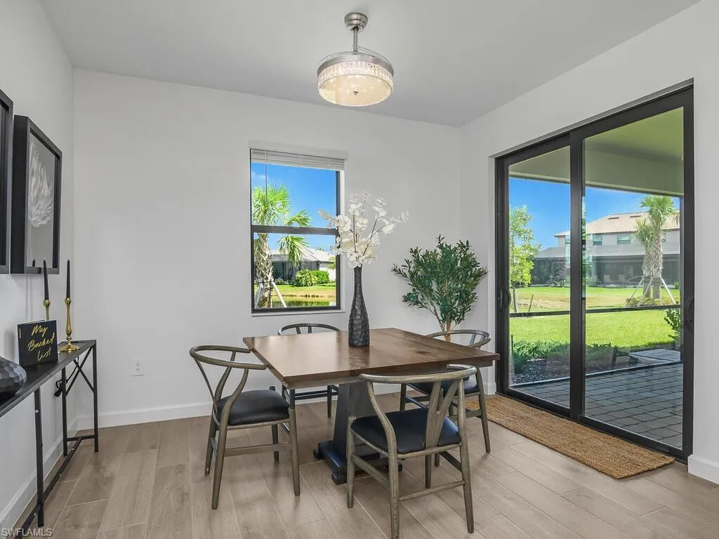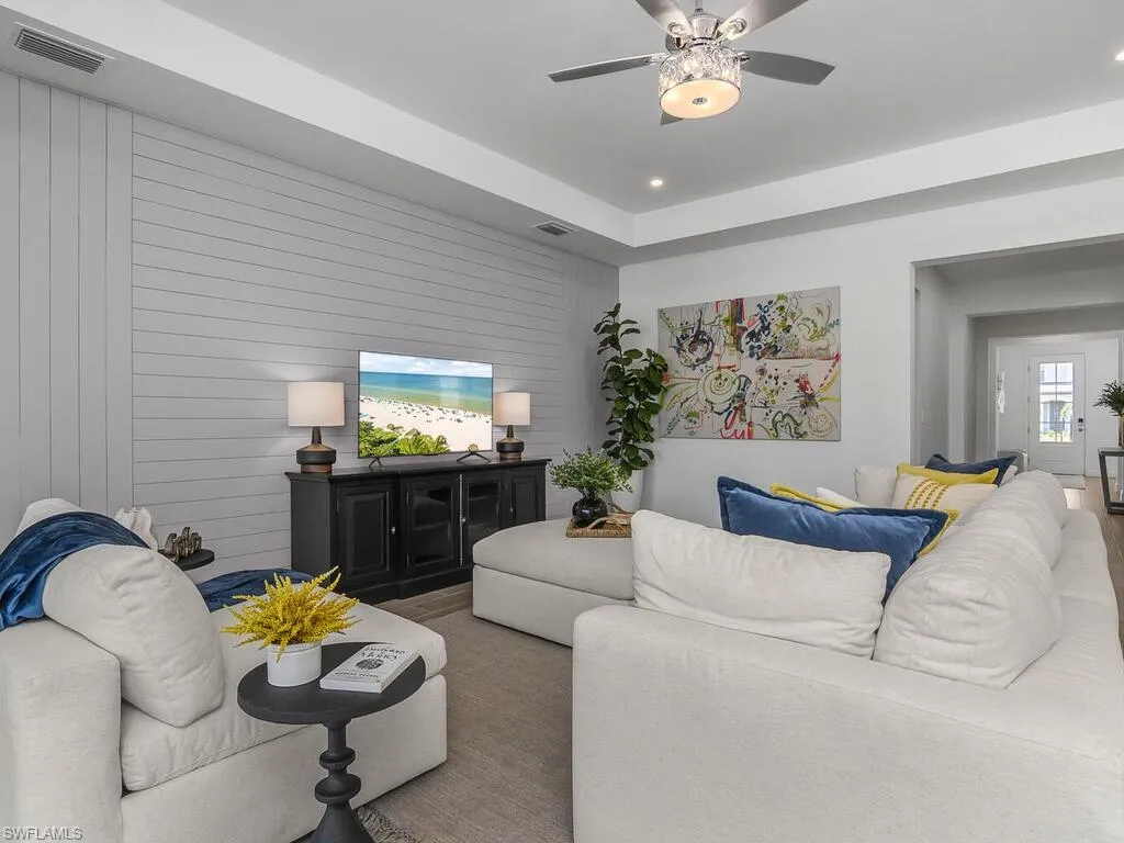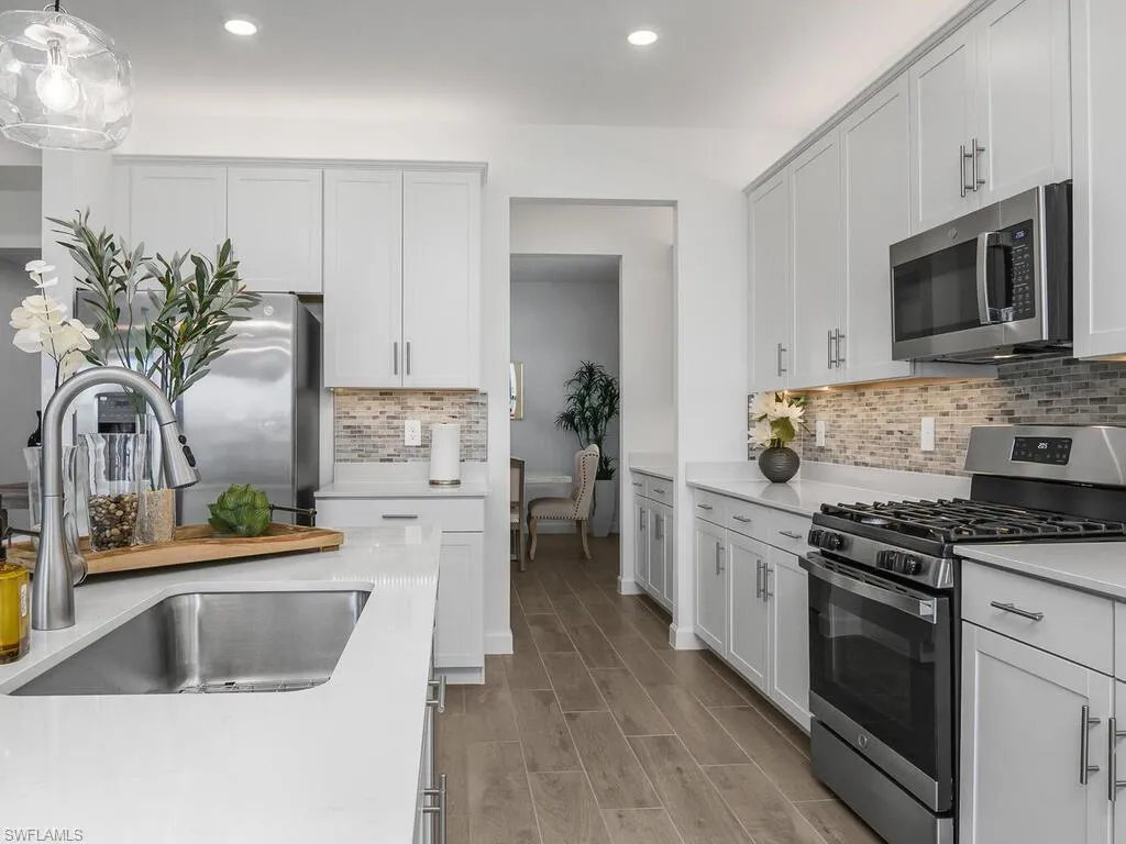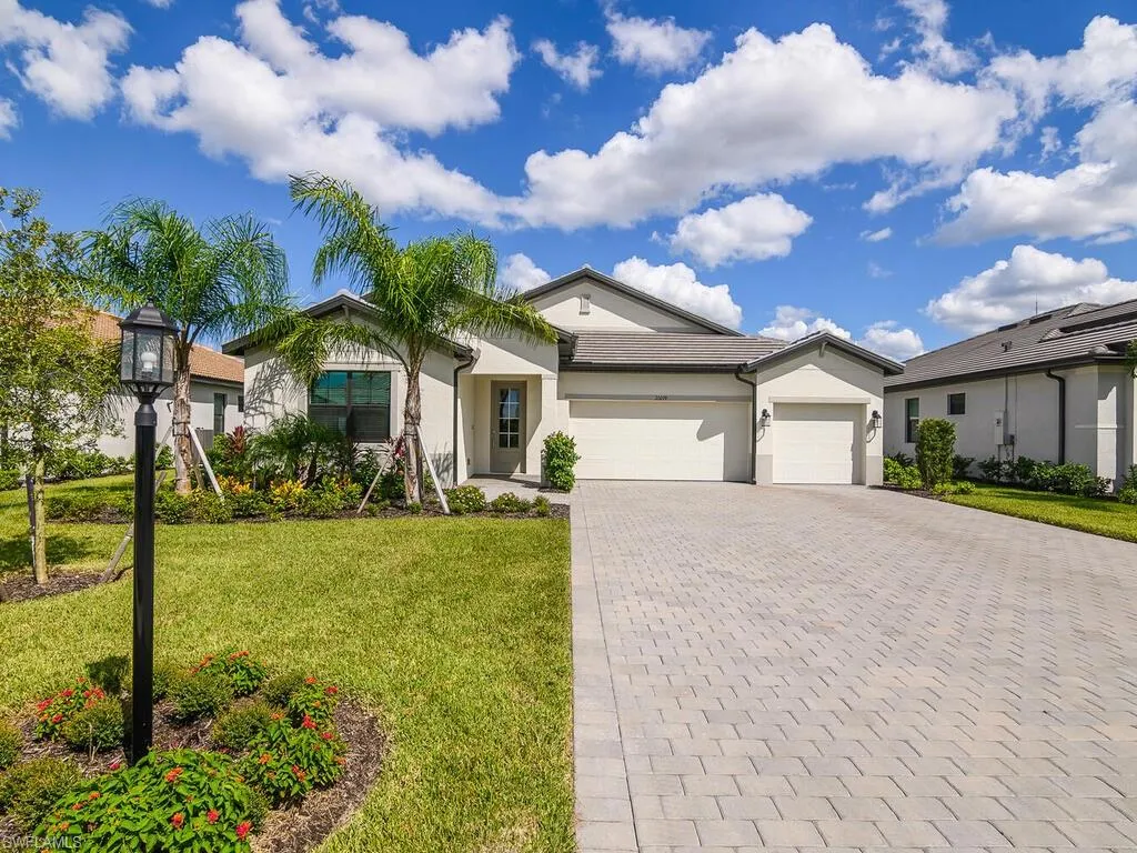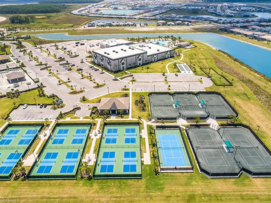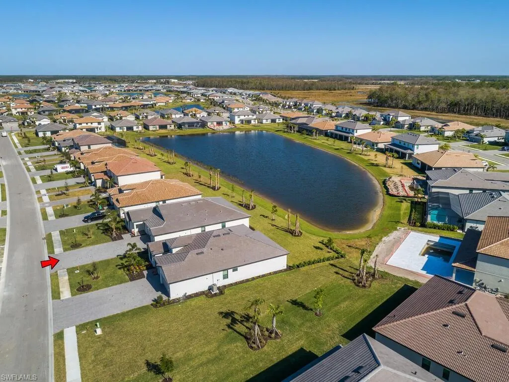 STUNNING, Brand NEW water view home offering 4 beds plus den, 3 baths, and 3 car garage! Enjoy the SWFL lifestyle in this FABULOUS Richmond Floorplan featuring over 2700 sq ft of thoughtfully designed living space. You’ll LOVE entertaining with this open floor plan… Enjoy the chef’s kitchen with quartz countertops, plenty of cabinet space, over and under cabinet custom lighting, an oversized island, a custom tile backsplash, a walk-in pantry with built-in shelving, and a beverage service area/butler’s pantry. Relax with guests in the open kitchen/dining/great room perfectly accented with a feature wall, additional recessed lighting, and designer lighting/ceiling fan fixtures. The owner suite is spacious and includes additional recessed lighting and a large spa-like bath with separate his/her vanities, a walk-in shower, and a oversized walk-through closet with custom shelving built-ins. You’ll love the convenience of the owner closet with its access to the laundry room, which has also been outfitted with additional cabinetry for plenty of storage. Guests will love their own private space with one guest bedroom having it’s own dedicated bath, and two additional guest bedrooms sharing a jack and jill bathroom. The entryway is wide and spacious, very inviting for guests, and the drop zone near the garage included added cabinetry for additional storage. You’ll love the lifestyle at Verdana Village with its indoor sports facilities including pickleball, tennis, basketball, and a state-of-the-art fitness center, along with an outdoor resort style pool which makes every day feel like a vacation. Relax and enjoy all that Southwest Florida has to offer in a NO FLOOD ZONE home that is still a short drive to shopping, dining, the BEACH, and international airport.