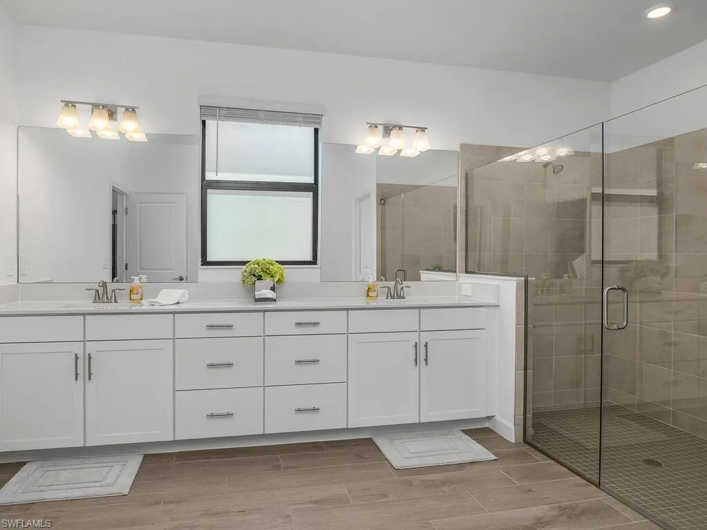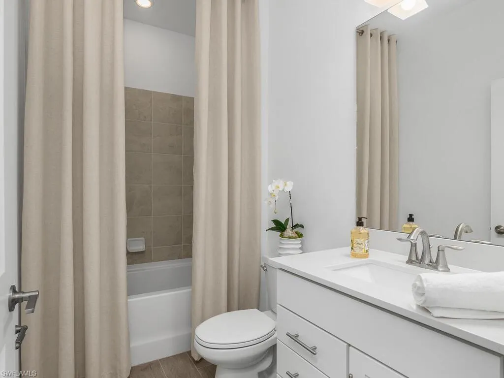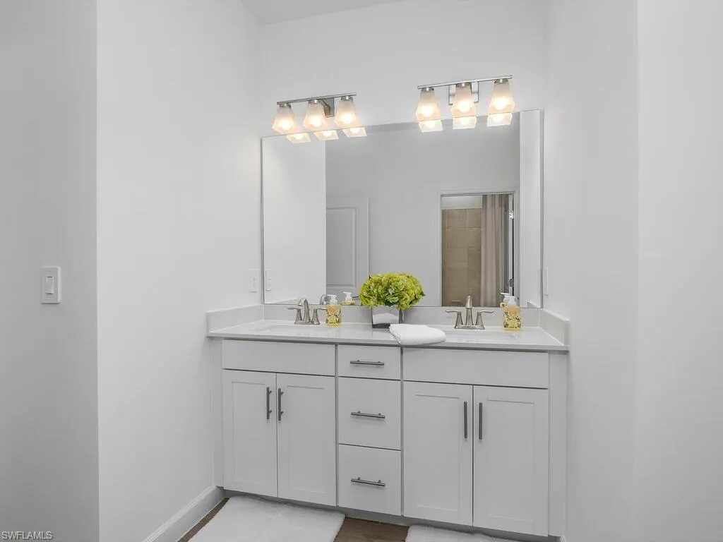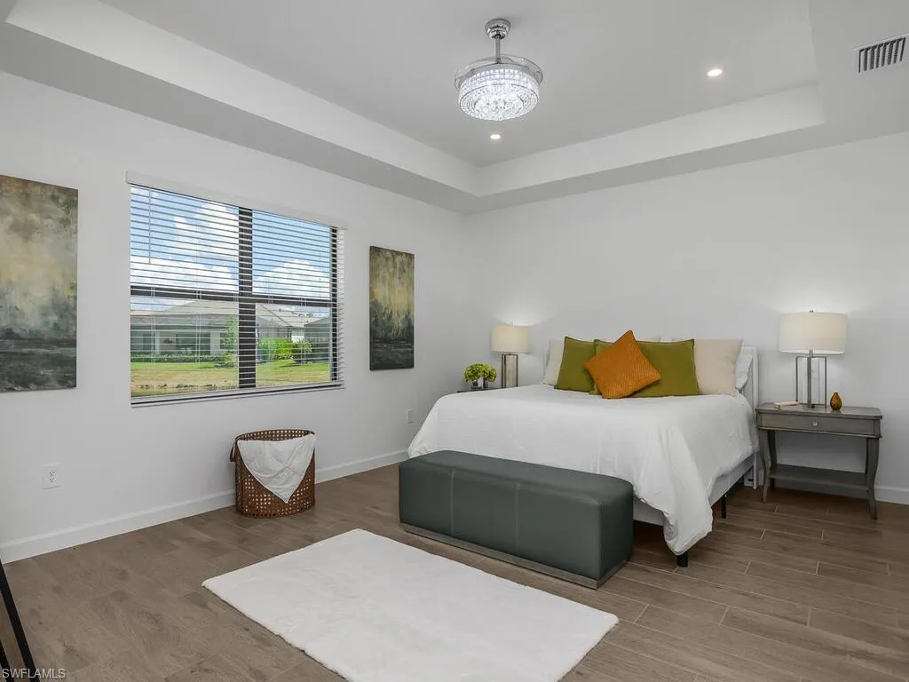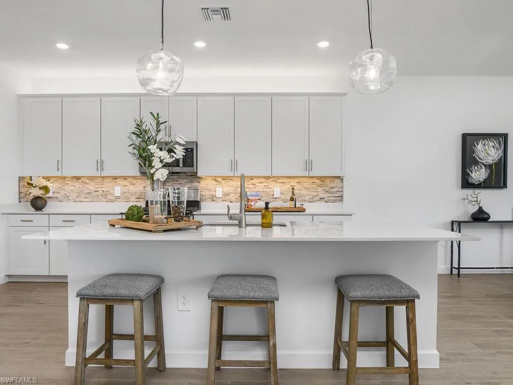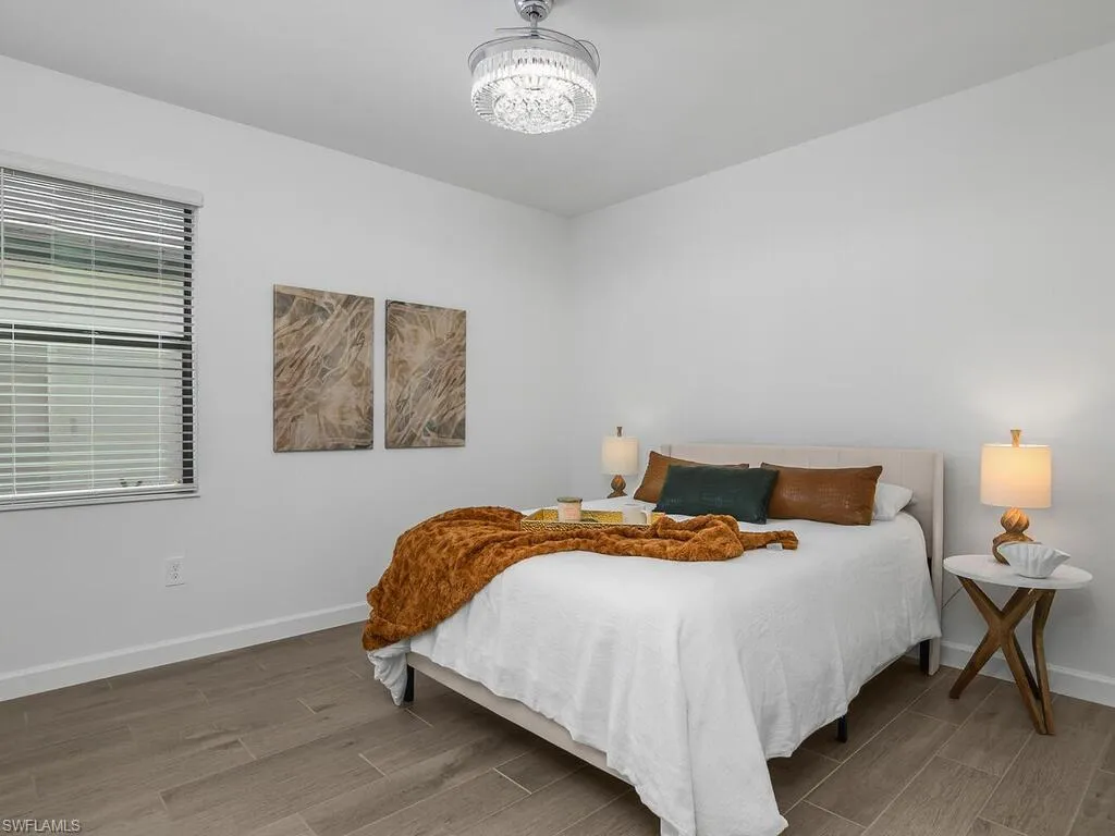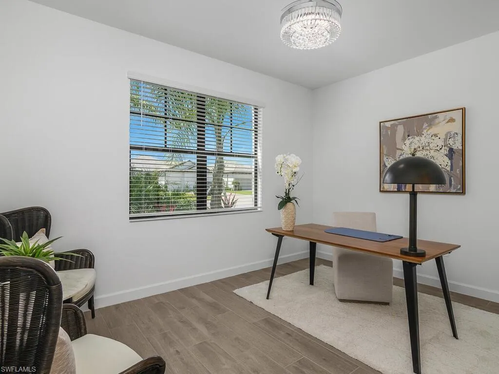 STUNNING, Brand NEW water view home offering 4 beds plus den, 3 baths, and 3 car garage! Enjoy the SWFL lifestyle in this FABULOUS Richmond Floorplan featuring over 2700 sq ft of thoughtfully designed living space. You’ll LOVE entertaining with this open floor plan… Enjoy the chef’s kitchen with quartz countertops, plenty of cabinet space, over and under cabinet custom lighting, an oversized island, a custom tile backsplash, a walk-in pantry with built-in shelving, and a beverage service area/butler’s pantry. Relax with guests in the open kitchen/dining/great room perfectly accented with a feature wall, additional recessed lighting, and designer lighting/ceiling fan fixtures. The owner suite is spacious and includes additional recessed lighting and a large spa-like bath with separate his/her vanities, a walk-in shower, and a oversized walk-through closet with custom shelving built-ins. You’ll love the convenience of the owner closet with its access to the laundry room, which has also been outfitted with additional cabinetry for plenty of storage. Guests will love their own private space with one guest bedroom having it’s own dedicated bath, and two additional guest bedrooms sharing a jack and jill bathroom. The entryway is wide and spacious, very inviting for guests, and the drop zone near the garage included added cabinetry for additional storage. You’ll love the lifestyle at Verdana Village with its indoor sports facilities including pickleball, tennis, basketball, and a state-of-the-art fitness center, along with an outdoor resort style pool which makes every day feel like a vacation. Relax and enjoy all that Southwest Florida has to offer in a NO FLOOD ZONE home that is still a short drive to shopping, dining, the BEACH, and international airport.