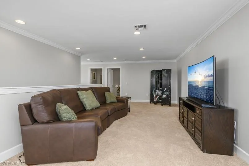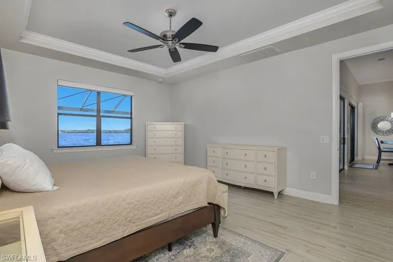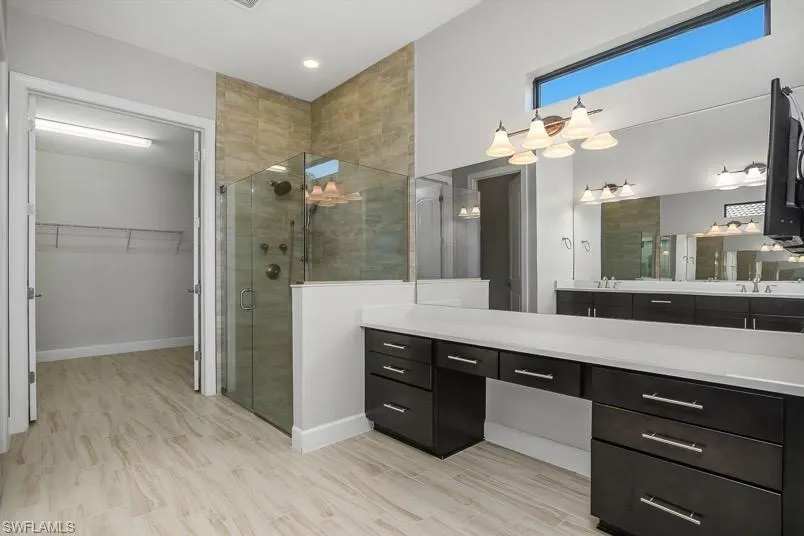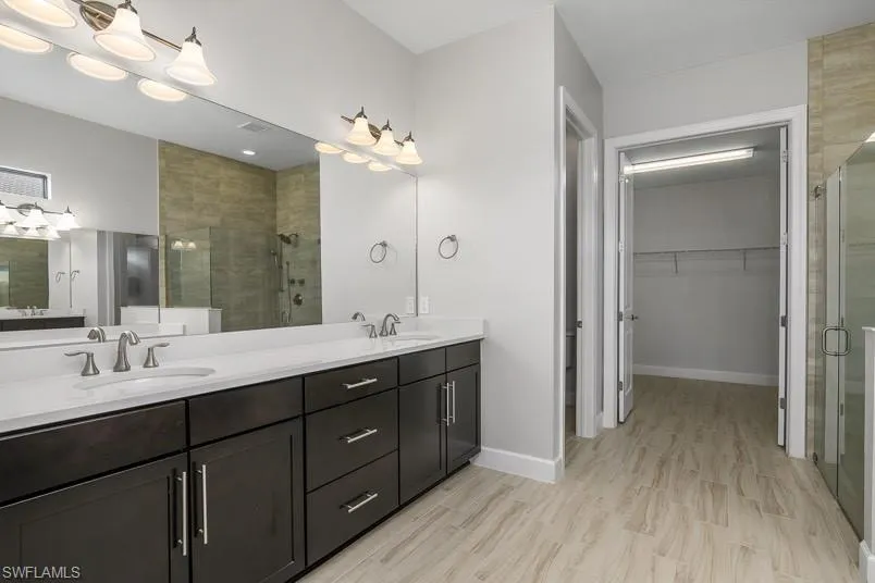 The primary suite overlooks the lake and includes a spa-style en-suite bath with dual vanities, walk-in shower, and a generous walk-in closet. Each additional bedroom has its own adjacent bathroom, offering comfort and privacy for family or guests. Upstairs, a spacious loft adds even more flexibility with a wet bar, cabinetry, wine chiller, and an extra walk-in closet—perfect as a media room, guest suite, or entertainment space.