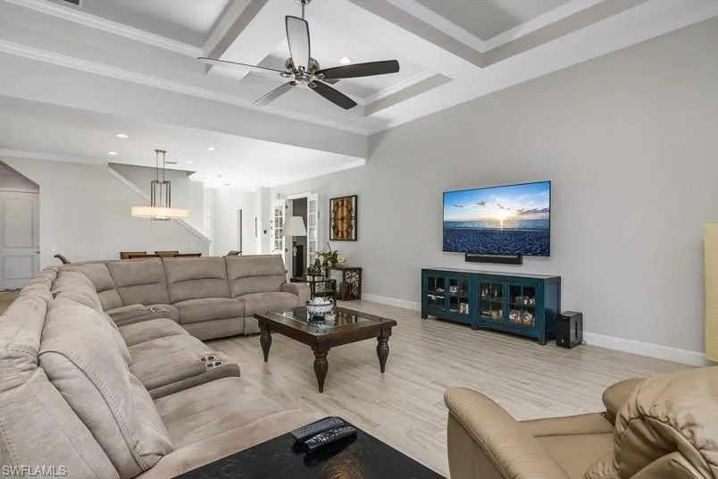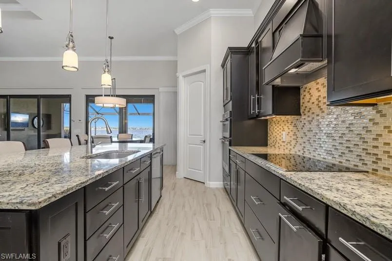 Step inside to an open-concept layout filled with natural light and upscale details. The spacious living area features tray ceilings, crown molding, and built-in Sonos speakers, creating an elegant yet inviting atmosphere. Tile flooring was fully refinished in September, offering a crisp, move-in-ready feel. The kitchen boasts granite countertops, stainless steel appliances, Kichler 2700k under-cabinet lighting, and a walk-in pantry. Perfect for entertaining or everyday living, this kitchen seamlessly flows into the main living space and out to the lanai.