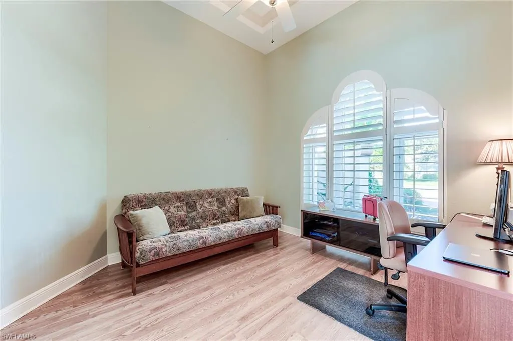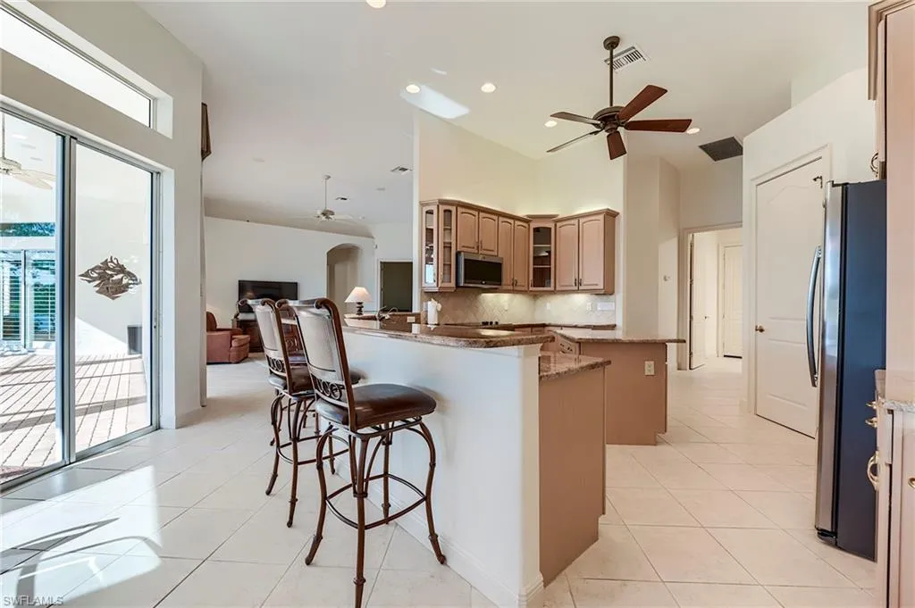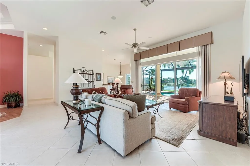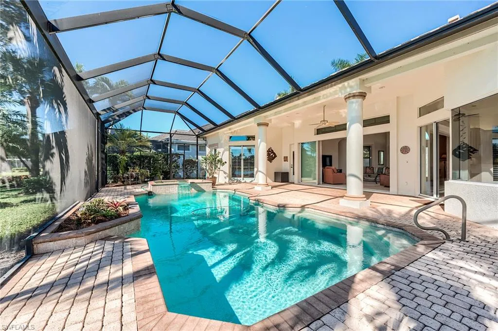 Harbourside Custom home located in the very popular Summerfield neighborhood in Shadow Wood. Full Golf Membership available to be purchased from Shadow Wood Country Club upon closing on this home. Skip the waitlist and head directly to the t-box. Ideal location for walking or biking to the Shadow Wood Clubhouse or the Commons Club. Fabulous great room floor plan features 3 bedrooms ensuite, 1/2 bath with access to the lanai, den and 2 car garage. Pocketing sliders open from the great room to the lanai with beautiful, picturesque views of the lake through the picture screen window. Relax or dine around the gas heated resort style saltwater pool and spa. Custom triple tray ceiling in dining room and coffered ceiling in the den. Kitchen complete with custom cabinetry, granite countertops, center island, eat-in-bar, morning room and walk in pantry. Split floor plan offers privacy for both guest and primary suites. New flat tile roof in 2022, 2023 AC unit in primary, 2019 hot water heater and kitchen appliances. Solar panels for pool heat and plantation shutters throughout. Shadow Wood Country Club has 54 holes of golf, social/dining, tennis and bocce. The new lifestyle Amenity Center is under construction and will include 2 resort style pools, a kid’s pool, restaurant and bar, 6 indoor pickleball courts, racquet pro shop and grab and go cage. The Commons Club membership offers access to the private beach club, fitness center and spa, pickleball, social activities, private restaurant, playground, and lap pool. Great location close to airport, shopping, restaurants, beaches and health care. Add your special touches and features to this amazing home. Give me a call for your private tour today.