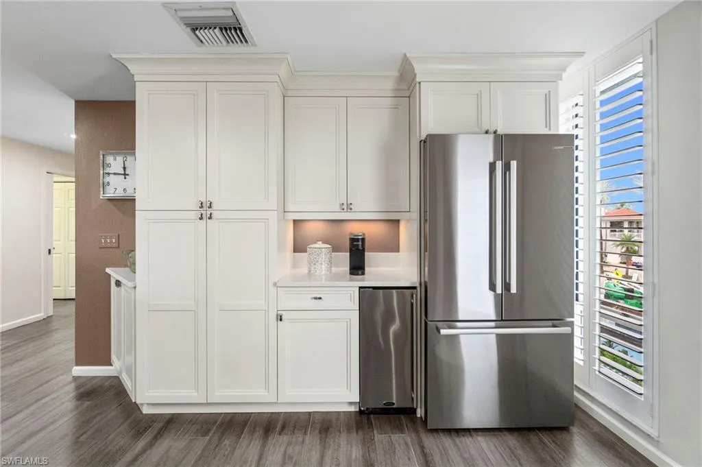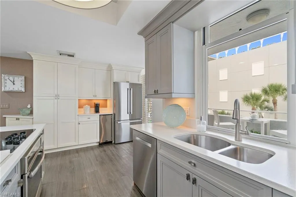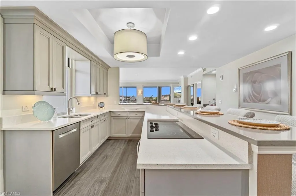 Experience luxury coastal living in this rarely available Le Dauphin end unit condo, offering sweeping panoramic views of Vanderbilt Bay and exclusive deeded beach access just steps away. Beautifully renovated and meticulously maintained, this spacious 3-bedroom, 2.5-bathroom residence spans 2,245 square feet and is filled with natural light, thanks to floor-to-ceiling windows and an open-concept layout designed to capture the beauty of the surrounding landscape. This residence features three private outdoor terraces, each offering distinctly different views — from breathtaking sunrises over the bay to peaceful evenings by the Gulf. The gourmet kitchen is a showpiece, equipped with stainless steel appliances, quartz countertops, designer finishes, and bar-top seating for six, perfect for both casual dining and entertaining. Elegant ceramic tile runs throughout the main living areas, while the primary bedroom is a tranquil retreat with plush carpeting, a large walk-in closet, and a spacious ensuite bathroom featuring a frameless glass shower and dual vanities. Le Dauphin is a boutique waterfront community offering exceptional amenities, including a private heated pool overlooking the bay, tennis courts, boat slips, an outdoor kitchen and dining area, and a fully renovated lobby. Residents also enjoy secure indoor garage parking and additional air-conditioned storage space. For peace of mind, the building has received a satisfactory structural milestone inspection, certified through the year 2034. Located adjacent to the prestigious LaPlaya Beach and Golf Resort, this home is within walking distance to upscale waterfront dining at Baleen and The Turtle Club, and just minutes from the shops, restaurants, and nightlife of Mercato. This is a rare opportunity to own a luxurious coastal residence in one of North Naples’ most desirable and prestigious neighborhoods — ideal as a full-time home or a refined seasonal getaway.