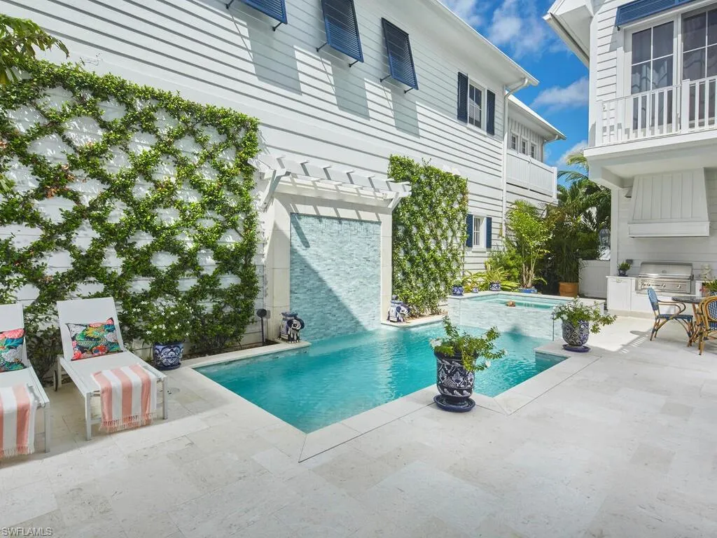 In the heart of Olde Naples, this refined residence marries timeless architecture with resort-caliber ease. An elegant foyer opens to sunlit living and dining spaces finished in shell-stone travertine, flowing to a chef’s kitchen with custom cabinetry, luxury appliances, premium finishes, and a wet bar made for effortless hosting. A family room spans the courtyard, blurring indoors and out. Upstairs, a serene primary suite and two gracious guest suites—each with lofty ceilings and tailored millwork—are joined by a flexible den/office and a well-placed laundry. Beyond, a walled courtyard becomes a private sanctuary with plunge pool, generous spa, espaliered greenery, outdoor speakers, and ample patio for dining under the Florida sky. Thoughtful comforts include an elevator, smart-home features, security system, and a spacious two-car garage with storage. Moments from Naples Bay, pristine beaches, and the boutiques and dining of downtown, this home offers the polished ease of luxury resort living—beautifully edited and impeccably executed.
