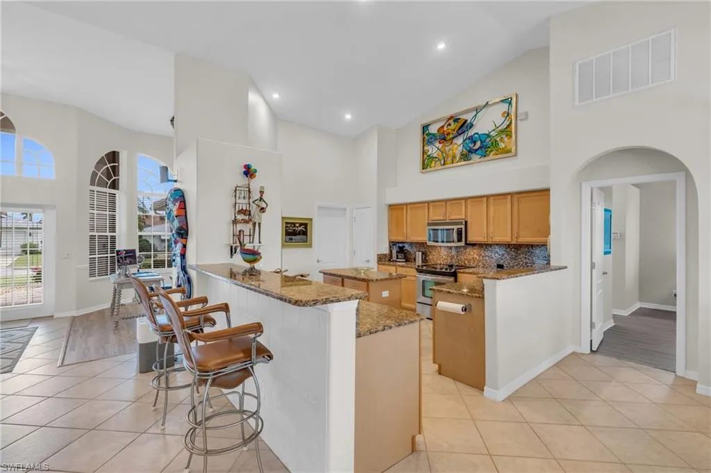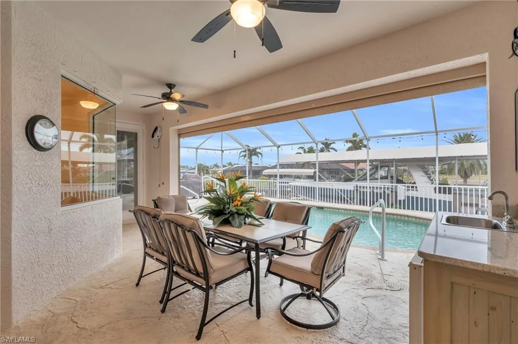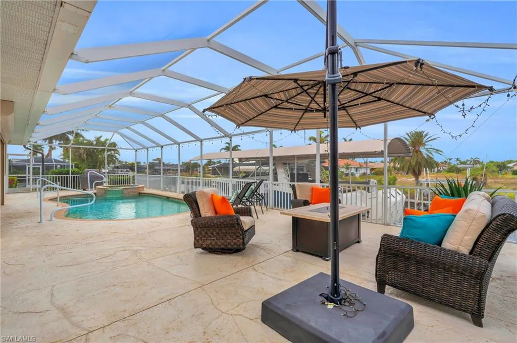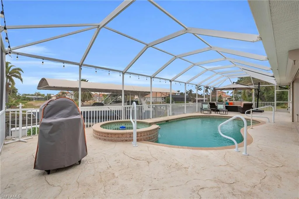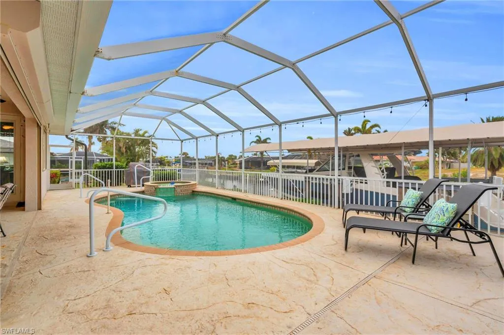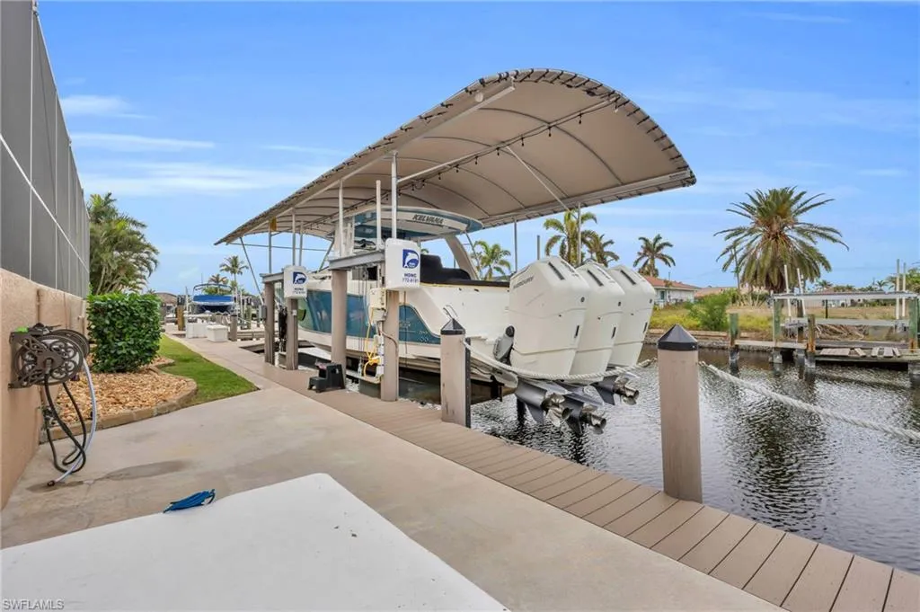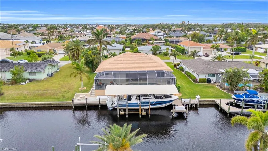 Welcome to your dream waterfront retreat! Located in one of Cape Coral’s most coveted neighborhoods near the prestigious Westin Resort, this pristine coastal home offers unparalleled access to Southwest Florida’s renowned waterways. Boaters will fall in love with the 40,000-pound boat lift, making it a breeze to be on the water in no time. Less than a five-minute boat ride to open Gulf waters, you’ll enjoy world-class fishing, island hopping, and sunset cruises right from your backyard. But the magic doesn’t stop there — dolphins and manatees are regular visitors in the canal, offering unforgettable experiences every day. This move-in ready home features 3 spacious bedrooms, including a luxurious owner’s suite with lanai access, a dedicated den/office space, and 2 beautifully updated bathrooms. The kitchen is a chef’s dream, boasting granite countertops, stainless steel appliances, and a reverse osmosis system for clean, fresh water. This property is worry free and has never sustained any water damage due to flooding or roof failure. Step outside and be greeted by a resort-style pool and spa, perfect for cooling off on warm Florida days. The outdoor kitchen and dining area make entertaining a breeze, with plenty of space to enjoy the Florida lifestyle with friends and family. Located just minutes from Cape Coral’s top dining, nightlife, and shopping, you’ll be close to Tarpon Point Marina’s upscale restaurants, local cafes, and vibrant entertainment venues. Whether you’re craving a five-star dinner on the waterfront or a lively night out, everything is within easy reach. This home comes fully furnished and ready to enjoy—just bring your boat and toothbrush! With stunning water views, wildlife sightings right from your backyard, and direct access to Gulf adventures, this home is truly one of a kind. Don’t miss your chance to own a slice of paradise in Cape Coral!