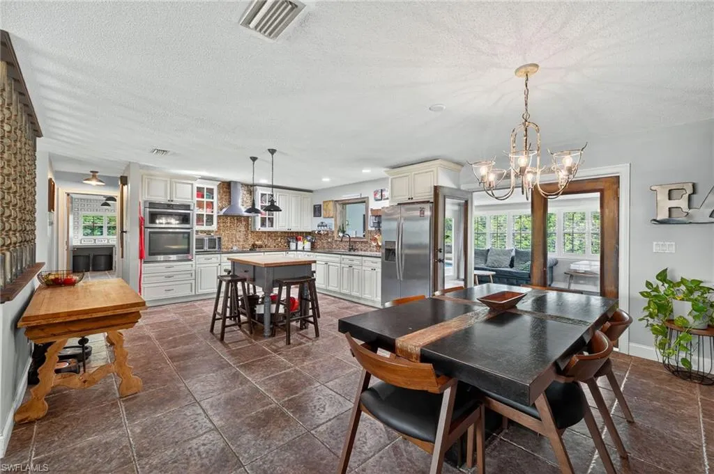 A stunning step-down formal living room showcases the home’s original wood columns, creating a timeless and elegant space. The family room offers seamless access to both the screened pool area and a separate rear patio, ideal for enjoying evening sunsets or outdoor gatherings.