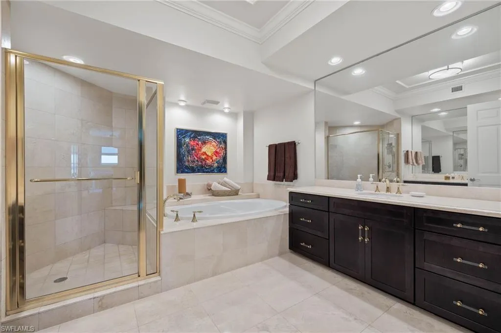 Fantastic opportunity to own one of the larger units in Grand Preserve and a transferable BEACH CLUB MEMBERSHIP! Gleaming hardwood floors greet you as you enter this popular ’04 stack with over 3,300 sq ft of meticulously maintained living space. Enjoy gorgeous views from the spacious primary bedroom with luxurious bathroom with new cabinetry. The gourmet kitchen features high end appliances, such as a SUB-ZERO refrigerator and natural gas stove top. Beautiful decor and custom drapery complete the generously sized guest suites. The convenient parking spaces are arguably the best in the building. Newer A/C completes this fabulous residence. The Dunes offers a true luxury lifestyle, with on-site dining, a resort-style pool and spa, poolside tiki bar, a tennis center, pro shop, and a fully equipped fitness center. This condominium has an available membership to FLORIDAN CLUB, which offers beach chairs, towel service, beachfront dining, swimming pool and guest accommodations, located on the white sands of Vanderbilt Beach with convenient shuttle service. The Dunes has everything you need for the Naples resort lifestyle!