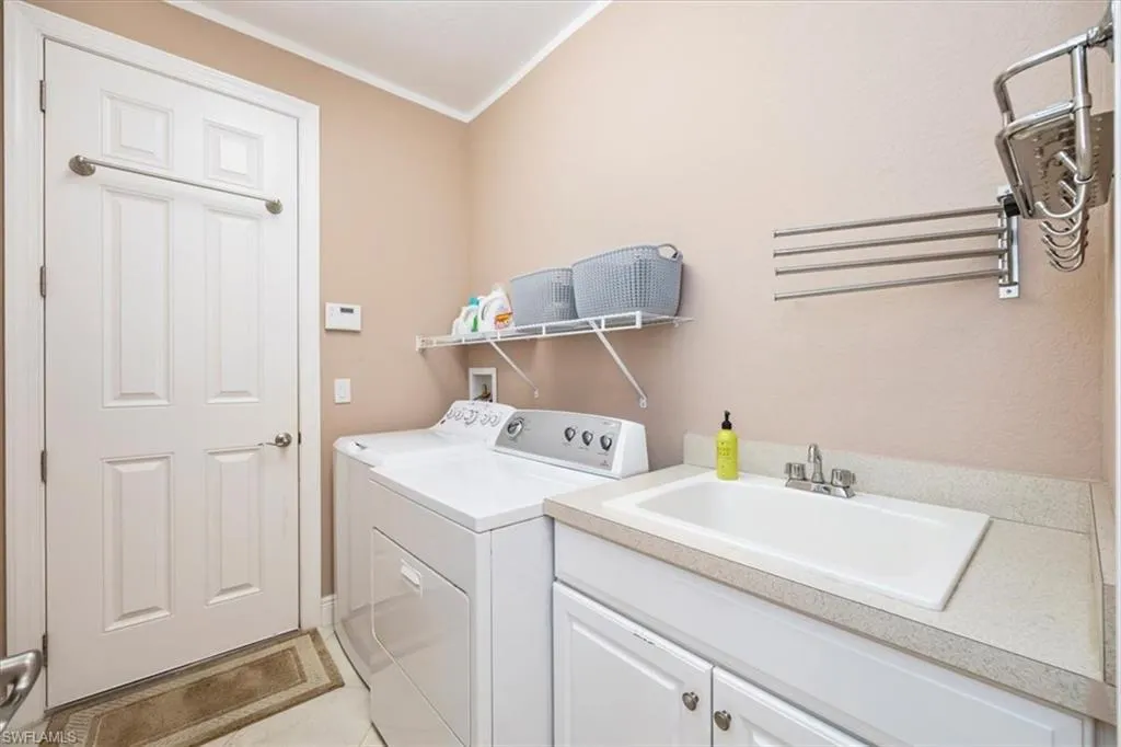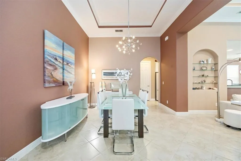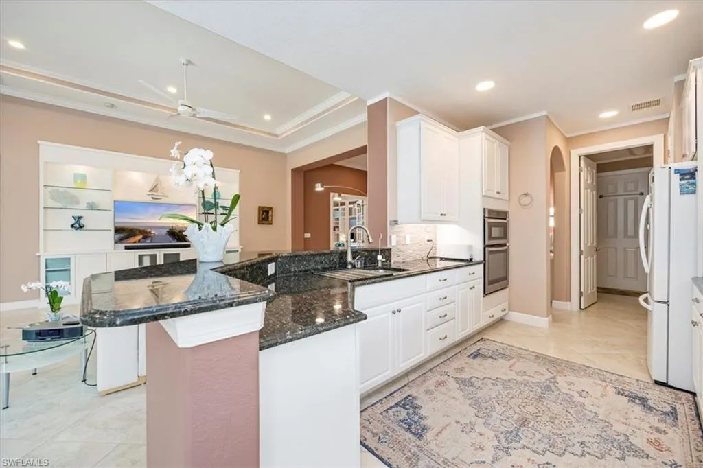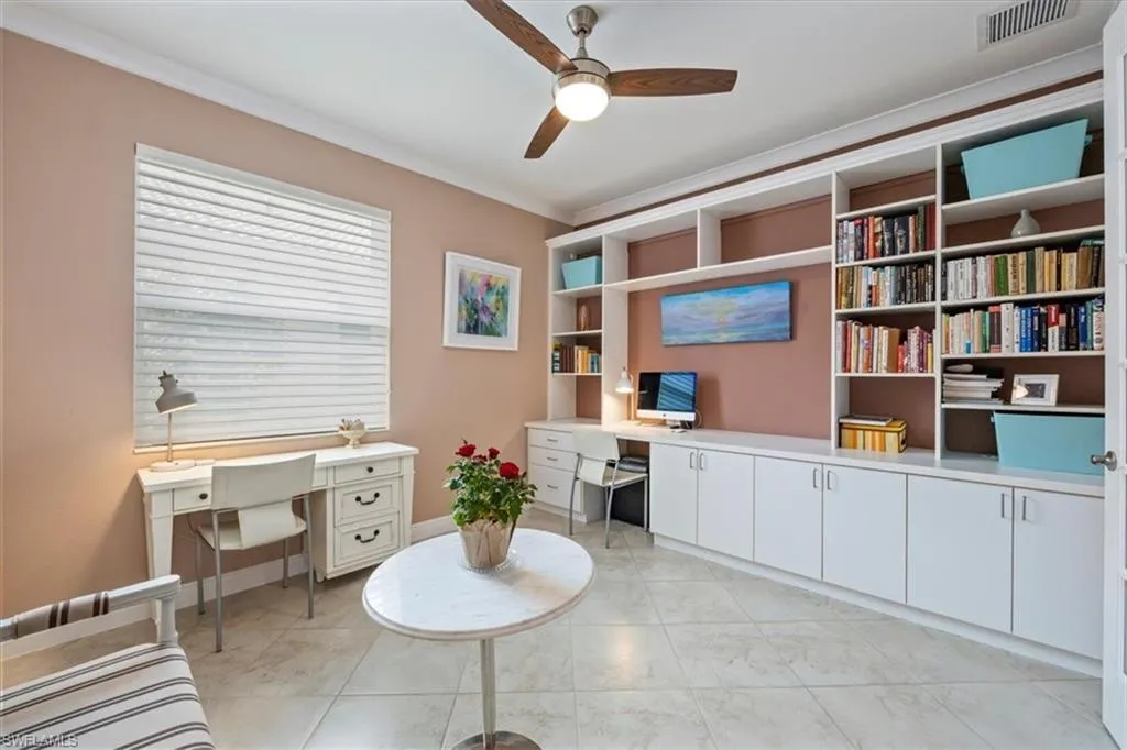 Meticulously maintained home in well-located gated single-family community. Move-In Ready! Spacious 2 bedroom + den home with formal dining, high ceilings featuring an incredible lanai and pool area surrounded by a lush tropical oasis. Foyer entry with marble insets, crown molding, upgraded LED lighting with dimmers including under cabinets. Custom built-ins in den and living room. Gracious master suite with pool access, electric shutters and dual closets. Features include: A/C 3 years old, Plantation shutters, pleated window shades, accordion shutters, impact front and garage doors, reverse osmosis system and all-house carbon system, NO CARPET, Husky cabinets in garage, saltwater pool with solar heat, ADT security included in community maintenance plus exterior cameras. Popular community just minutes to downtown Naples and the beautiful Gulf beaches!