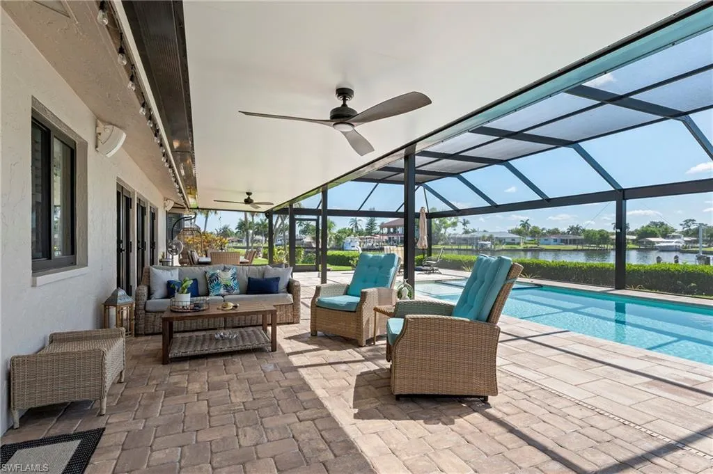 Welcome to your waterfront dream home, a property that epitomizes luxury and modern elegance. This completely remodeled home, with everything brand new, is perfectly designed for entertaining with its open floor plan and abundant natural light. Inside, you’ll discover exquisite custom woodwork and sleek 36×36″ tile floors throughout. The chef’s kitchen is a culinary dream, featuring quartz countertops with waterfall edges, 42″ cabinetry with pull-out drawers for added storage and convenience, and high-end stainless steel appliances. A dedicated bar area with a beverage cooler complements the space, making it ideal for hosting guests. The master bedroom serves as a serene sanctuary, bathed in natural light. Its en suite bathroom is reminiscent of a spa retreat, equipped with high-end fixtures and a spacious walk-in shower with a French drain. The outdoor area is a true oasis, boasting a massive pavered lanai with a remodeled pool and spa. The new lanai cage with picture windows provides breathtaking views of the deep canal, located just a few hundred feet from the Caloosahatchee River. Your private boat dock, complete with a 20,000 lb lift, ensures quick access to the open waters of the Gulf, offering a lifestyle of unparalleled leisure and adventure. This home truly stands out as something special, offering a unique lifestyle that few can enjoy.