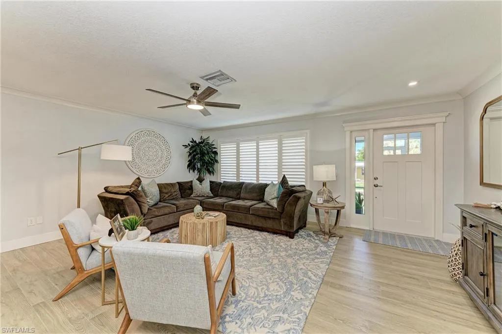 Enjoy living in Downtown Punta Gorda in this LIKE NEW 4 bedroom, 2 bathroom, 2 car garage home on Trabue, a charming historic street with bricked pavement, in the heart of downtown Punta Gorda, nearby to the Harborwalk, Fishermen’s Village & Marina, tennis and pickleball courts, great shopping, restaurants, weekly farmers markets, music festivals, marinas, parks, and more! This home has a NEW 2023 Metal roof, full hurricane protection, upgraded overhead plumbing, new garage door, motorized lift to attic in garage for easy lifting in storage, and was totally remodeled inside and outside in 2020 with beautiful finishes including quartzite counters, custom cabinetry, plank tile flooring, appliances 5 years old, and then new flooring, base and doors were installed after Milton. Updates also include new AC in 2024, new landscaping, TRANSFERRABLE FLOOD INSURANCE and more! Thoughtfully designed with a fantastic floor plan, enjoy the primary bedroom with en-suite bathroom on one side of the home and the guest side with 2 bedrooms and a shared bathroom on the opposite side of the kitchen and great room, are perfect for privacy! The entertaining spaces of this home are STUNNING, with the kitchen and island area open to the living room, all with beautiful natural light. The added bonus room in the back makes a perfect flex space for work from home or extra guests and overlooks a beautiful and serene backyard. Host great events with friends at your backyard firepit with pergola or enjoy morning coffee as you great your neighbors on the screened front porch. This home has it all and is priced to sell! Schedule your showing today and BE SURE TO CLICK THE FULL VIRTUAL TOUR LINKS FOR DETAILS!