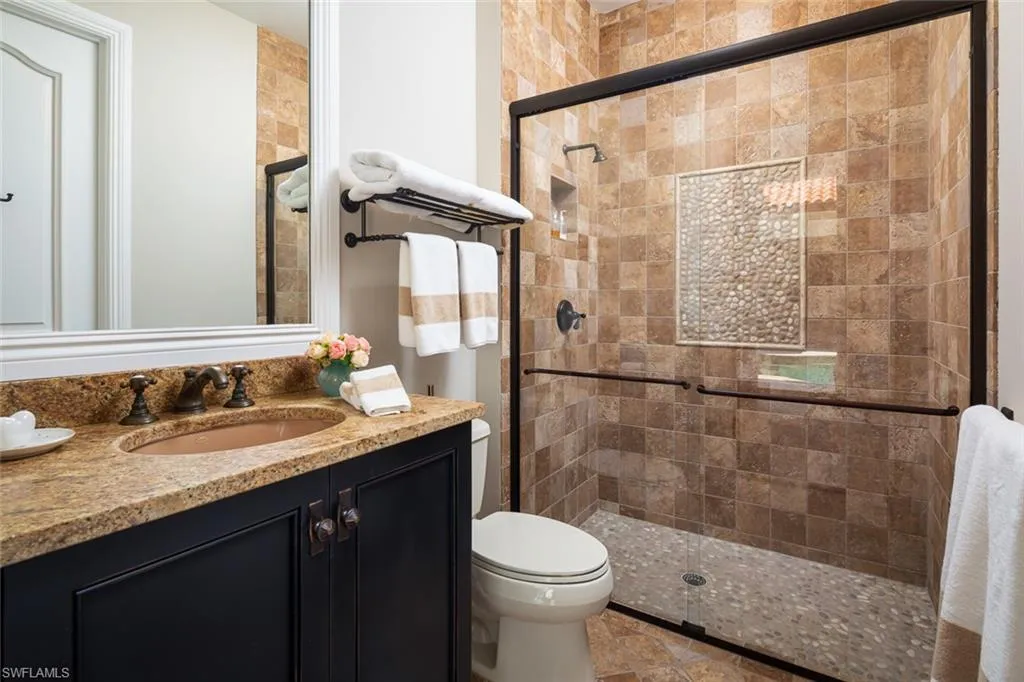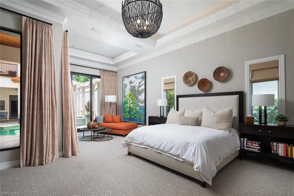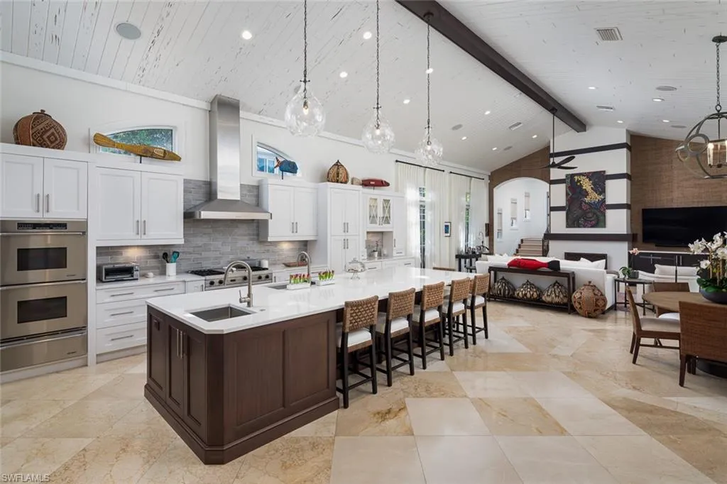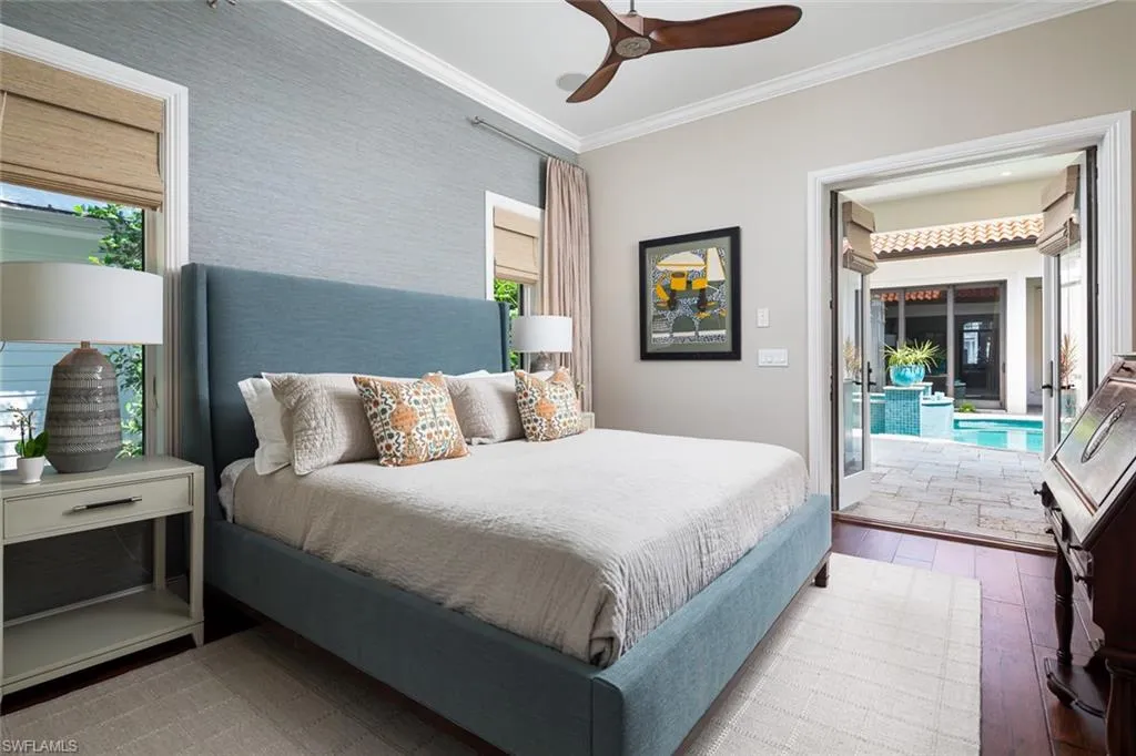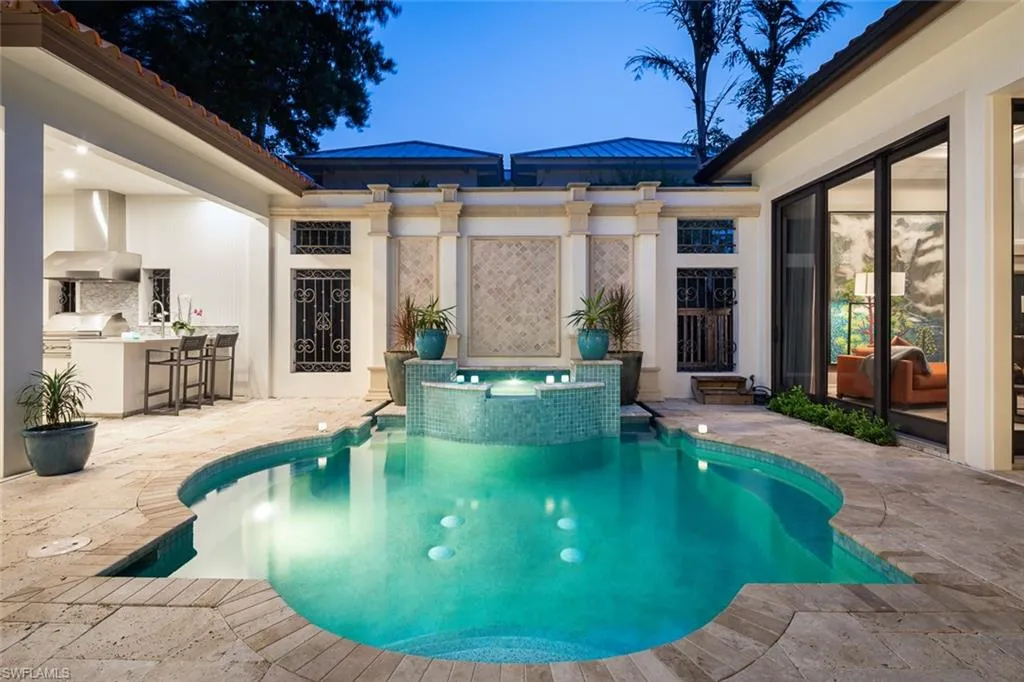 Unmatched location in the heart of Old Naples—just one block from 3rd Street South and three blocks to the beach. This timeless, elegantly updated home offers refined living steps from world-class dining, boutique shopping, and white sand shores. The light-filled layout features a dramatic entry, soaring ceilings, spacious living areas, and a state-of-the-art chef’s kitchen. Natural materials, custom finishes, and bold accents create a sophisticated yet comfortable atmosphere. Enjoy seamless indoor-outdoor living with a serene courtyard, pool, lanai, and private guest cabana. A rare opportunity for those seeking a low-maintenance ease, and a lock-and-leave lifestyle in one of Naples’ most desirable neighborhoods.