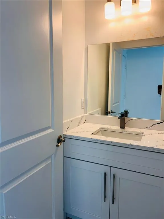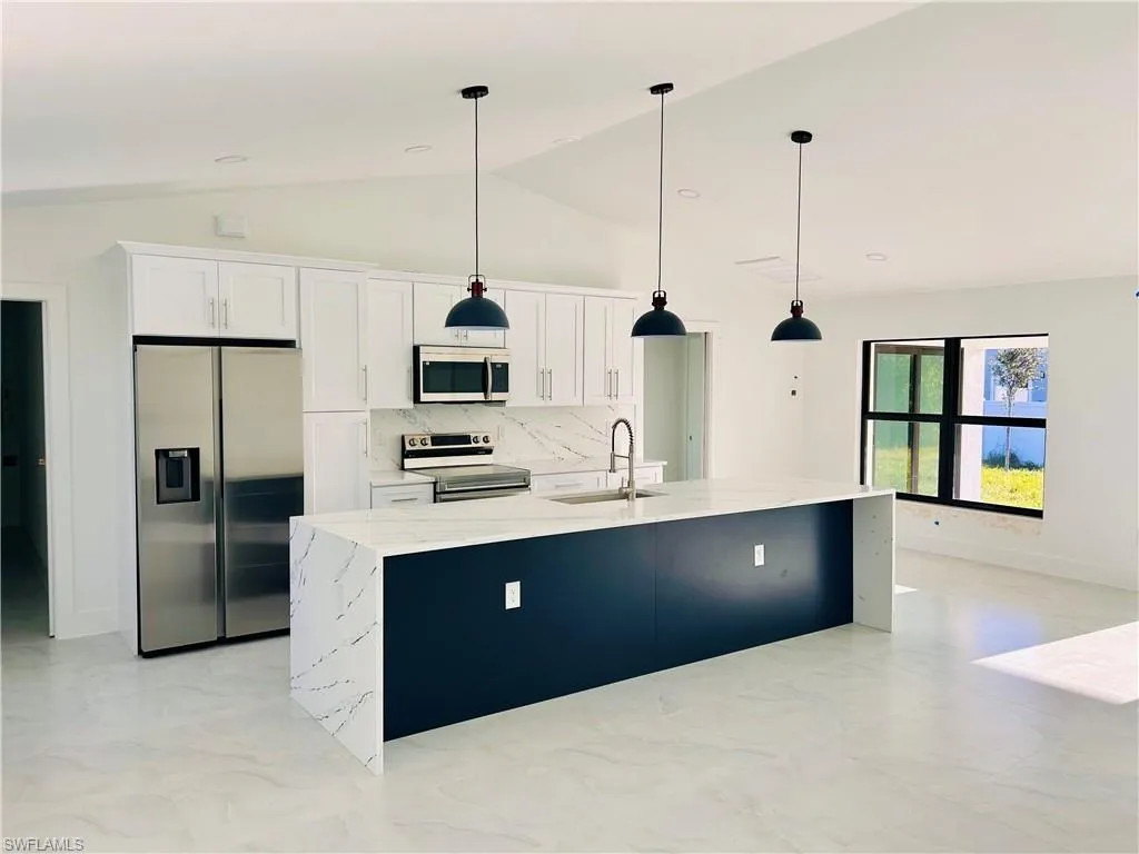 Home has quartz countertops, kitchen island with waterfall edge, tile in the whole home even in the lanai and front entry. Beautiful modern design with extra touches as quartz backsplash and dark blue cabinets in the kitchen island are one of the few that will catch your eye.