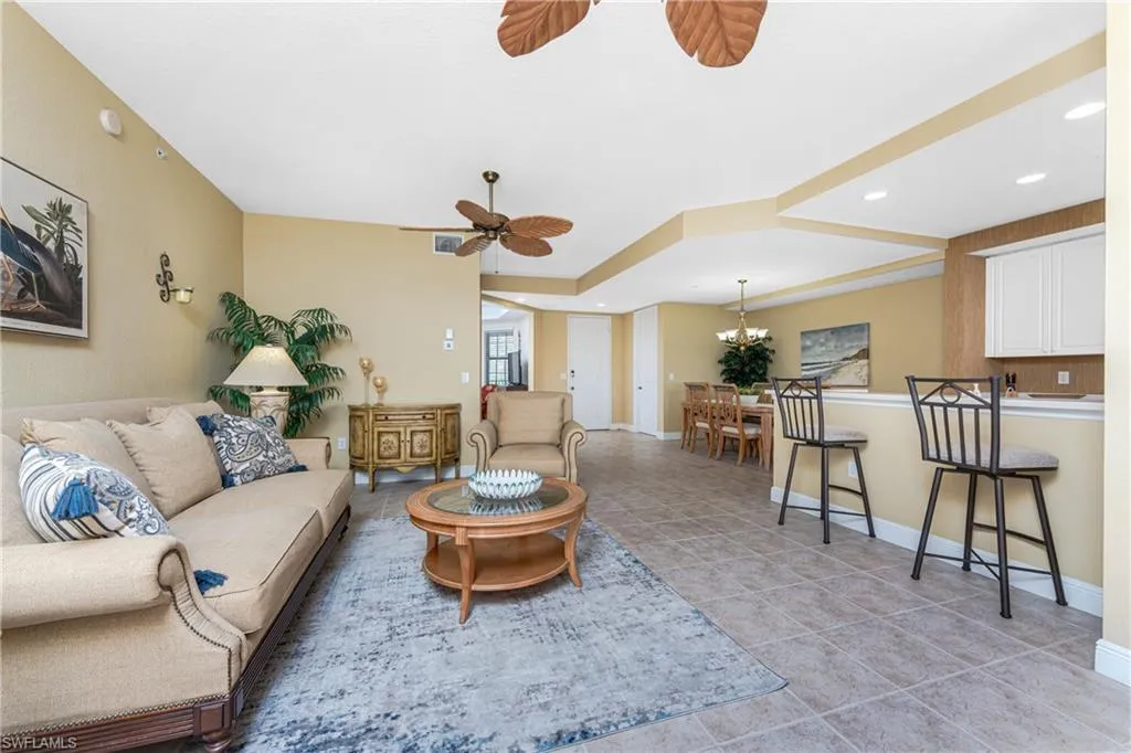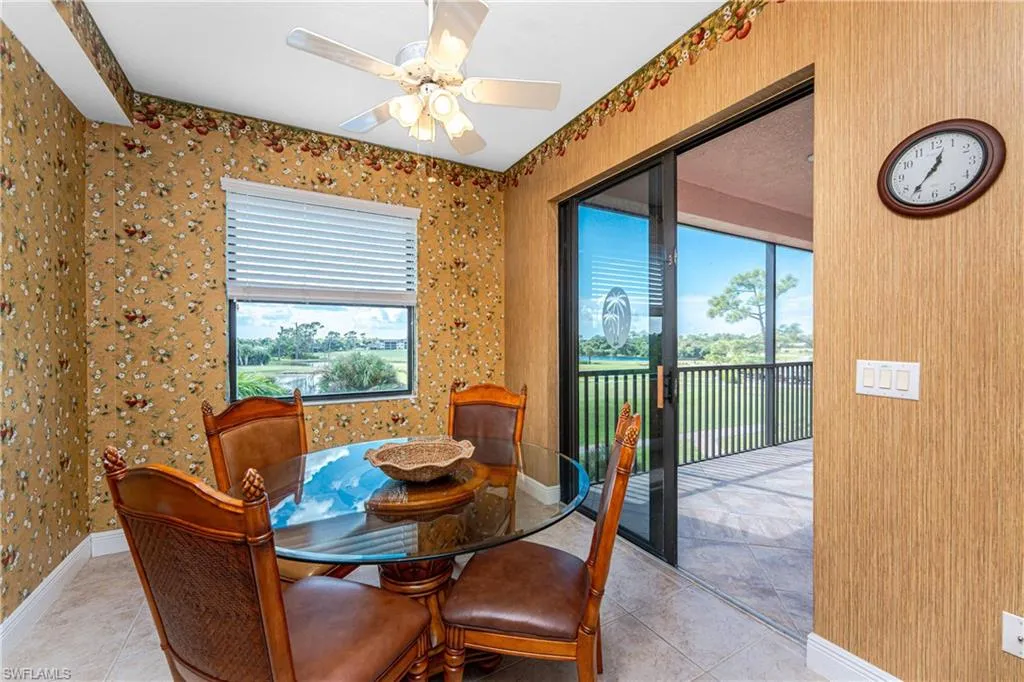 Breathtaking panoramic golf and pond views provide the perfect backdrop from this fabulous turnkey-furnished condo. This spacious two bedroom plus den residence is perched on the third level and is serviced by an elevator and two screened in staircases. Step inside to find an inviting open layout overlooking Burnt Store’s picturesque golf course. The main living area boasts tile flooring, a spacious dining room, and a breakfast bar that seamlessly connects the light-colored kitchen to the living space. The sprawling kitchen is equipped with abundant cabinetry that is sure to accommodate all of your kitchenware and serving pieces, with generous work surfaces and handy desk. A nice sized pantry allows you to store lots of groceries and goodies! The family chef will be delighted by the brand new stainless steel appliances. A cheerful breakfast nook offers direct access to the lanai and enjoys views of the golfers and wildlife below through the large window. Outdoor living is at its best with a large screened and tiled south facing lanai, which enjoys Florida sunshine all day. A great place to lounge with a good book or enjoy your favorite meal al fresco with friends and family. Unwind in the expansive primary suite which also has direct access to the lanai and dual walk-in closets. The bath offers dual sinks, tiled walk-in shower, and relaxing garden tub. A spacious den with double doorway is currently being used as a TV room, but can be used as an office or overflow bedroom by adding a set of French doors. The private guest wing provides a welcoming bedroom and bath, ensuring comfort and privacy for visitors. Additional highlights include a dedicated laundry room, impact glass windows, under-building parking with a private oversized two-car garage—plus an optional golf cart garage available for purchase separately. This privately gated condominium community offers direct access to the golf course and community via golf cart path, its own heated pool and spa, and had new roofs installed in 2023. Enjoy the vibrant lifestyle offered here – with Burnt Store Marina Country Club just steps away. Residents also enjoy access to two on-site restaurants, a fitness center with tennis and pickleball, and the largest deepwater marina in SWFL.