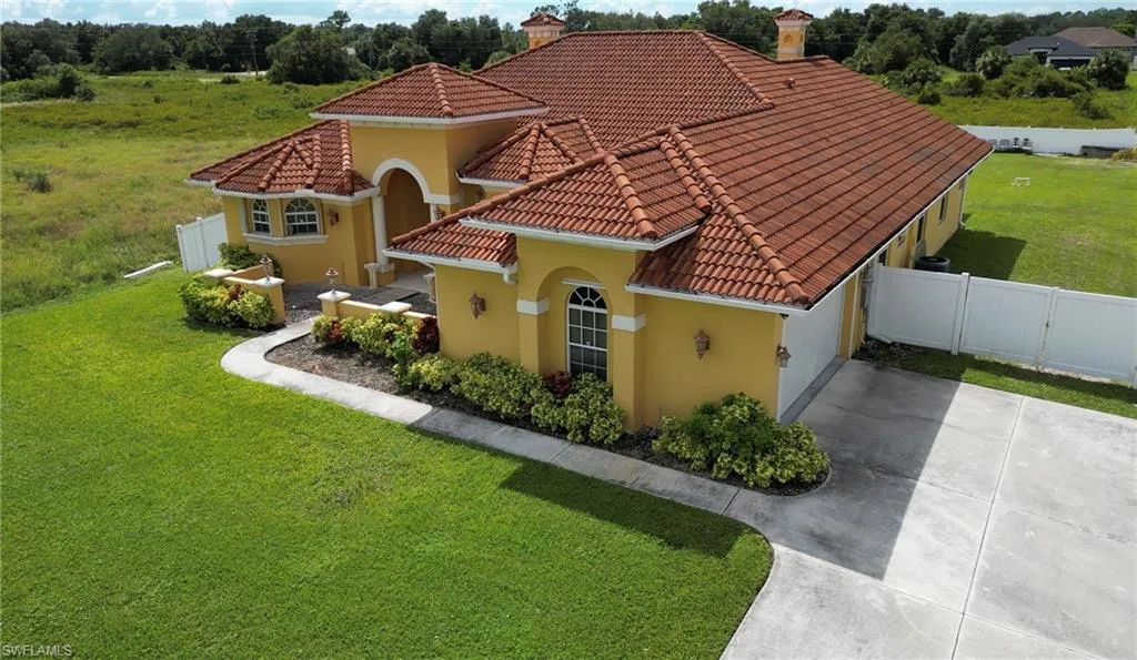 Situated on a half-acre lot, this elegantly designed tile roof home features over 4,500 sq. ft. of total living space (3,284 sq. ft. under air), including a large bonus/game room and an expansive 600+ sq. ft. screened lanai, providing endless opportunities for recreation and relaxation. Step inside through the stylish entryway and discover an open, light-filled floor plan with imported tile flooring throughout, soaring ceilings, and sunlit living spaces designed for effortless flow. The expansive master suite spans a full side of the home, complete with a sitting area, dual walk-in closets, and a spa-inspired bathroom featuring a jetted tub and walk-through shower with dual shower heads.