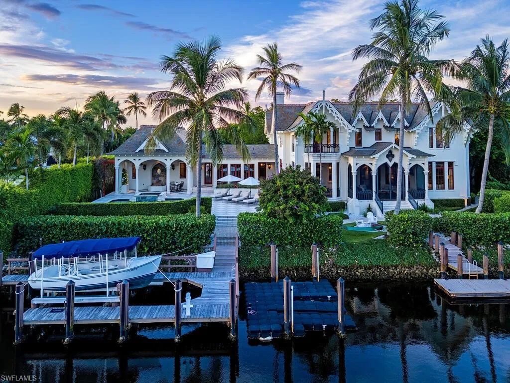 Outside, a private boat dock with lift extends your living space onto the water, offering direct access to the Gulf and endless opportunities to explore the natural beauty that surrounds. Lush landscaping creates a sense of seclusion, while the home’s commanding presence remains soft, elegant, and welcoming.