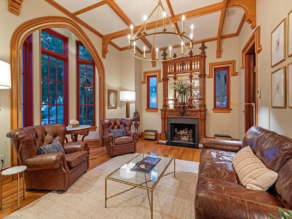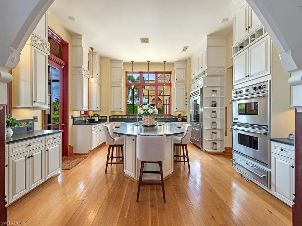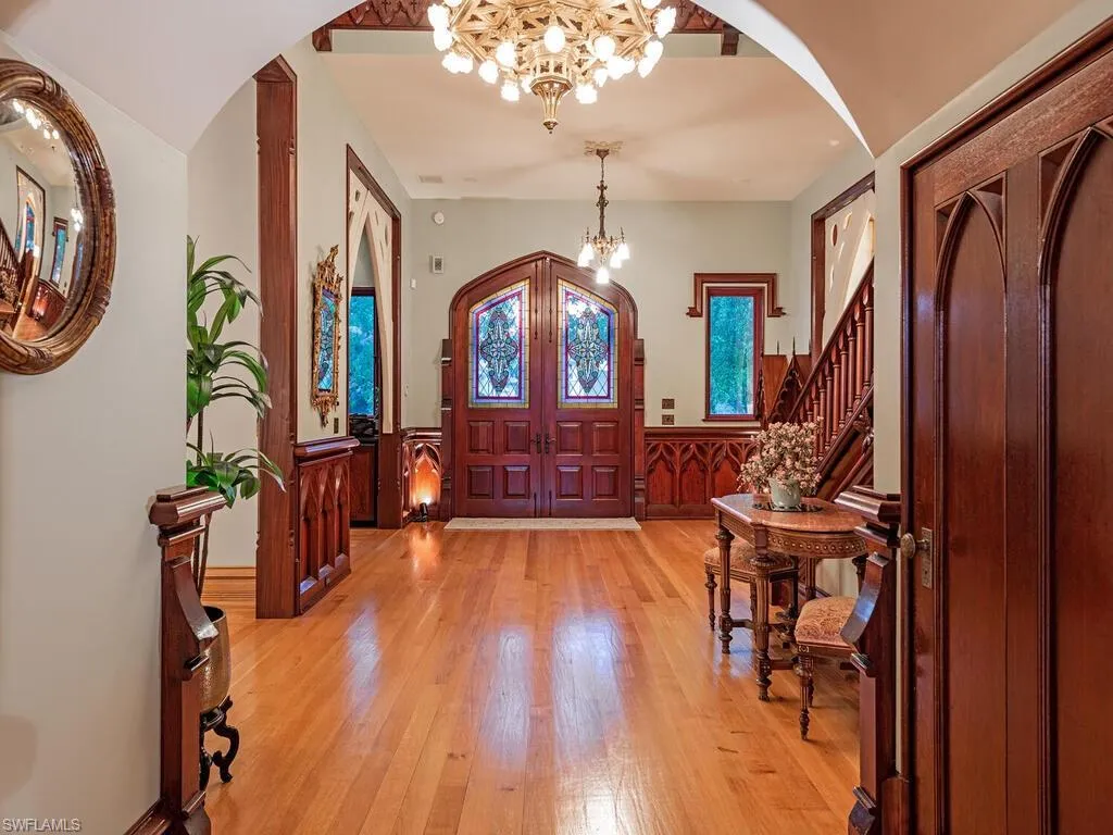 A love story between historic beauty and coastal elegance, entwined on a lush half-acre in the heart of Aqualane Shores, this extraordinary residence is a rare and radiant expression of architectural romance. Carefully curated and masterfully constructed, the home is a celebration of artistry — where restored cathedral relics, monumental design elements, and bespoke craftsmanship come together in a space that feels at once timeless and deeply intimate.