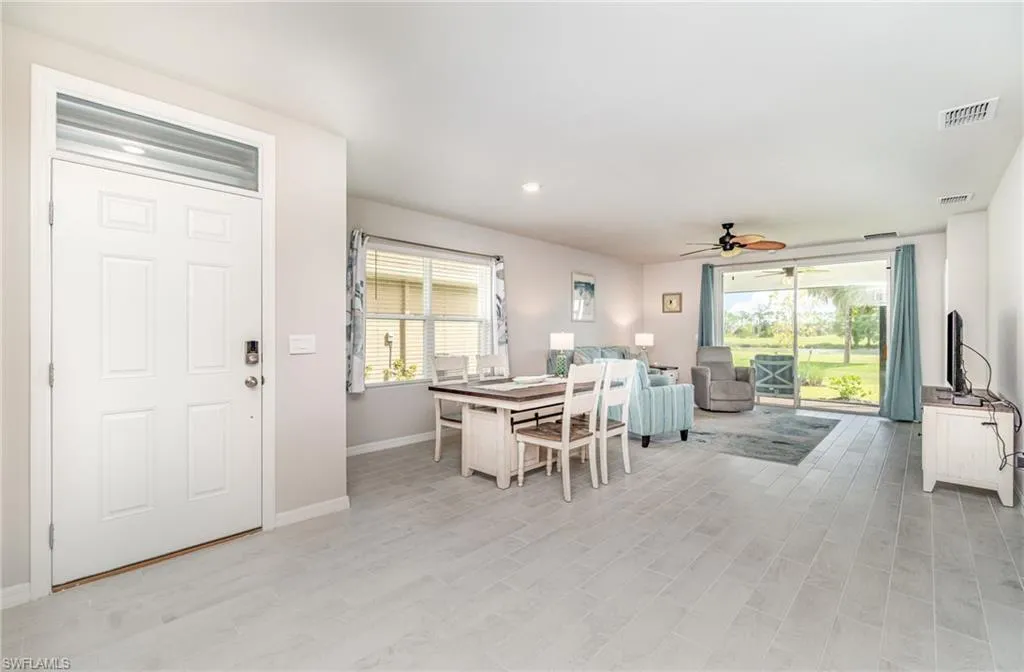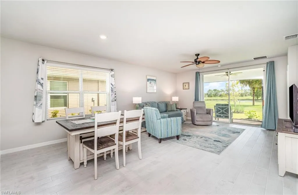 • TURNKEY PERFECTION IN MAGNOLIA LANDING • Step into style and comfort with this beautifully maintained villa featuring gorgeous gray plank tile flooring, upgraded lighting and fans, stylish drapes with wrap-around rods, and a custom glass shower door and upgraded shower head in the primary suite. Enjoy peace of mind with accordion shutters, a screened lanai overlooking golf course and water views, and an epoxy-finished garage floor.