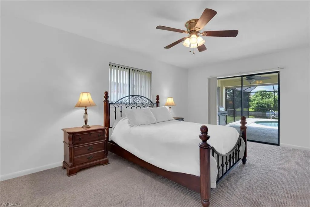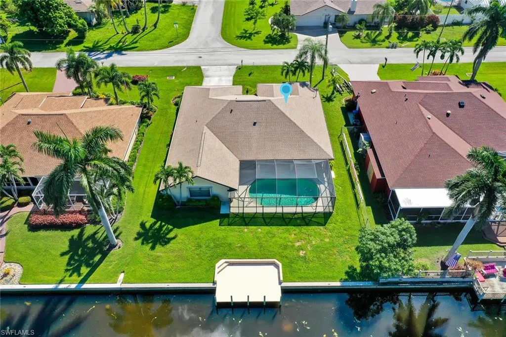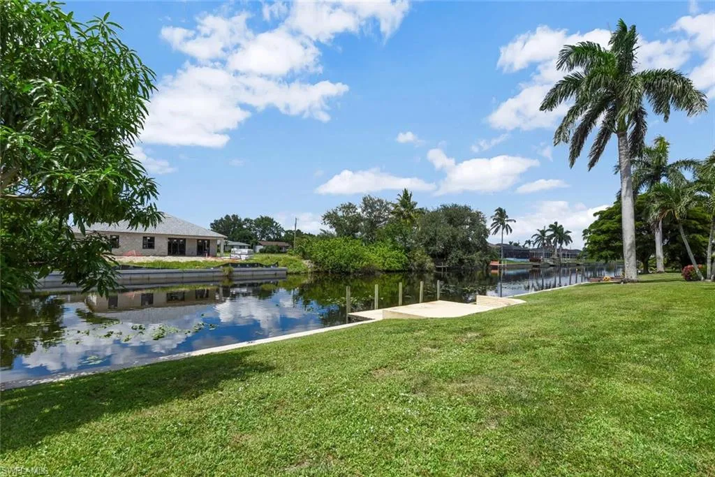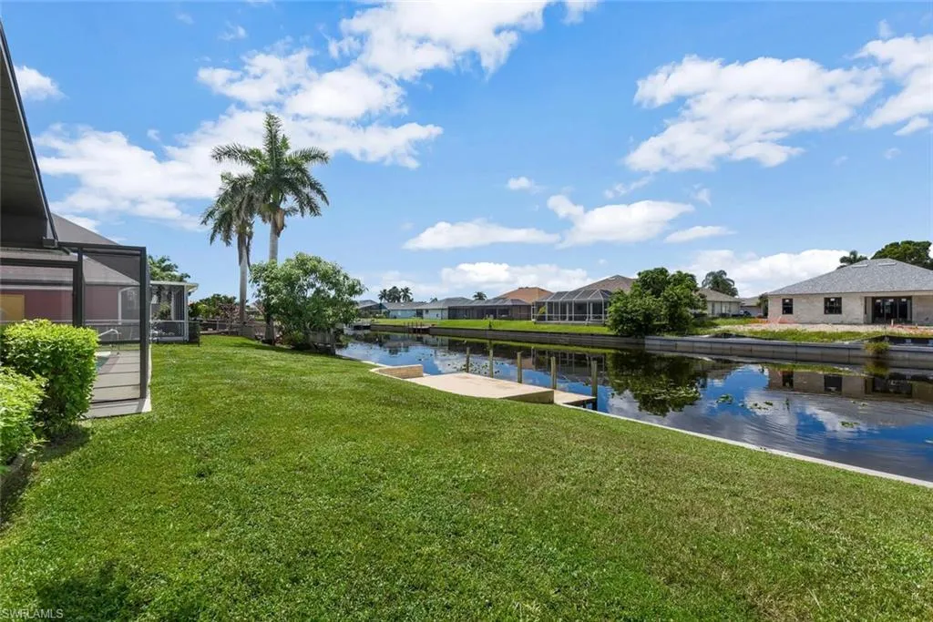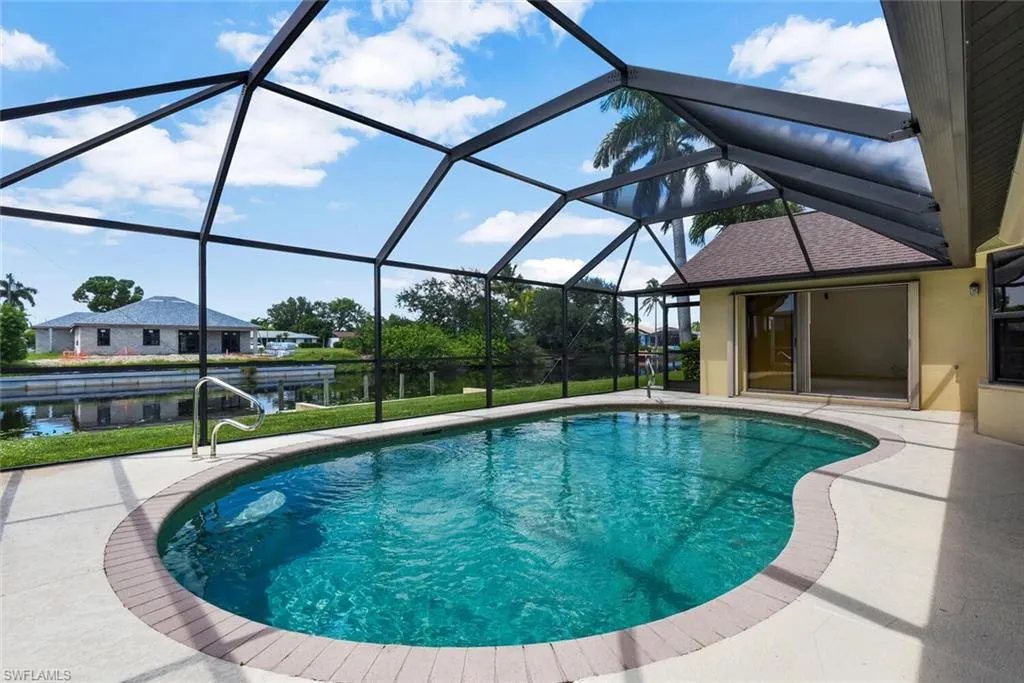 Amazing waterfront home situated on a fresh water canal that is ideal for those who love to kayak, fish, & boat right from your backyard. NOT IN A FLOOD ZONE & THIS HOME HAS NEVER TAKEN IN WATER FROM A STORM! With city water & sewer PLUS all assessments paid this home features a classic & living room layout, spacious kitchen w/ breakfast nook & island, disappearing sliders, formal dining area, French door front entry, split bedroom floor plan, master suite that has private entry to the pool lanai, one of the guest rooms is extended giving you a perfect area for home office, amazing outdoor living space that includes a long covered sitting area, and cement boat dock. Meticulously maintained home w/ recent updates that include- NEW 4 TON A/C UNIT RECENTLY INSTALLED! WARRANTY AND a 2 YEAR MAINTENANCE AGREEMENT INCLUDED & TRANSFERABLE, new carpeting, new pool cage including screens & hardware, new screen doors in 2023, the roof was replaced in 2020, and a new garage door opener in 2023. Storm protected by a combination of electric shutters, accordion style storm shutters, and clear manual shutters. Very convenient location w/ easy access to both the Midpoint & S Cape Coral bridges, surrounded by tons of shopping/dining options, minutes from public library, and only a short drive to community parks & boat docks.