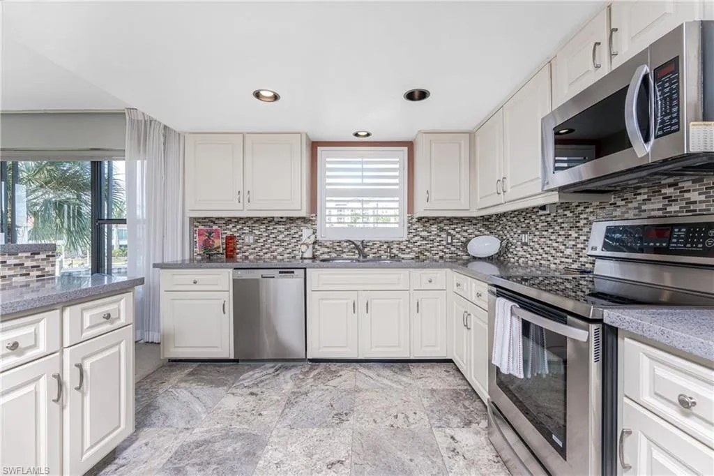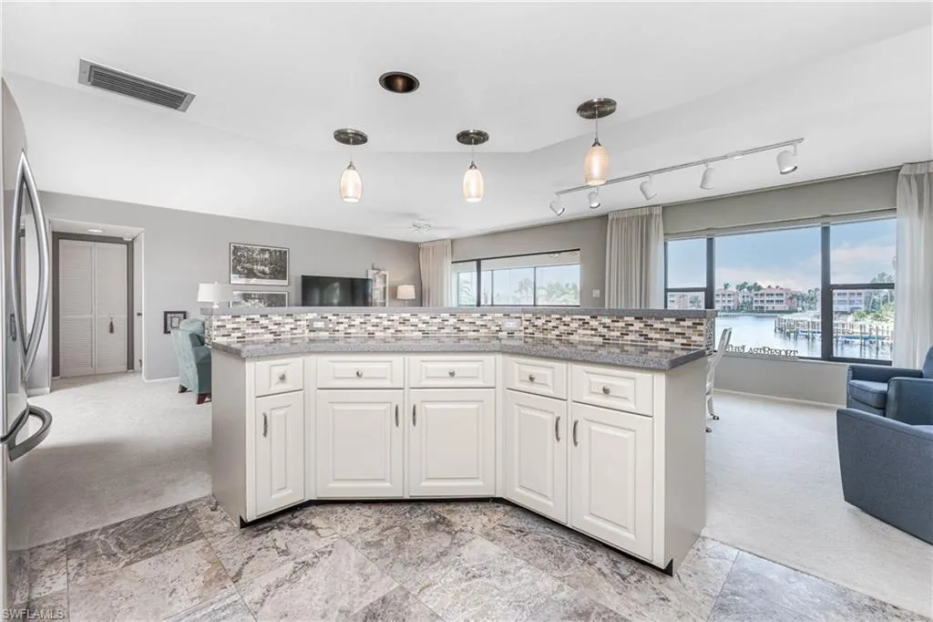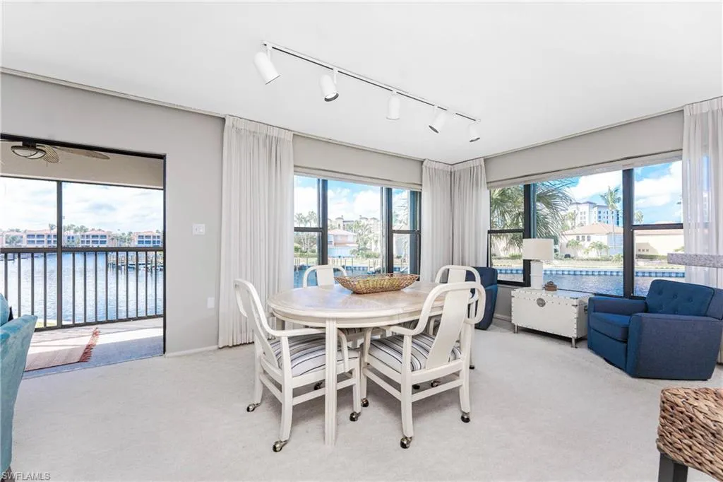 Dramatic marina views abound from this highly sought-after second floor corner residence at Marina North Shore in Burnt Store Marina. Perched at the water’s edge with southwest exposure where you will enjoy the daily boat parade passing by below. When you step through the door you will be captivated by the incredible panoramic water views! Pleasing natural light and sweeping water views will take your breath away. The open floorplan of this furnished turnkey two bedroom condo showcases a light and inviting updated kitchen with sleek silestone counters, glass tile backsplash, stainless appliances, striking travertine stone floor, and wrap-around breakfast bar with pendant lighting — the perfect space to gather with family and friends. Everyone will sign up for dish duty as you can gaze out the window and take in the views while scrubbing and rinsing. Enjoy your meals with the ultimate water backdrop from your dining table through the expansive picture windows…or step through the sliding doors and enjoy your meals al fresco on the lanai. The screened lanai is a fabulous place to relax with your favorite beverage while overlooking the serene North Marina basin. The seating area off the dining space is sure to be another favorite spot to enjoy your incredible new home! The generously sized primary suite boasts captivating marina views and direct access to the lanai, a customized walk-in closet, and a tastefully updated bath with dual vessel sinks and a glass-enclosed tiled shower. Guests will enjoy their private wing with an updated bath featuring a stylish vessel sink, while the guest bedroom offers a rare bonus balcony overlooking the water. Additional highlights include updated finishes throughout, including a new AC in 2025, tasteful tropical décor, and the convenience of being steps from the marina. Marina North Shore boasts beautiful grounds, covered carport and waterfront pool area – the perfect space to unwind or socialize with neighbors. Burnt Store Marina offers an active and recreational lifestyle, with access to a 27 hole golf course with aqua range, fitness center with tennis and pickleball, two restaurants, and SW Florida’s largest deepwater marina.
