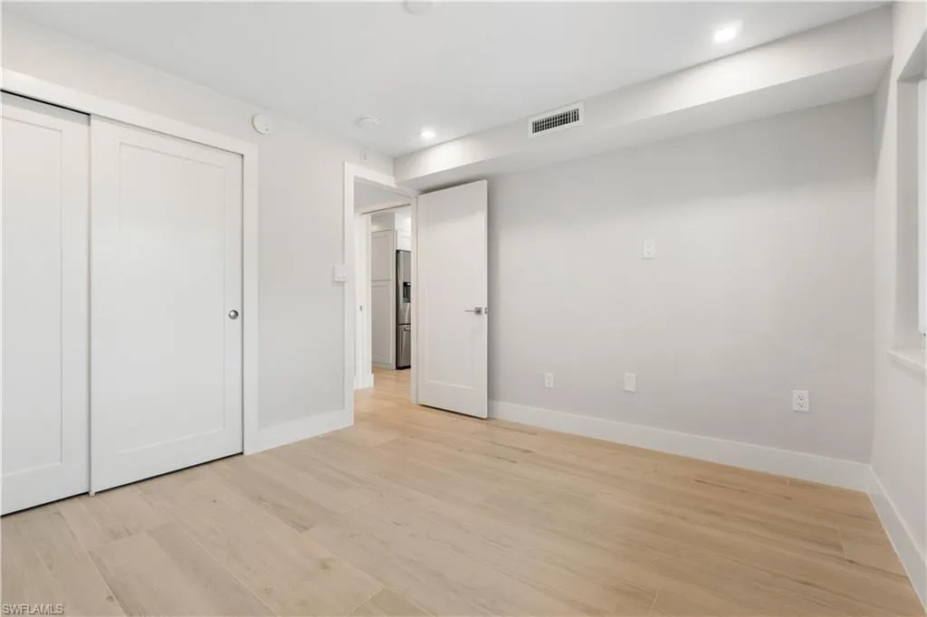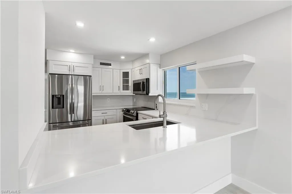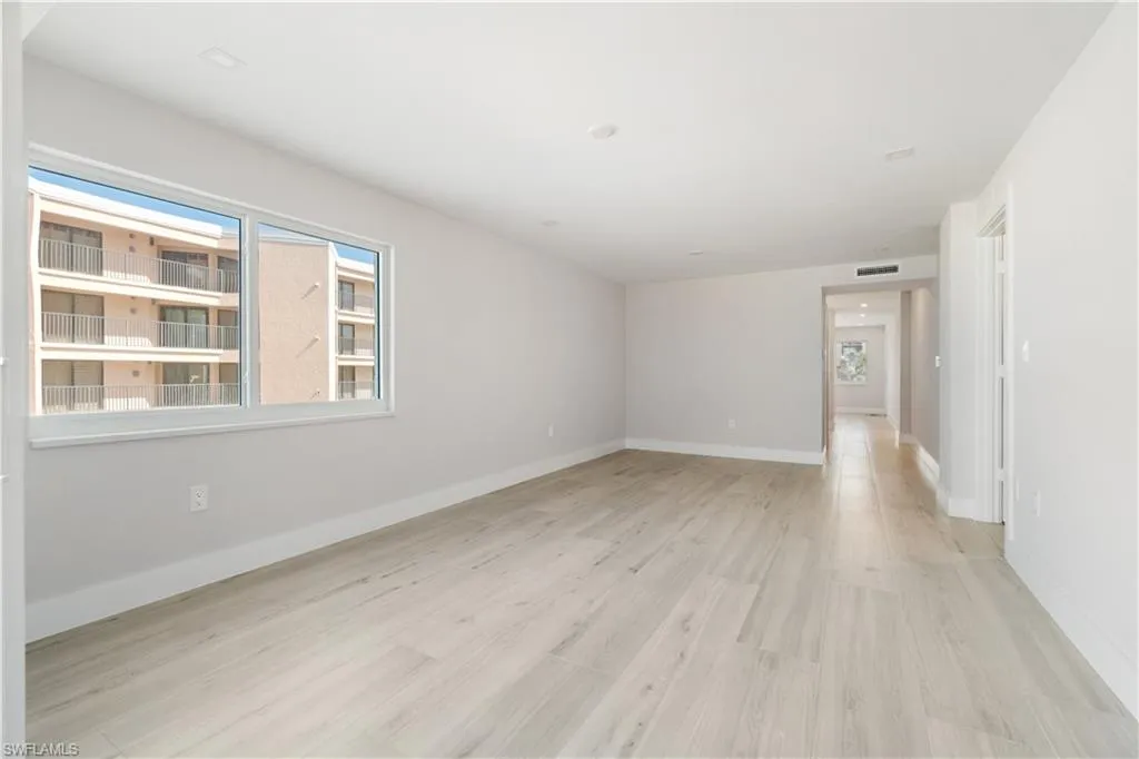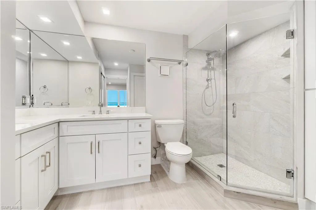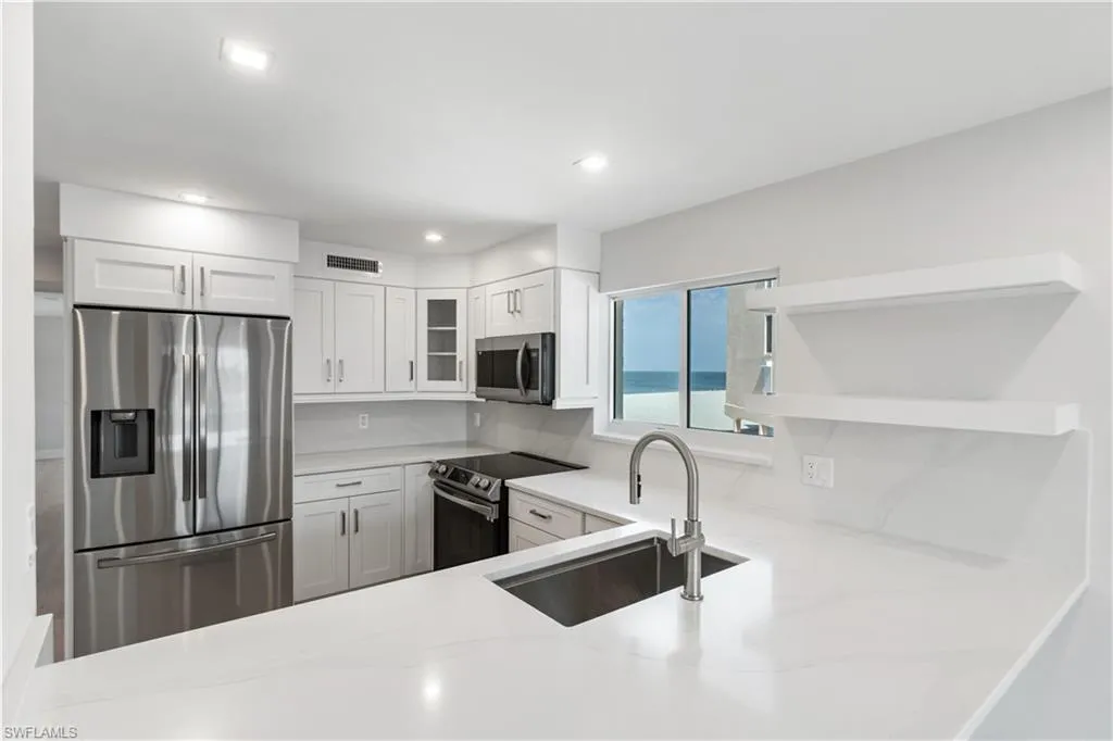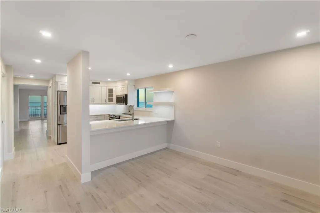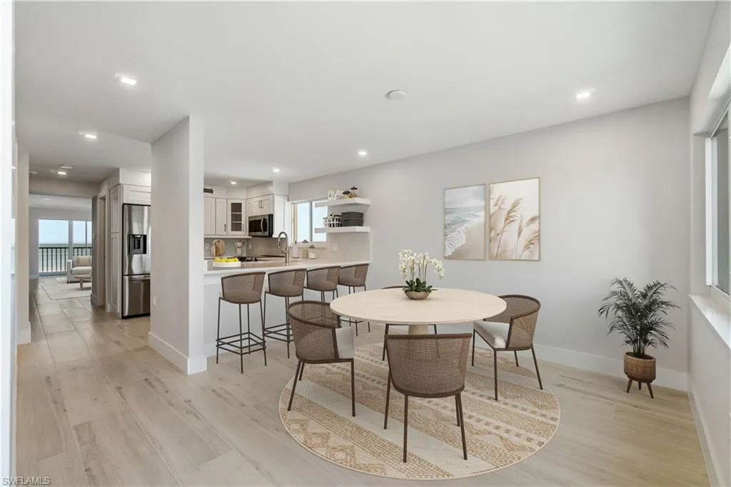 TOTALLY RENOVATED & JUST COMPLETED, COASTAL CONTEMPORARY, DIRECT BEACHFRONT END-UNIT IN THE BELOVED CASA BONITA II ON THE PEACEFUL NORTH END OF BONITA BEACH! THIS STUNNING MODERN UNIT IS ONE OF THE NICEST RENOVATIONS EVER OFFERED! With breathtaking views of the turquoise waters and pristine white sands, this 2 bedroom, 2 bathroom condo is the perfect coastal retreat. Completely renovated and redesigned, it features beautiful wide plank driftwood-look porcelain tile floors, NEW HURRICANE IMPACT GLASS ON ALL THREE SIDES, a new HVAC, a tankless water heater, and a BRAND-NEW ROOF ON THE BUILDING. This unit boasts extraordinary natural light courtesy of the extra windows available in a rare end-unit. The spacious lanai is an entertainer’s dream, offering the option to close the glass sliders for an air-conditioned sunroom or open them up to enjoy the sound of the surf on the screened-in porch. Indulge in sweeping, panoramic Gulf views extending from Naples to Sanibel, creating the perfect backdrop for relaxation. The stunning chef’s kitchen is complete with all new white shaker cabinetry, pristine white quartz countertops, and new stainless-steel appliances. This unit offers excellent potential as a vacation rental (previously generating up to $12k/month during season!) or a personal beachfront getaway. Additional features include a designated parking space, ample guest parking for convenience, and private storage conveniently located on the same floor exclusive to rare end units. Casa Bonita II is perfectly located on the tranquil North end of Bonita Beach with a beachside pool, grilling area, community room, shuffleboard & more. Recent upgrades to the building include a new roof, fresh paint, electrical and plumbing retrofits, beachfront pool renovations, and a renovated community room. Plus, the private beach is currently undergoing beach renourishment for continued enjoyment.