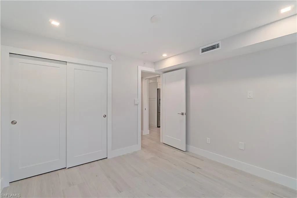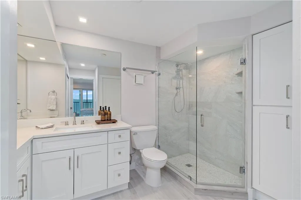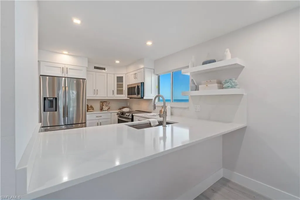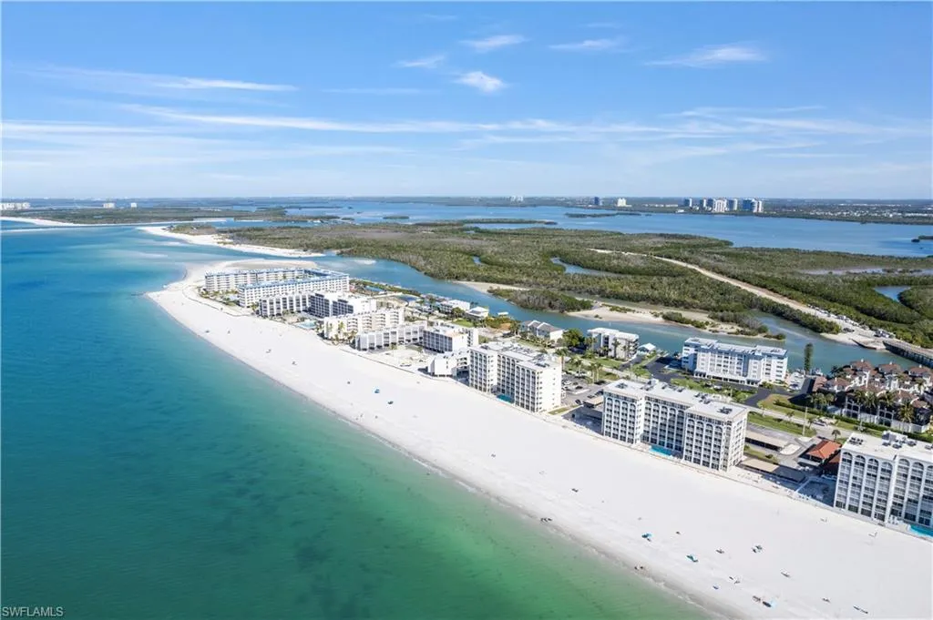 TOTALLY RENOVATED & JUST COMPLETED, COASTAL CONTEMPORARY, DIRECT BEACHFRONT END-UNIT IN THE BELOVED CASA BONITA II ON THE PEACEFUL NORTH END OF BONITA BEACH! THIS STUNNING MODERN UNIT IS ONE OF THE NICEST RENOVATIONS EVER OFFERED! With breathtaking views of the turquoise waters and pristine white sands, this 2 bedroom, 2 bathroom condo is the perfect coastal retreat. Completely renovated and redesigned, it features beautiful wide plank driftwood-look porcelain tile floors, NEW HURRICANE IMPACT GLASS ON ALL THREE SIDES, a new HVAC, a tankless hot water heater, and a BRAND-NEW ROOF ON THE BUILDING. This unit boasts extraordinary natural light courtesy of the extra windows available in a rare end-unit. The spacious lanai is an entertainer’s dream, offering the option to close the glass sliders for an air-conditioned sunroom or open them up to enjoy the sound of the surf on the screened-in porch. Indulge in sweeping, panoramic Gulf views extending from Naples to Sanibel, creating the perfect backdrop for relaxation. The stunning chef’s kitchen is complete with all new white shaker cabinetry, pristine white quartz countertops, and new stainless-steel appliances. This unit offers excellent potential as a vacation rental (previously generating up to $12k/month during season!) or a personal beachfront getaway. Additional features include a designated parking space, ample guest parking for convenience, and private storage conveniently located on the same floor exclusive to rare end units. Casa Bonita II is perfectly located on the tranquil North end of Bonita Beach with a beachside pool, grilling area, community room, shuffleboard & more. Recent upgrades to the building include a new roof, fresh paint, electrical and plumbing retrofits, beachfront pool renovations, and a renovated community room. Plus, the private beach is currently undergoing beach renourishment for continued enjoyment.