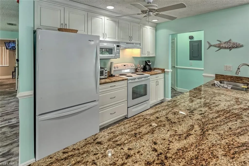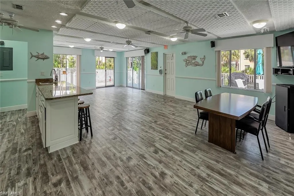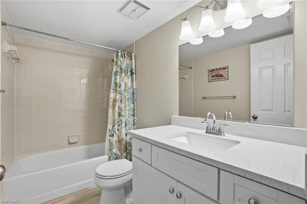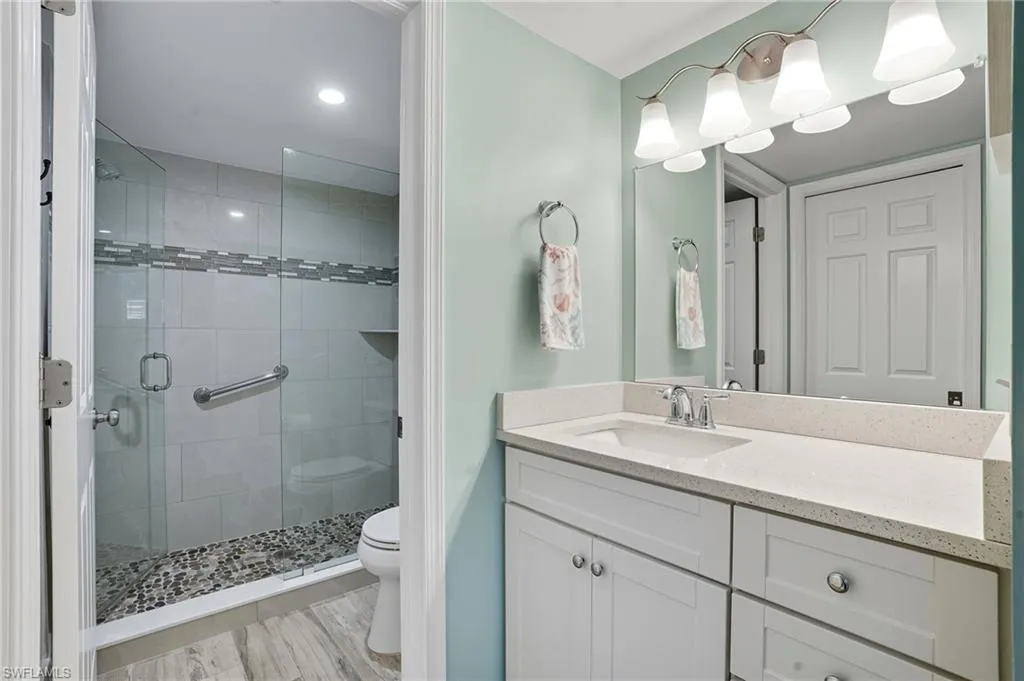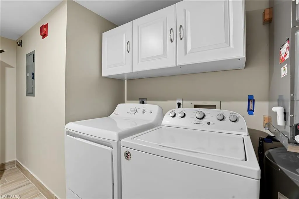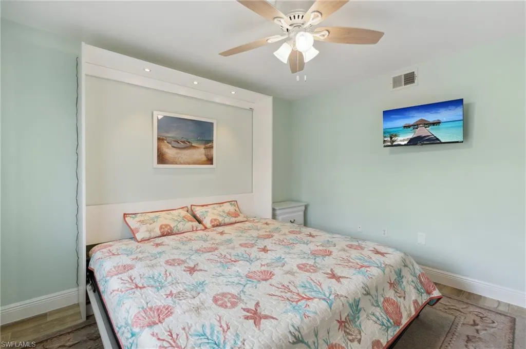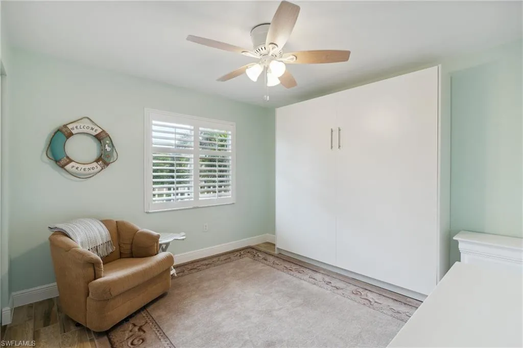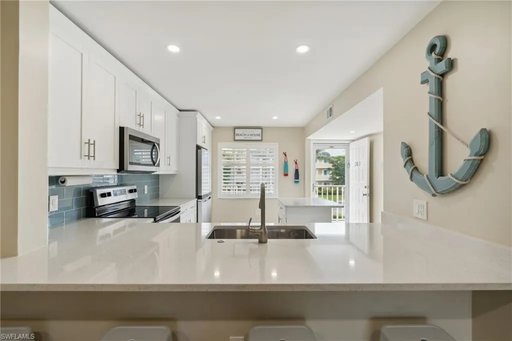 SECURE YOUR VACATION SPOT RIGHT BEFORE THE UPCOMING 2026 SEASON! Why would you pay $$ thousands for seasonal rent in Naples, when you can own this fully-renovated, beach themed condo in move in condition just at the right time before the prices GO UP? This charming condo is conveniently located next to the quiet elevator, which adds 4 feet and makes the living room and the lanai 4 feet wider than other units. NEW driftwood tile floors throughout (including the lanai) installed with 5 inch baseboards. All the popcorn ceilings are gone and the entire unit has been painted, including ALL trim, baseboards and 6 panel doors. ALL NEW recessed lighting, complete electric update, 2021 A/C and Water Heater. You’ll start in the bright white kitchen, featuring beautiful 36″ upper cabinets with crown-molding, sparkling quartz countertops on both kitchen island with additional storage and 8 ft breakfast bar that comfortably seats four. The split bedroom model provides a roomy Main bedroom with walk-in closet, new quartz vanity counter and all newly-tiled walk-in shower with frameless glass door. The Guest bedroom boasts a new King size wall bed allowing this space to double as home office/den. $100k is a conservative “current” estimate for this recent renovation. The guest bathroom has comfort height vanity with quartz countertop and under-mount sink and is next to the laundry/utility/storage room with new and newer dryer and washer. Wait-there’s more! NEW closet doors, ceiling fans, plantation shutters, and priceless lanai sunsets. Sandpiper Bay Club provides elevators in all buildings, 2 pools with restrooms and recently expanded deck areas, a clubhouse available for private functions with full-time on-site manager, multiple outdoor grill and BBQ areas and dock purchase and lease opportunities. The community was freshly painted and re-paved in spring 2025. Sandpiper Bay Club is a true ‘hidden gem”, located just 1.4 miles from 5th Ave, Naples Pier, sandy beaches and rapidly redeveloping area at US 41/Naples Bay Resort/Davis Blvd corner, with new restaurants, coffee and boutique shops.