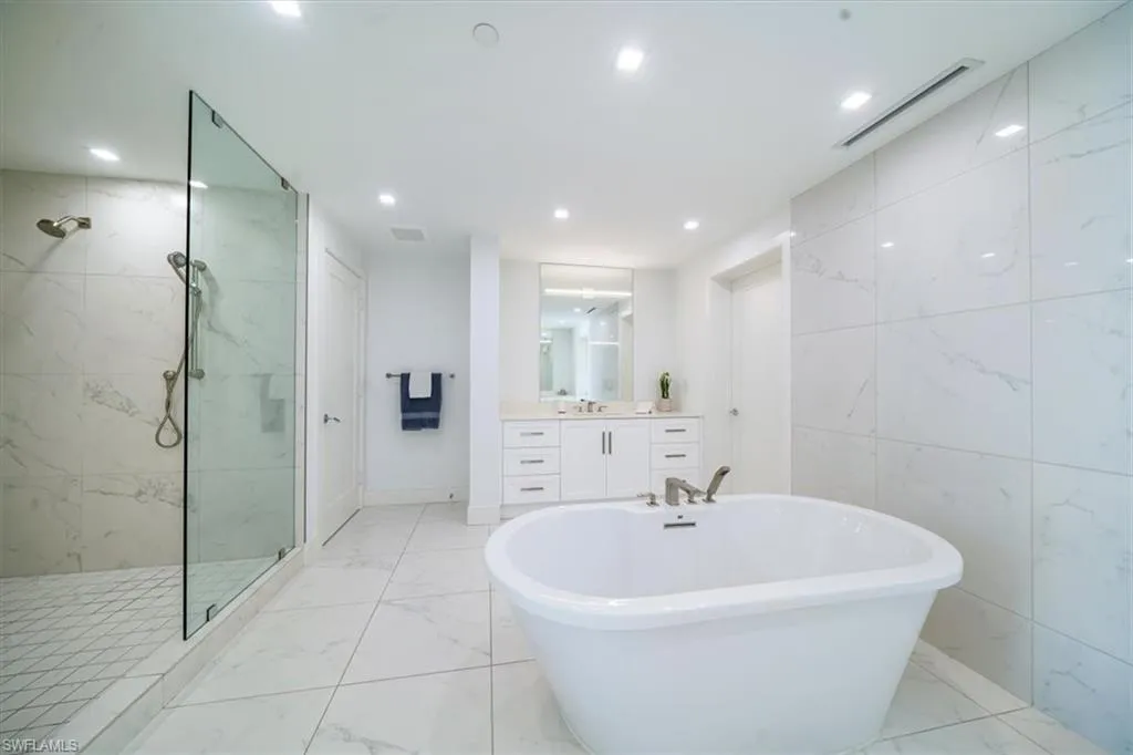 Fabulous lower-floor condo in Building One on the desirable southwest side, featuring the coveted “01” stack with an expansive wraparound balcony offering much more outdoor space than other units. Tiled plank “wood-look” flooring complements warm-toned hardwood floors throughout, creating a seamless indoor-outdoor flow. The open great room floor plan includes a custom built-in media wall with a linear gas fireplace, designer ceiling details, and a striking quartz chandelier. The gourmet kitchen boasts white cabinetry, waterfall quartz island countertops, a tiled backsplash, and top-tier appliances, plus a walk-in pantry with a beverage area and ample storage. The owner’s suite opens to the lanai and features a luxurious bath with a walk-in shower, floating tub, dual vanities, and a built-out closet. Three additional en-suite guest rooms offer plantation shutters and large closets. A spacious laundry room and separate service entrance add convenience. Kalea Bay residents enjoy world-class amenities at the exclusive club, with over 100,000 square feet of luxury amenities. Includes: pools, expanded and remodeled fitness area, casual and formal dining, a beach park, fire pits, a dog park, tennis, pickleball, and short-term guest villas. Live the lifestyle of your dreams at Kalea Bay! Just minutes to sandy beaches, Mercato, fine dining and shopping.