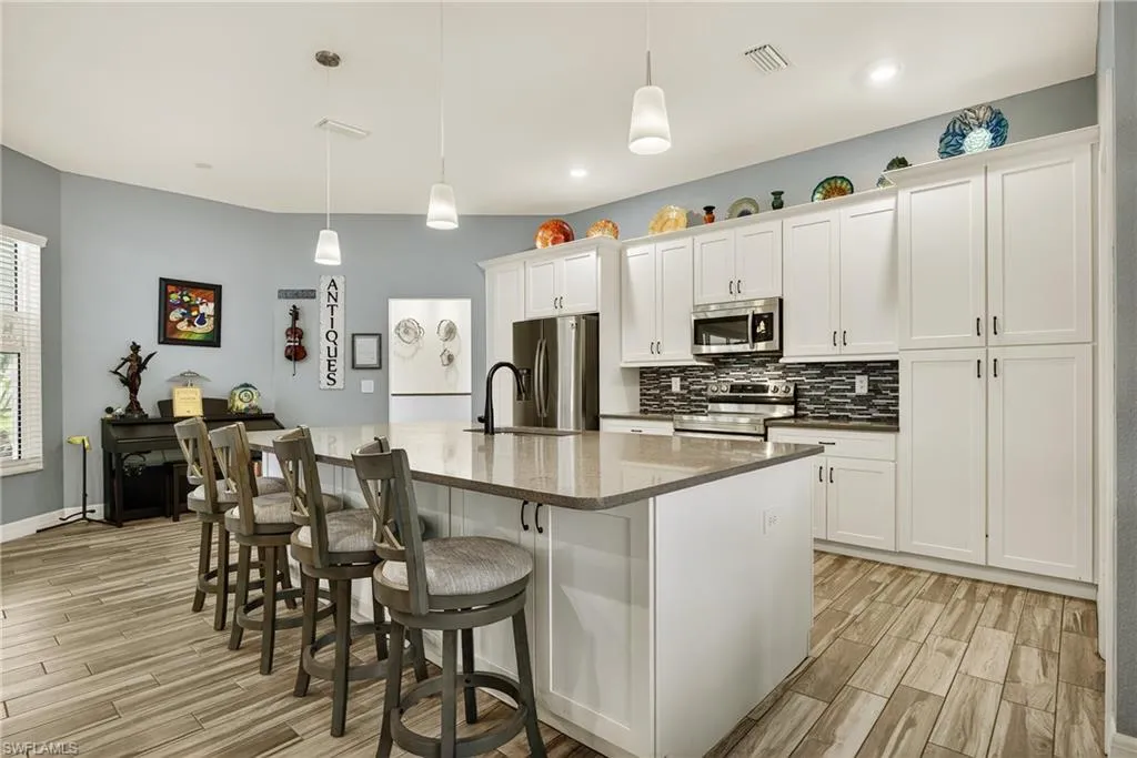 STUNNING CURB APPEAL! LIKE BRAND NEW! BUILT IN 2021 3 BEDROOM, 2 BATH, 2-CAR GARAGE POOL HOME in the deed-restricted community of Burnt Store Village. Step inside where you will find an open floor plan with contemporary décor and lighting, tray ceilings, and ceramic tile throughout. The kitchen offers white raised panel cabinetry complimented by quartz countertops, tile backsplash, stainless steel appliances and large island great for entertaining. Generous primary suite features ample natural light, access to lanai/pool, his and her walk-in closets and private en-suite bath featuring dual sinks, freestanding tub, and walk-in tile shower. Split floor plan provides privacy for guests with two additional bedrooms and separate full bath. Outside enjoy the screened lanai with the saltwater heated pool overlooking the private backyard with greenbelt views. Additional features include a laundry room, hurricane impact windows and doors, irrigation system, hot tub, sun shelf in pool and beautiful lush landscaping. The location of this property is unbeatable, just 20 minutes from downtown Punta Gorda and 30 minutes from downtown Fort Myers. Additionally, it’s close to the relaxed waterfront community of Burnt Store Marina, offering access to resort and golfing facilities, waterfront dining, and entertainment. It is conveniently located to the airport, restaurants, shopping, beaches, and award-winning fishing and boating. Don’t miss out on this opportunity! Schedule your private showing today!