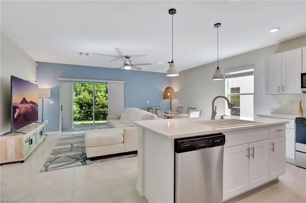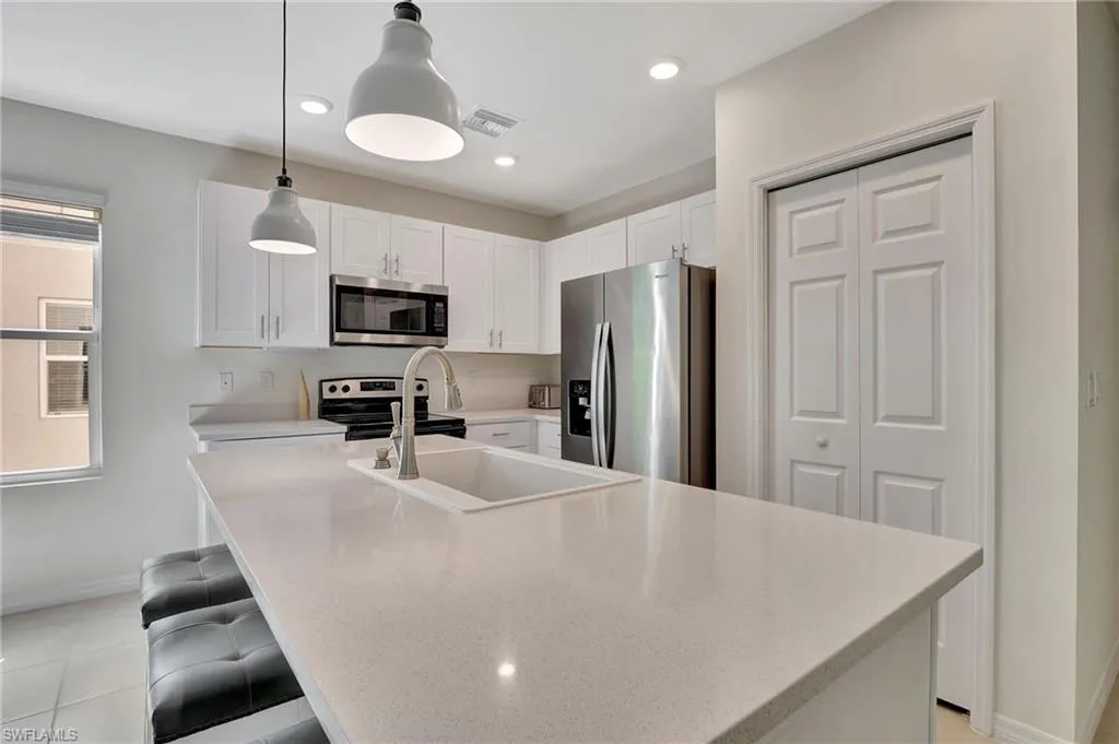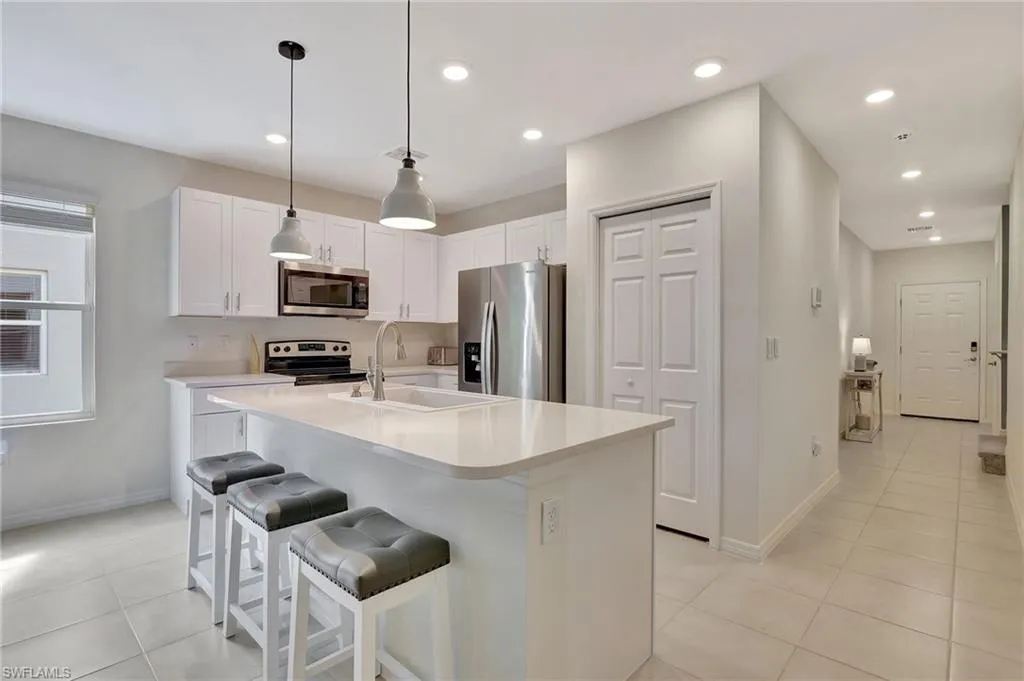 Welcome to this beautifully maintained and thoughtfully updated 2022 end-unit townhome in Meadowood, ideally located off Collier Blvd—just minutes from shopping, dining, entertainment, and Naples’ stunning beaches. Offering 3 spacious bedrooms plus a versatile den/office, this home combines newer construction with exceptional value. Step inside to fresh interior paint and new carpet upstairs. The open-concept kitchen features stainless steel appliances, quartz countertops, stylish pendant lighting, farmhouse sink and new faucets, while every room includes ceiling fans for added comfort. A mini split system in the garage and an ultraviolet air scrubber on the AC enhance air quality and efficiency. Even the lawn has been replaced for a fresh curb appeal. Upstairs, the split-bedroom layout offers privacy, with guest bedrooms connected by a Jack and Jill bath. The den/office provides flexible space for work or play. Enjoy resort-style amenities including a pool, fitness center, clubhouse, basketball court, and playground—all within a gated, pet-friendly community with low monthly fees. This impeccable home is priced to sell—don’t miss your chance!