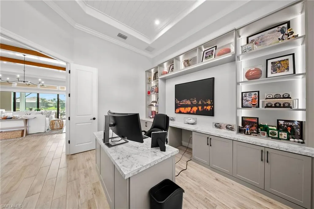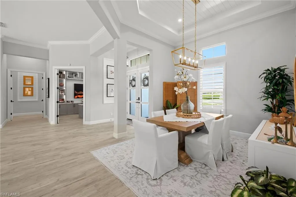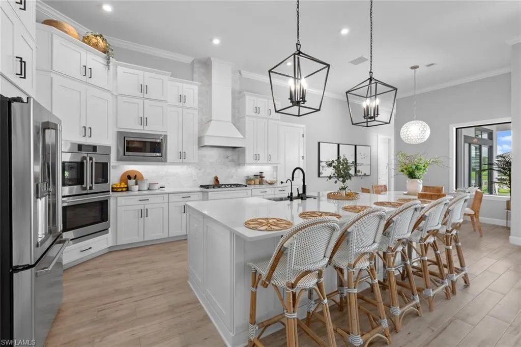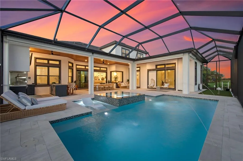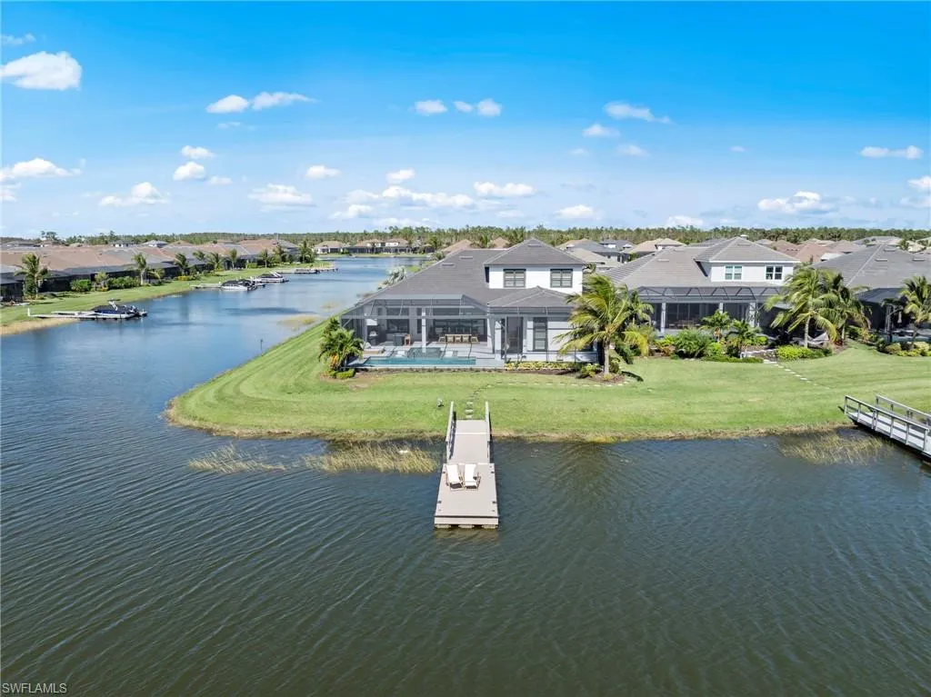 Every detail of this lakefront residence was designed to inspire — a rare opportunity to own one of Esplanade Lake Club’s most extraordinary homes. Perfectly positioned on a Southern-facing cul-de-sac lot, this custom-designed estate offers nearly 5,000 square feet of living space, ultimate privacy, and panoramic lake views. With a private dock and expansive outdoor living, it’s a home that defines resort-style living — where every space feels as comfortable as it is beautiful. Sophisticated yet inviting, this residence blends elegance with comfort and livability. The open-concept floor plan features 5 bedrooms plus home office/den, 4 full baths, 2 half baths, and a 3-car garage. A grand great room anchors the home with custom ceiling treatments, a natural gas fireplace, and serene water views. The first-floor primary suite provides a peaceful retreat with spa-inspired ensuite bath and generous walk in closets. The gourmet kitchen is a chef’s dream with GE Café appliances, quartz countertops, a reverse-osmosis water system, and a spacious walk-in pantry. Upstairs, a versatile bonus room with kitchenette and a guest suite with custom built-ins offer the perfect space for family or guests. Step outside to your private lakeside oasis — a heated custom pool with infinity-edge spa, sun shelf, and putting green all overlooking tranquil waters. Entertaining is effortless with a full outdoor kitchen featuring Blaze grill, Summerset pizza oven, refrigerator, and cypress wood ceiling with electric roll-down screens. Additional features include impact-resistant windows and doors, a 26kW Generac Guardian Natural Gas generator, and meticulous designer details throughout. Furniture package is negotiable. Located within Esplanade Lake Club, a 352-acre gated lakefront community on Lake Como just on the Estero border, residents enjoy premier amenities including a lakefront beach, Bahama Bar & Grille, fitness center, tennis, pickleball, bocce, dog park, and more. All within minutes of RSW Airport, Gulf Coast Town Center, and world-class shopping and dining. Modern design. Panoramic water views. Unmatched privacy. This is Esplanade Lake Club living at its finest.
