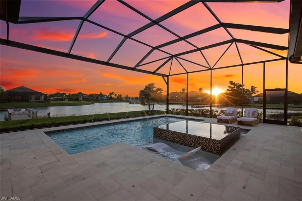 Every detail of this lakefront residence was designed to inspire — a rare opportunity to own one of Esplanade Lake Club’s most extraordinary homes. Perfectly positioned on a Southern-facing cul-de-sac lot, this custom-designed estate offers nearly 5,000 square feet of living space, ultimate privacy, and panoramic lake views. With a private dock and expansive outdoor living, it’s a home that defines resort-style living — where every space feels as comfortable as it is beautiful. Sophisticated yet inviting, this residence blends elegance with comfort and livability. The open-concept floor plan features 5 bedrooms plus home office/den, 4 full baths, 2 half baths, and a 3-car garage. A grand great room anchors the home with custom ceiling treatments, a natural gas fireplace, and serene water views. The first-floor primary suite provides a peaceful retreat with spa-inspired ensuite bath and generous walk in closets. The gourmet kitchen is a chef’s dream with GE Café appliances, quartz countertops, a reverse-osmosis water system, and a spacious walk-in pantry. Upstairs, a versatile bonus room with kitchenette and a guest suite with custom built-ins offer the perfect space for family or guests. Step outside to your private lakeside oasis — a heated custom pool with infinity-edge spa, sun shelf, and putting green all overlooking tranquil waters. Entertaining is effortless with a full outdoor kitchen featuring Blaze grill, Summerset pizza oven, refrigerator, and cypress wood ceiling with electric roll-down screens. Additional features include impact-resistant windows and doors, a 26kW Generac Guardian Natural Gas generator, and meticulous designer details throughout. Furniture package is negotiable. Located within Esplanade Lake Club, a 352-acre gated lakefront community on Lake Como just on the Estero border, residents enjoy premier amenities including a lakefront beach, Bahama Bar & Grille, fitness center, tennis, pickleball, bocce, dog park, and more. All within minutes of RSW Airport, Gulf Coast Town Center, and world-class shopping and dining. Modern design. Panoramic water views. Unmatched privacy. This is Esplanade Lake Club living at its finest.