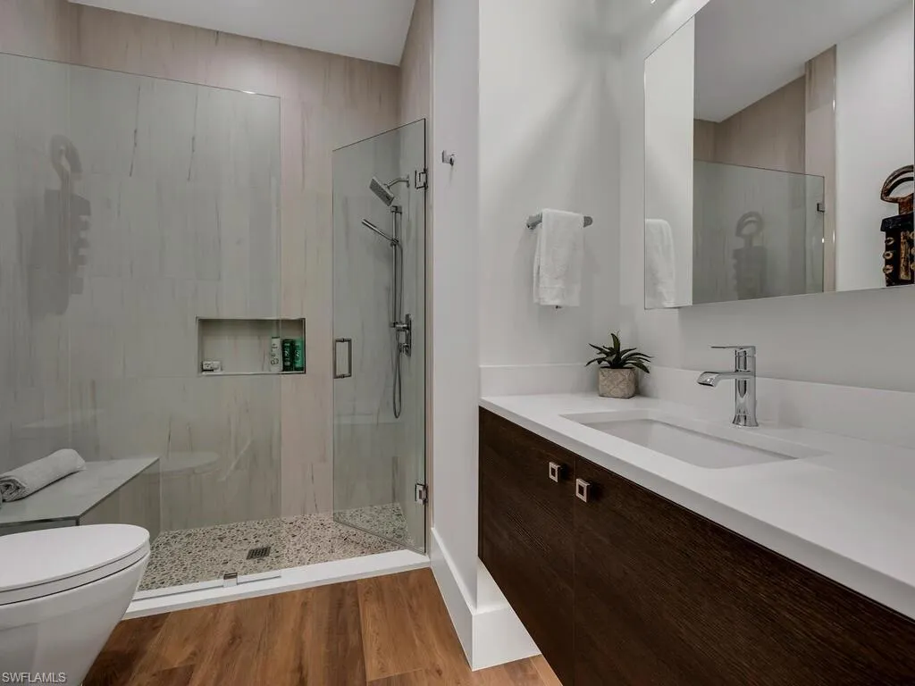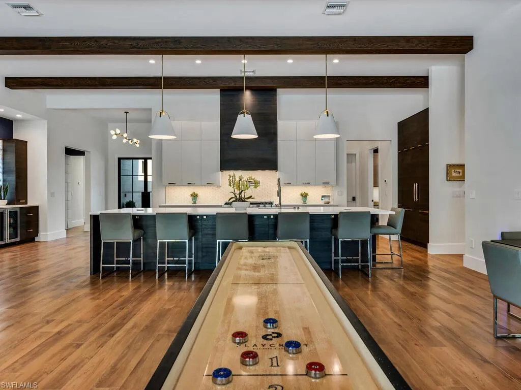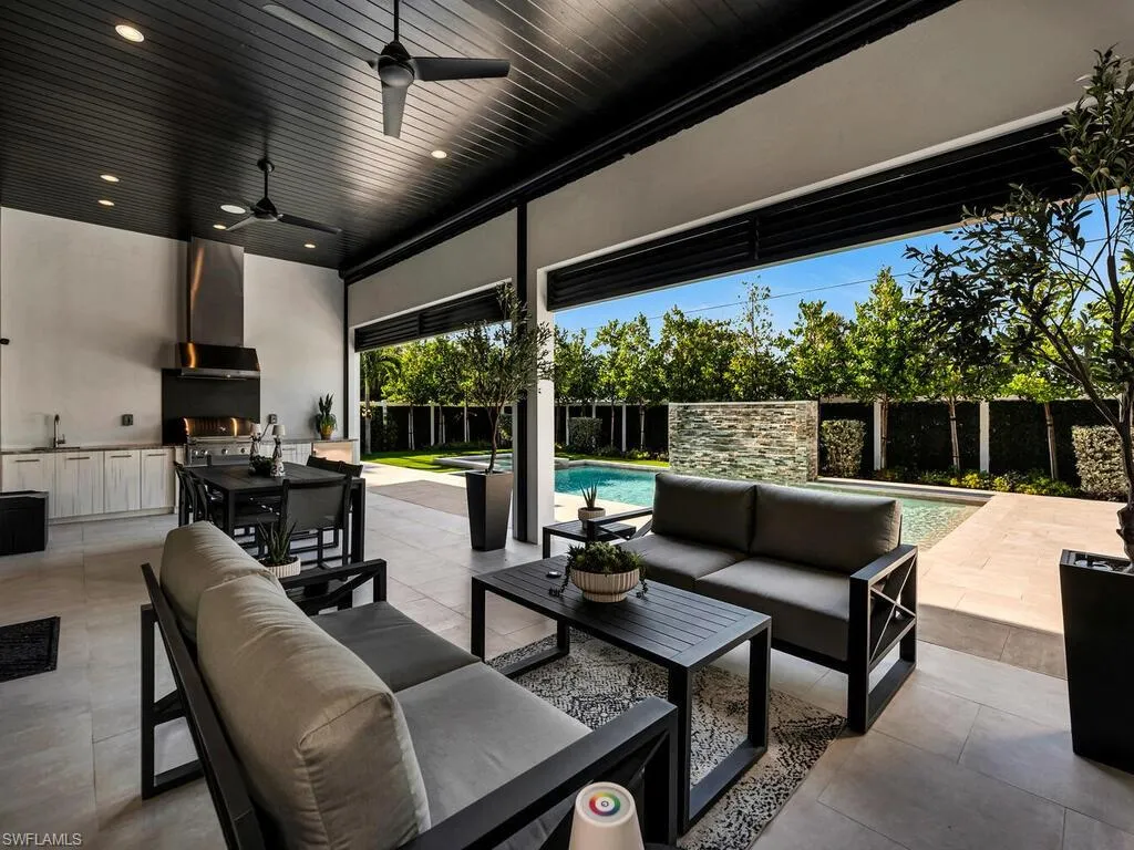 Crafted for Living. Designed for Legacy. This is more than a home—it’s a lifestyle statement. Inspired by the sleek, high-desert estates of Scottsdale, Arizona, this architectural gem brings modern minimalism and luxurious livability to the heart of Naples, Florida. With 4,524 sq/ft under air and 7,312 sq/ft total—including 1,411 sq/ft of lanai and pool deck—this one-of-a-kind residence offers seamless indoor-outdoor living on a grand scale. At the heart of the home is a showstopping 15-foot island and a culinary suite that includes a 48” Z-Line gas range with dual electric ovens, dual 36” refrigerator/freezers, convection microwave, dual dishwashers, a hidden mixer station, and walk-in butler’s pantry with additional sink, dishwasher, and refrigerator. Dual dedicated glassware rinsers add a chef’s-kitchen flourish. The 14’ x 32’ covered lanai is an entertainer’s dream—complete with built-in grill (infrared & rotisserie), undercounter refrigerator, gas fireplace, and a 75” TV. Motorized solar shades allow for total comfort and ambiance, whether you’re dining alfresco or lounging by the spa-style pool with cascading waterfalls, artificial turf, and lush privacy landscaping. The primary suite offers serene views and spa-caliber amenities: wet room with steam shower, chroma-therapy lighting, freestanding soaking tub, dual vanities with storage towers, Toto bidet toilets, and a private outdoor shower surrounded by gardens. The custom walk-in closet is illuminated and designed like a luxury boutique. Four guest suites, each with en-suite baths and generous dimensions, are designed to accommodate king or dual queen beds. A private guest cabana, hidden behind a discreet entry, includes a full kitchen with Invis-a-Cook induction cooktop, LG Wash Tower, living area, private entrance, and parking. A flexible hallway can convert this into a two-bedroom, two-bath guest wing—ideal for extended stays or live-in staff. Additional highlights: 3-car garage with 12′ ceilings (EV pre-wired), four-zone HVAC, three tankless propane water heaters, 1,000-gallon buried propane tank, Lutron Caséta lighting, insulated interior walls, Icynene foam attic insulation, under-cabinet lighting, freestanding ice maker, wine chiller, backlit Blue Cristallo Quartz stone accent panels, and a combination laundry/mudroom with two LG Wash Towers. Every finish. Every fixture. Every space—elevated! Live boldly. Entertain effortlessly. Rest luxuriously. This is more than a home—it’s a statement in architecture, lifestyle, and design.