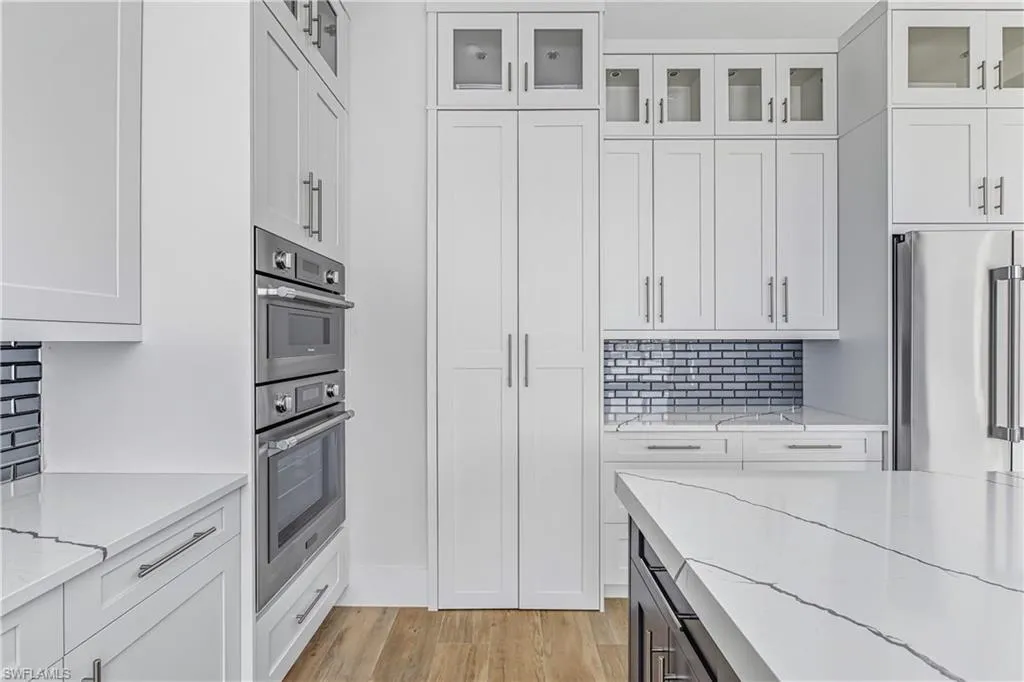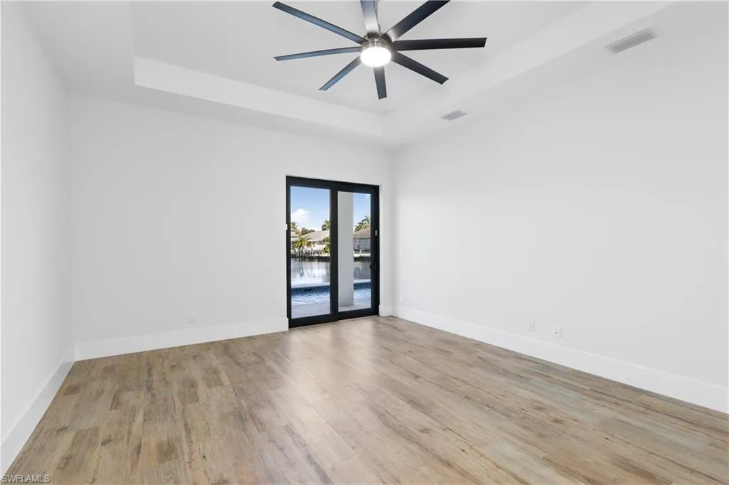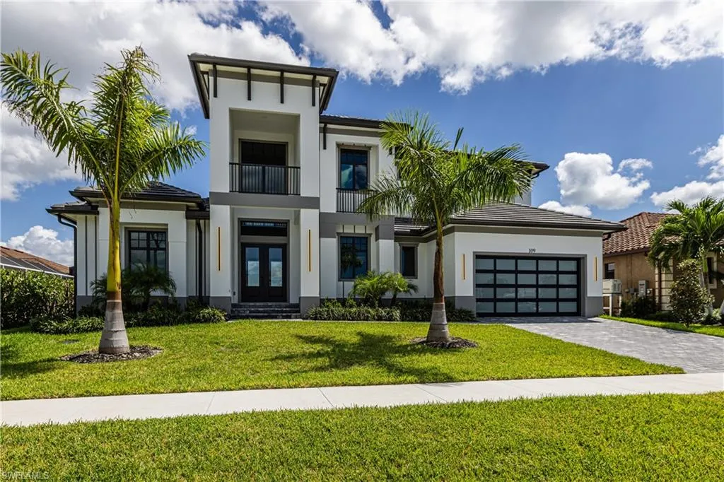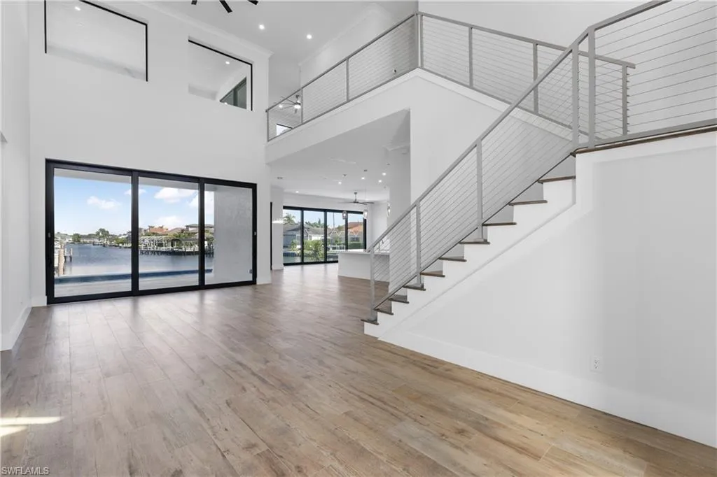 This brand new coastal contemporary Marco Island custom home is move-in ready and designed to maximize water views, natural light, and luxury living. Offering over 4,000 square feet under air, it features five bedrooms, four and a half bathrooms, a family loft, and multiple indoor and outdoor living spaces perfect for entertaining and relaxing. Step through the grand two-story foyer into the open-concept great room, both soaring 23 feet high and drawing your eye through 41 feet of sliding glass doors to breathtaking water views. The gourmet kitchen is a chef’s dream with premium Thermador appliances, a gas range, and a hidden walk-in pantry. High-end quartz countertops and plank-style flooring run throughout the home. The first floor includes a large family room, an additional living area, a master suite with a spa-inspired bath, and a second bedroom that could serve as a private office. Upstairs, the loft overlooks the great room and opens to a large covered balcony facing the water. The second floor also includes two bedrooms, two bathrooms, and a bunkroom (5th bedroom). Outdoors, the home showcases 80 feet of waterfront on a long, uninterrupted 1,400-foot stretch of canal, providing expansive water views. The backyard includes a swimming pool with sundeck and spa, and a fully equipped outdoor kitchen. Additional highlights include a 500-gallon underground propane tank pre-wired for a generator, southeastern exposure for abundant sunlight, and a central Marco Island location within walking distance to the YMCA and near the island’s elementary and middle schools. Priced under $1,000 per square foot as a 2025 construction, this home offers exceptional waterfront luxury and unmatched value among new homes.