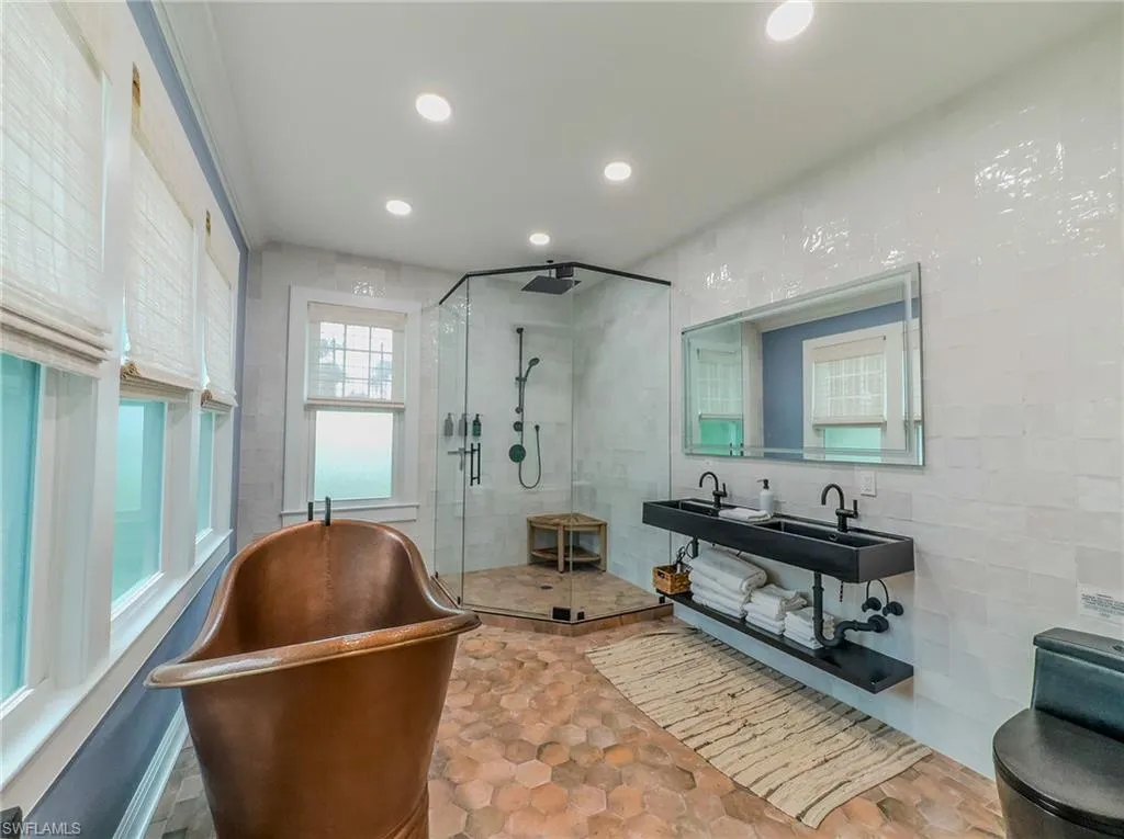 The spacious living room is the heart of the home, featuring a stunning historic coquina fireplace—the perfect setting for cozy evenings. The chef-inspired kitchen is a culinary dream, boasting high-end KitchenAid appliances and a functional, elegant layout.
