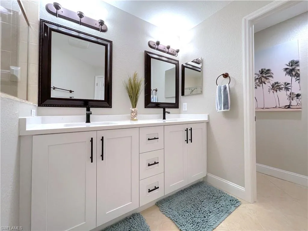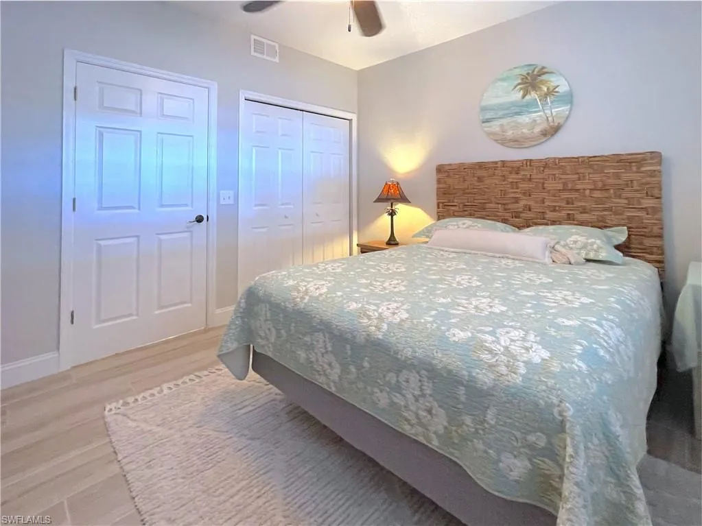 Stunningly renovated 2-bedroom plus den, 2-bath condo located in the highly desirable gated all-age community of Gulf Reflections! Step through the door and you’ll be greeted by a bright, open layout and a completely updated kitchen featuring sleek white quartz countertops, soft-close cabinetry, stainless steel appliances, and a spacious pantry for added storage. The split-bedroom design ensures privacy, with the primary suite offering peaceful lake views from your window, private lanai access, and an ensuite bath complete with private toiletry area, dual vanities, ample cabinetry, and a large walk-in closet. The guest bedroom and second full bath create a comfortable retreat for visitors, while the den serves perfectly as an office, craft room, or extra guest space. Relax and unwind on the screened lanai with no-see-um screens, surrounded by lush landscaping and tranquil views. An outdoor storage closet provides extra room for beach gear, bikes, and more. Gulf Reflections is a pet-friendly, all-age active community ideal for year-round residents, snowbirds, or investors. Short-term rentals are permitted, and residents enjoy resort-style amenities including a clubhouse, heated pool, hot tub, and fitness center. Located just minutes from Fort Myers Beach, Sanibel Island, and Bunche Beach, this first-floor condo also includes one covered carport space and one additional parking spot. Garages may be available for purchase periodically within the community.