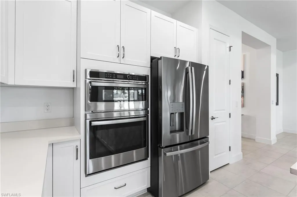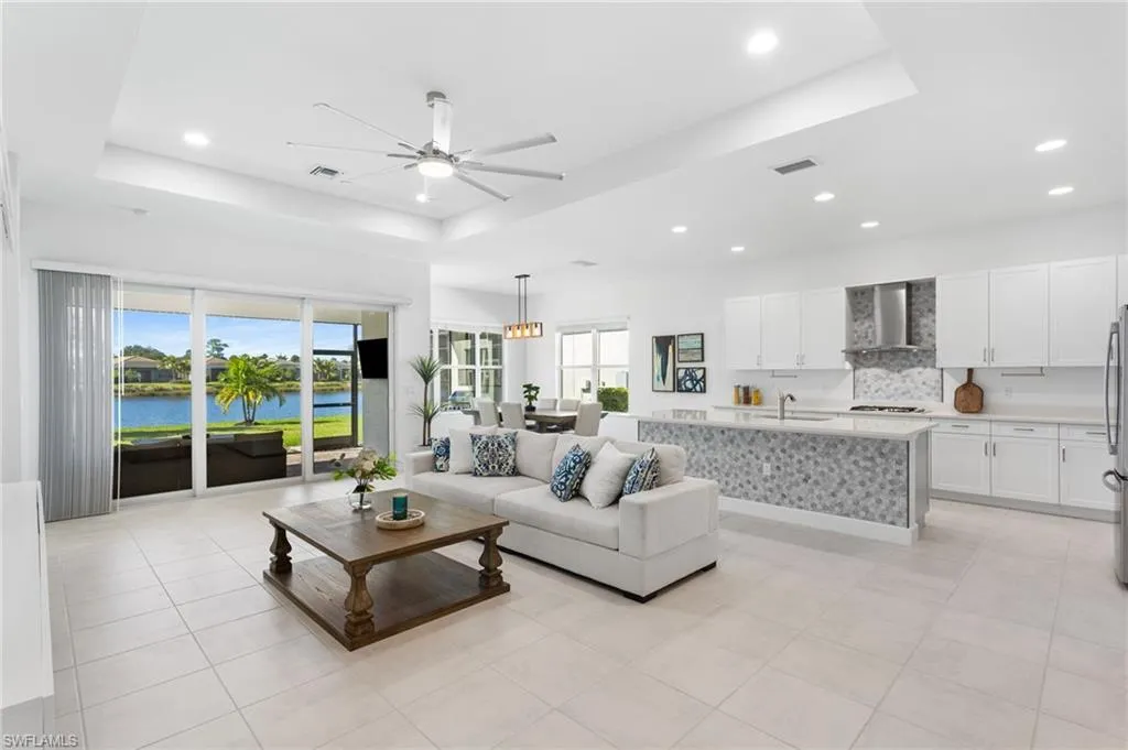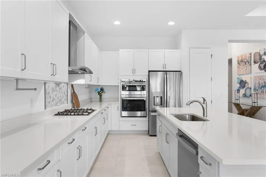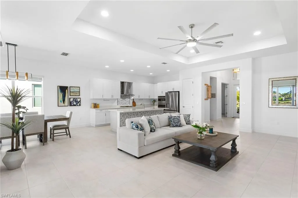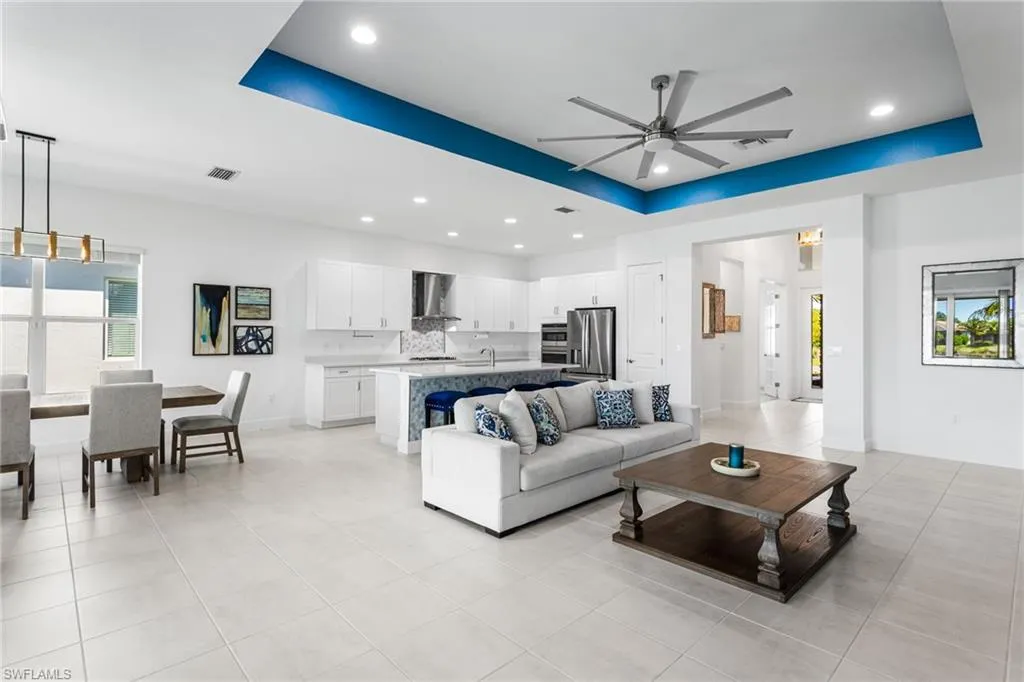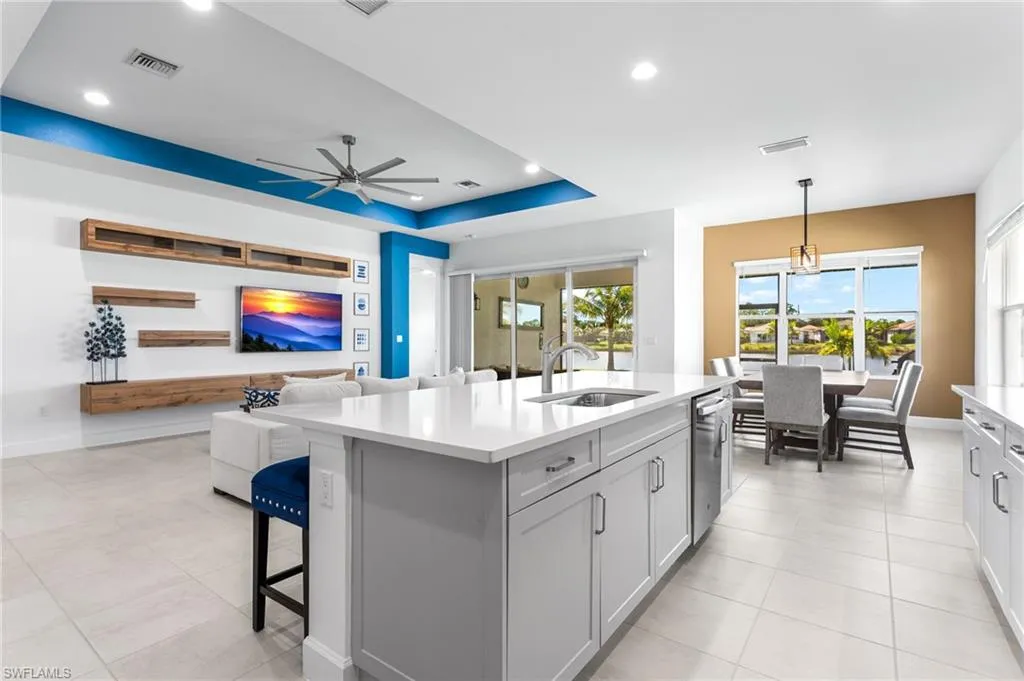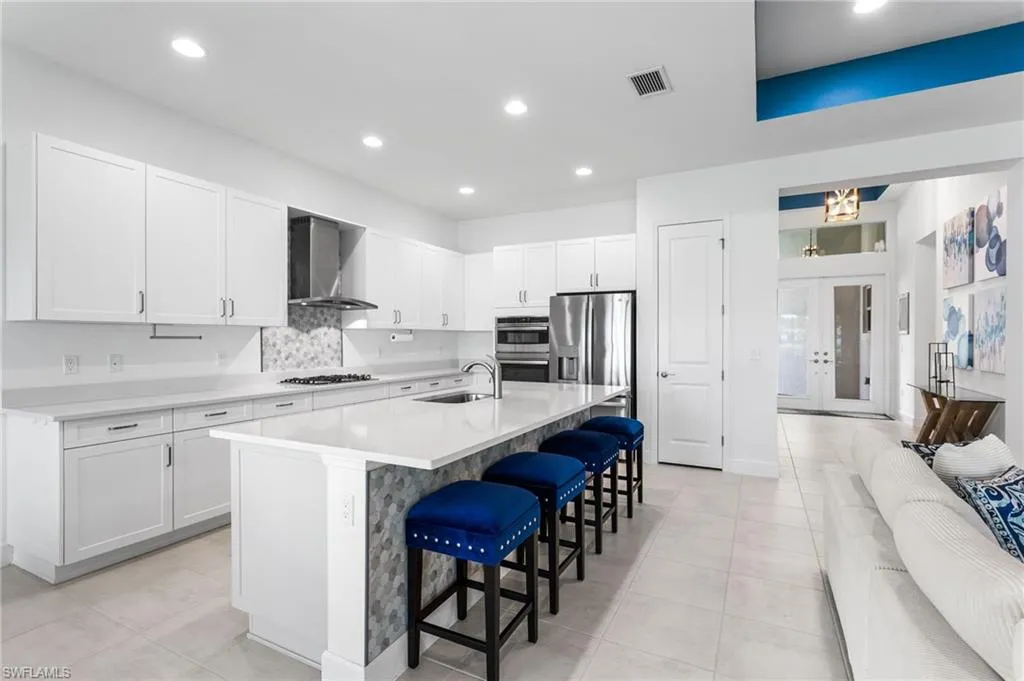 Nestled in the vibrant 55+ gated luxury enclave of Valencia Trails in Naples, this like-new GL Homes Nautilus (2022) presents resort-style living with every modern comforts. Step through dual glass entry doors into a bright, open floor plan, accompanied by custom window treatments, recessed (hi-hat) lighting, and designer fans that keep the ambiance just right. The heart of the home, the chef’s kitchen, is equipped with stainless appliances, a wall oven, a natural-gas cooktop with vented hood, upgraded cabinetry, quartz surfaces, and a striking custom backsplash that extends to the island. A rare 2½-car garage includes a dedicated bay with epoxy flooring and a climate-controlled mini-split for added comfort.