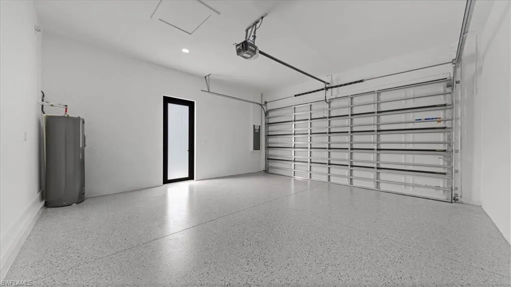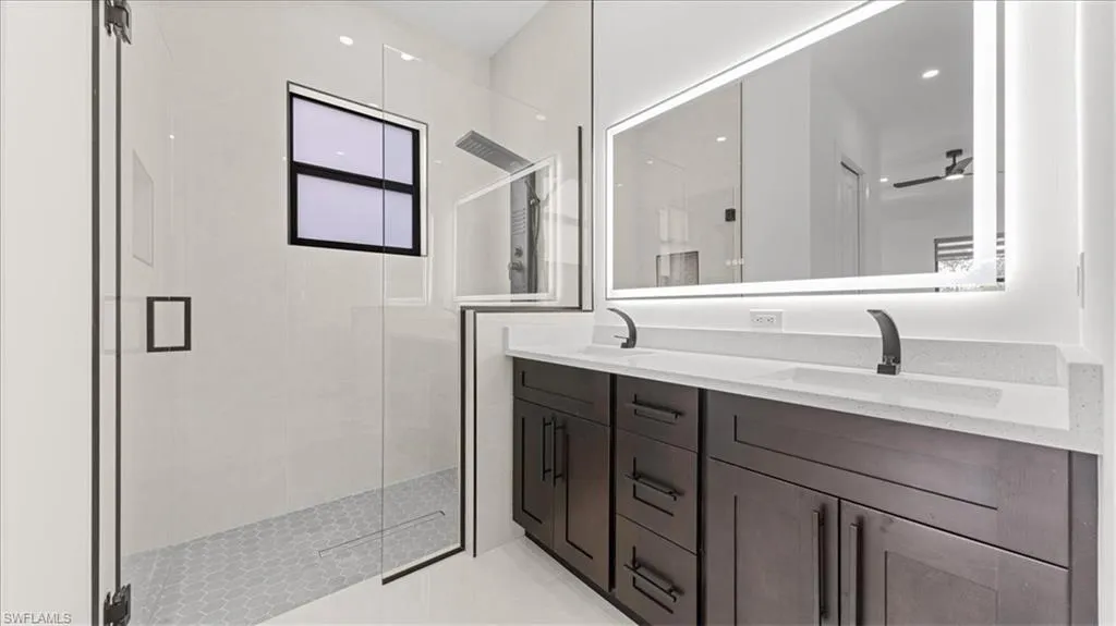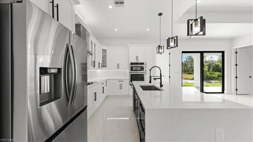 Modern light fixtures, ceiling fans in every room, and a sleek contemporary fireplace. The gourmet kitchen features a white quartz waterfall island, 42” wood cabinets with crown and light molding, stainless steel appliances, a cooktop, dual microwave/oven, and a stylish hood. A fully equipped outdoor kitchen extends the living space—perfect for Florida entertaining.