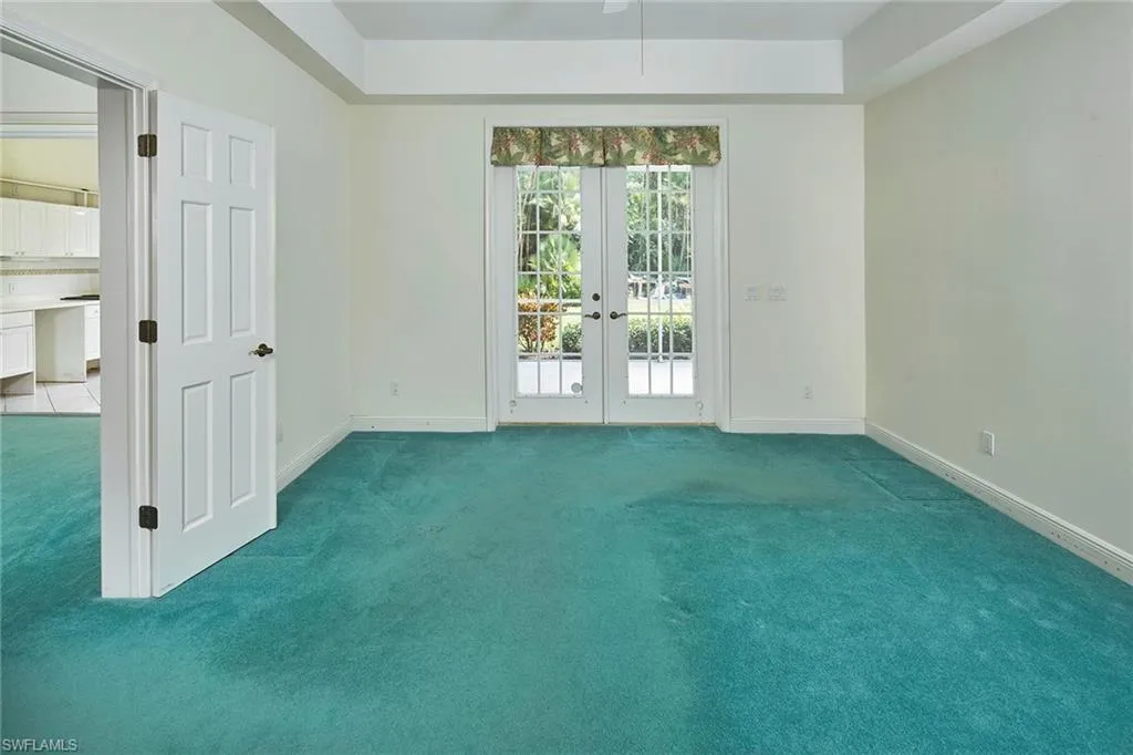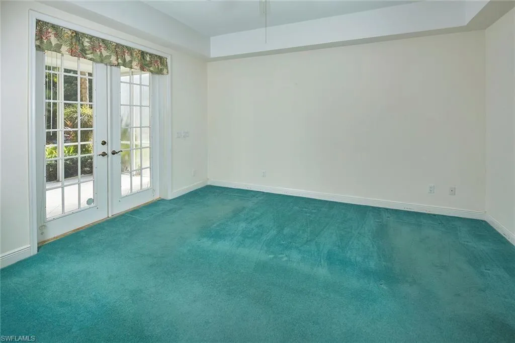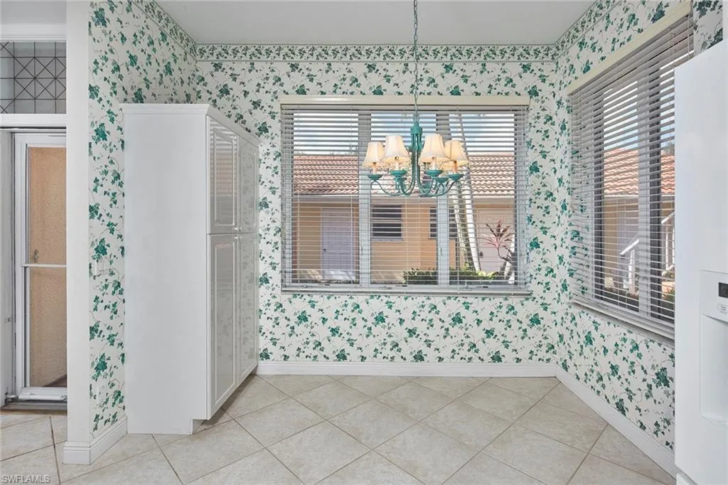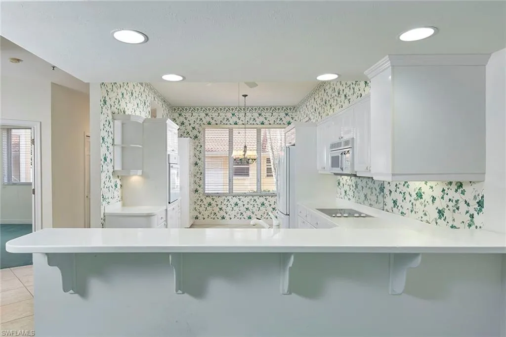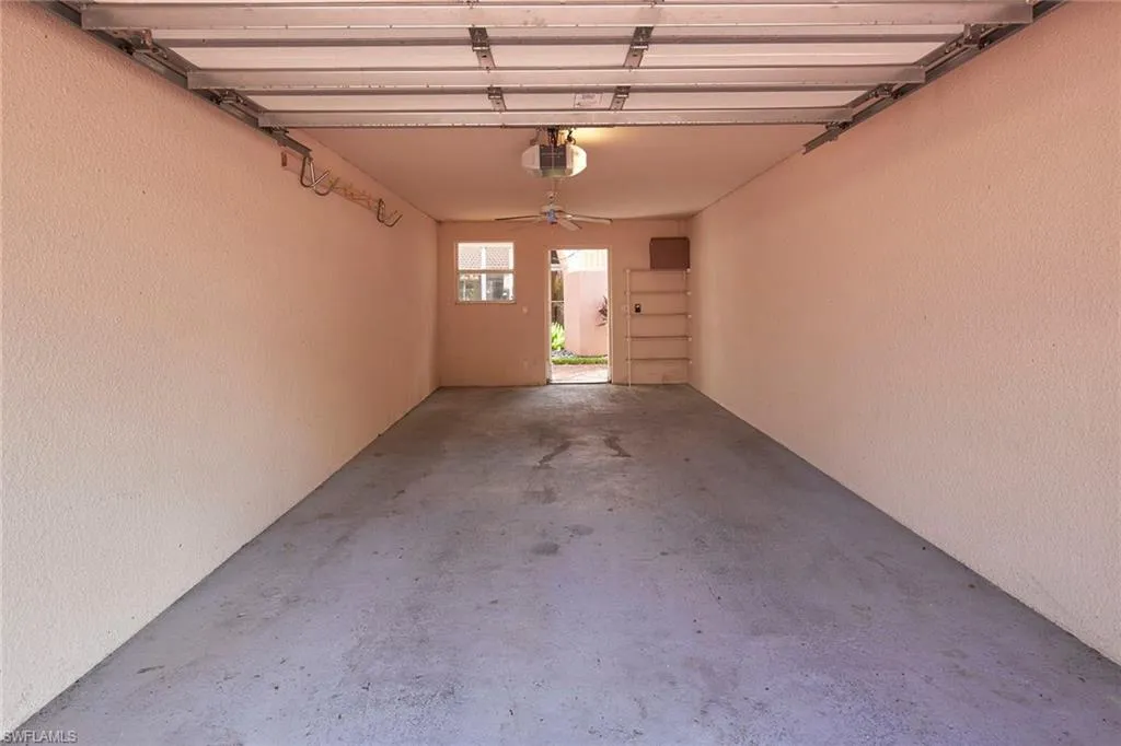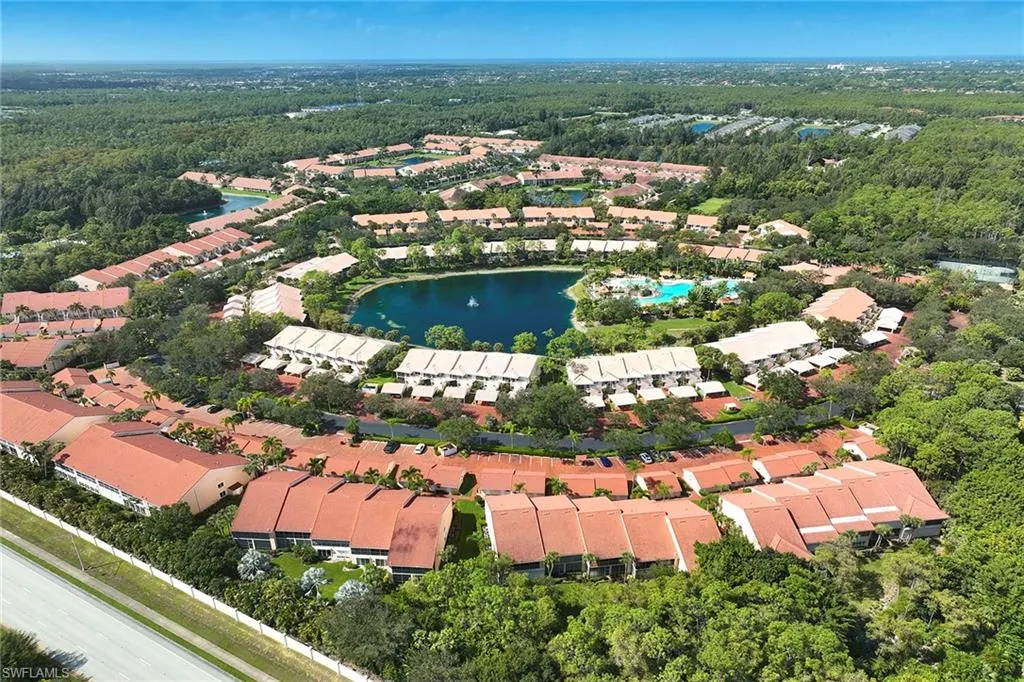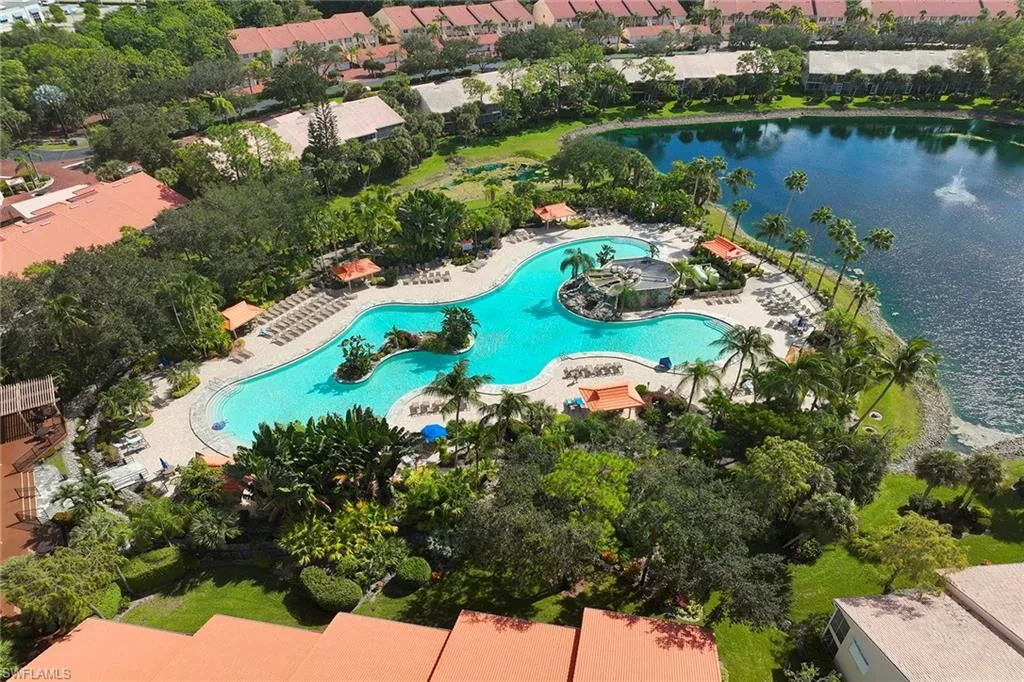 This spacious two-bedroom, two-bath first-floor residence is conveniently a short distance to the clubhouse, community pool and entertaining area. Featuring an open living concept with 10-foot ceilings, a 14-by-32-foot great room and split bedroom floor plan to ensure privacy. Sliding glass doors 9 feet wide open onto the 11-by-30-foot screened lanai with outdoor kitchen and private, wooded and tropical landscaped setting with a bubbling rock waterfall. The kitchen has many sunny windows in the eating area and offers under-cabinet lighting, custom pullouts, a pantry and breakfast bar. Primary bedroom has a tray ceiling, French doors opening to the lanai, bath area featuring large walk-in closet with wood shelving, double vanities, walk-in shower, jetted tub and separate water closet area. Laundry room has full-size washer and dryer, cabinets, shelving and laundry tub. Air conditioner and water heater were replaced 9/2025. Electric shutters plus a detached one-car garage. This amenity-rich development offers tennis, bocce ball, putting green, shuffleboard, clubhouse with kitchen and one of the largest outdoor swimming pools in Southwest Florida (11,000 square feet) with waterfall. Just minutes from shopping, restaurants, medical facilities, the 5h Avenue South/3rd Street district, and beautiful Gulf beaches.