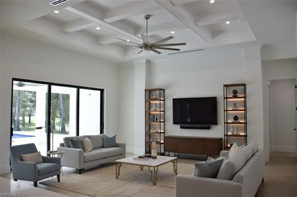 Step into modern coastal elegance with this newly built 4-bedroom + den, 3-bath pool home with over 2,800 sqft of living space and 3-car garage perfectly situated on a private 2.5 acre lot in Golden Gate Estates. This home features an open-concept layout, high coffered ceilings, and contemporary finishes throughout. The gourmet kitchen boasts European-style cabinetry, quartz waterfall island, stainless steel appliances, double ovens, and modern pendant lighting. The spacious living area seamlessly connects to the outdoor oasis, where sliding glass doors open to a covered lanai and sparkling salt pool with integrated spa and sun shelf overlooking lush tropical landscaping. Outdoor kitchen with gas grill, great for entertaining. Retreat to the primary suite featuring a spa-inspired bathroom with a freestanding soaking tub, oversized glass shower, and dual floating vanities. Enjoy the Florida lifestyle with indoor–outdoor flow, wood-look porcelain tile flooring, and energy-efficient impact windows and doors throughout. The home also includes a wine bar area, pantry, and spacious laundry room. Fully landscaped with paver driveway, fenced yard and aluminum automatic front gate, ready to move in! Located minutes from Collier Blvd, top-rated schools, shopping, and the beautiful Gulf beaches — this home blends modern design, privacy, and convenience in one perfect Naples address.
