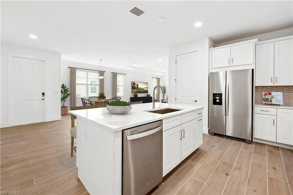 Welcome to the beautiful Khaya floor plan—offering 1,801 square feet of thoughtfully designed living space, including 3 spacious bedrooms, 2 full bathrooms, and a 2-car garage. This stunning new construction home perfectly blends comfort, elegance, and the Florida lifestyle you’ve been dreaming of. Step outside to enjoy true Florida outdoor living with a western exposed covered lanai overlooking a lushly landscaped yard—the perfect setting to take in vibrant sunsets. There’s even plenty of room to add a custom pool after closing, creating your own private backyard oasis. Inside, the heart of the home is a state-of-the-art chef’s kitchen, featuring sleek quartz countertops, ample wood cabinetry, premium stainless steel appliances, and a natural gas cooktop for premier cooking. Whether you’re preparing a quiet meal or hosting guests, this kitchen was made for entertaining. The private primary suite offers a peaceful retreat with a spa-like en suite bathroom, complete with a luxe walk-in shower and an oversized walk-in closet. Two generously sized guest bedrooms share a stylish full bathroom, ideal for family or visitors. Just steps away from the Seven Shores resort-style amenity center, residents enjoy exclusive access to a luxurious clubhouse, sparkling pool, fitness center, putting green, and a dedicated lifestyle director who curates events and activities year-round. This home includes impact-resistant glass windows and doors, is built to the highest builder standards, and comes with the peace of mind of a full builder warranty. Be sure to ask the sales consultant about limited-time rate buydown incentives. Interior design selections and the full floor plan are available in MLS supplements—don’t miss your chance to own this piece of paradise! Lot 14.