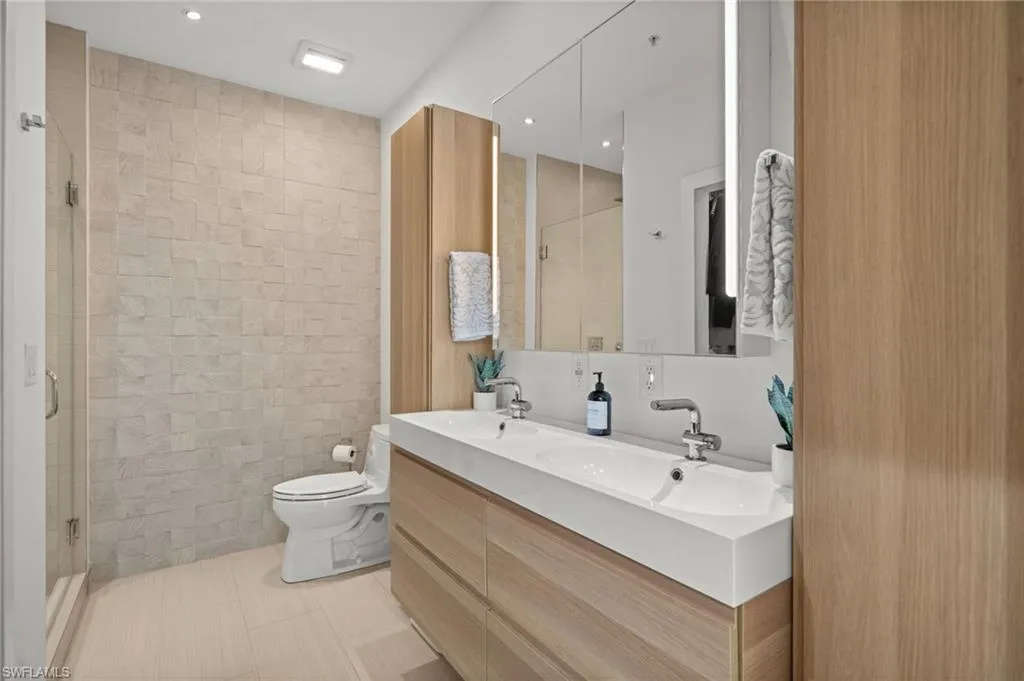 Inside, you’ll find custom wide-plank engineered wood flooring, sleek floating vanities, quartz countertops, and Bosch appliances – including an induction cooktop and hooded vent. The kitchen’s hands-free faucet, soft-close cabinetry, and auto light-up drawers add both convenience and sophistication. Every detail has been carefully curated to make daily living feel elevated. The condo also comes with a new air conditioning system, ensuring peace of mind for years to come.