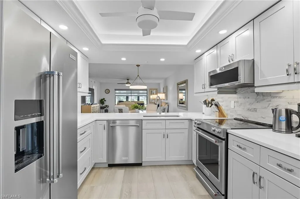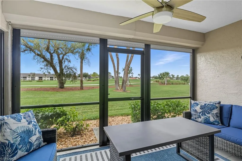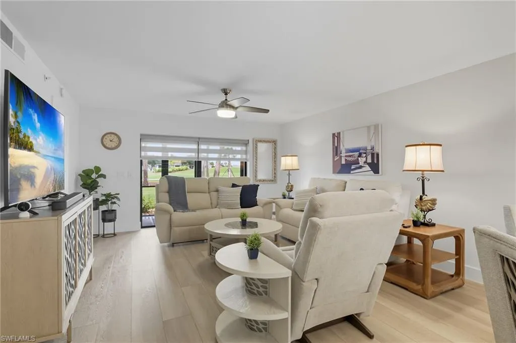 Welcome to this totally renovated 2 bedroom 2 bath condo in the Kelly Greens gated golf course community. No detail was overlooked in this MOVE IN ready TURN KEY unit. What you see is what you get! All decor, pictures, accessories, blinds, furniture, linens, dishes are provided for a seamless move! There are no steps and no carpet! Ceiling fans with remote in every room. Light and airy decor with anything that you could possibly need to enjoy the beaches and sunny southwest Florida!